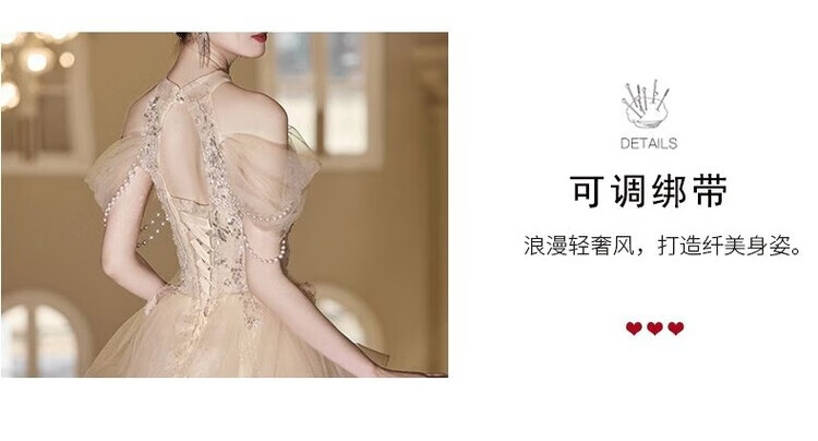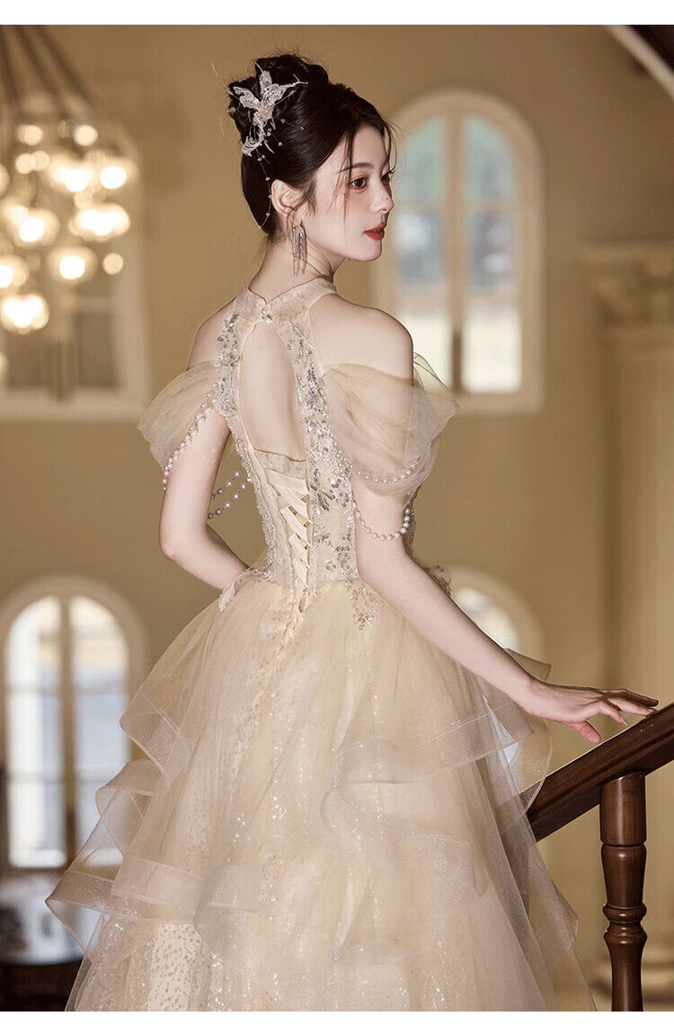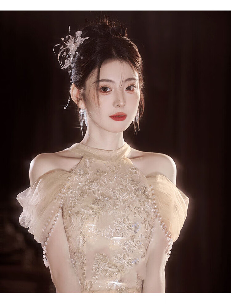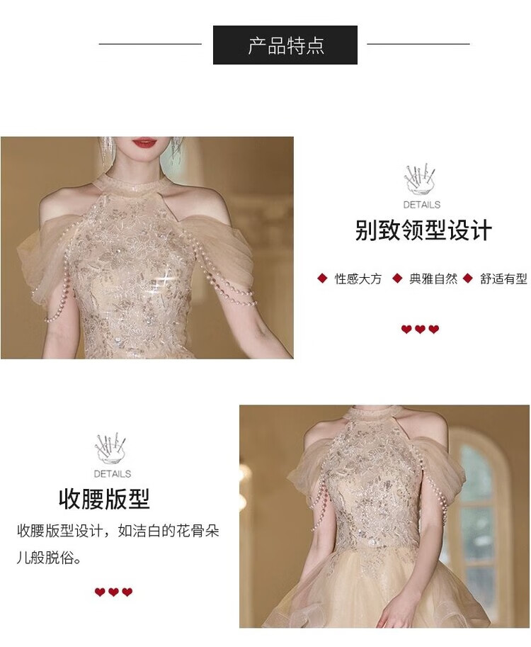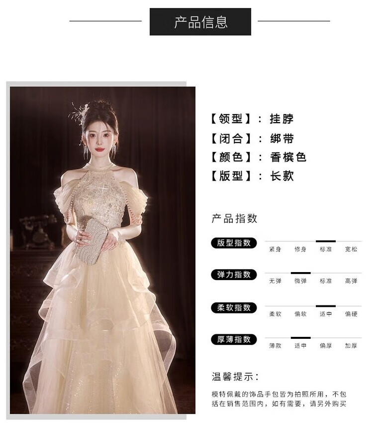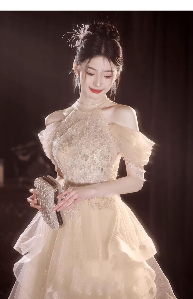 Champagne halterneck tassel evening dress for host adult ceremony, light wedding dress, high-end dressing gown, female bride's toast dress, engagement dress, champagne color XS