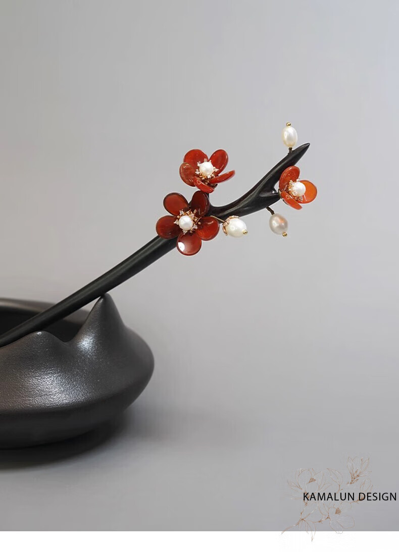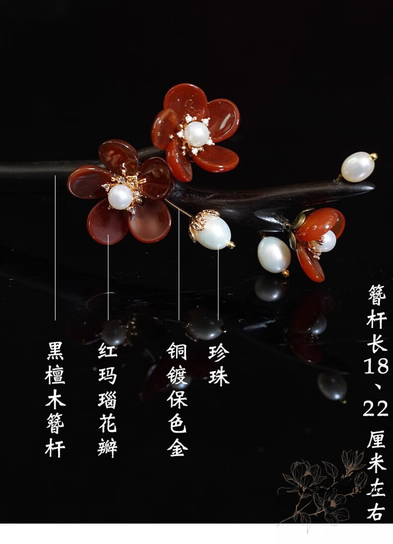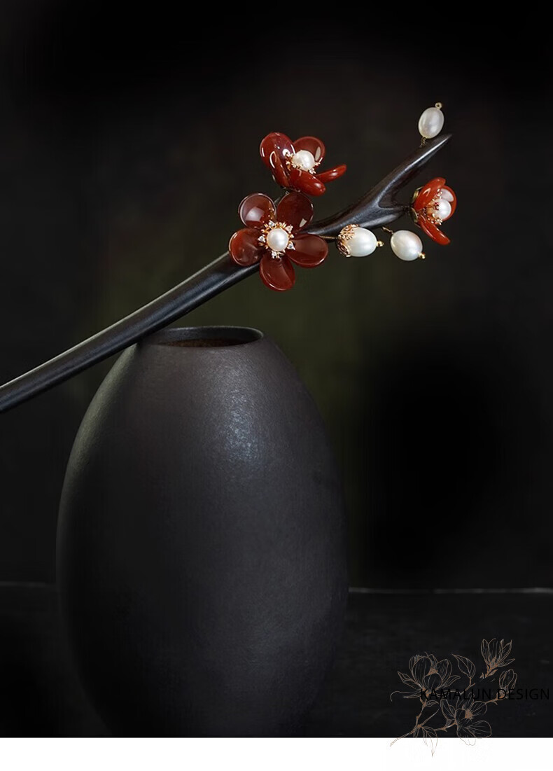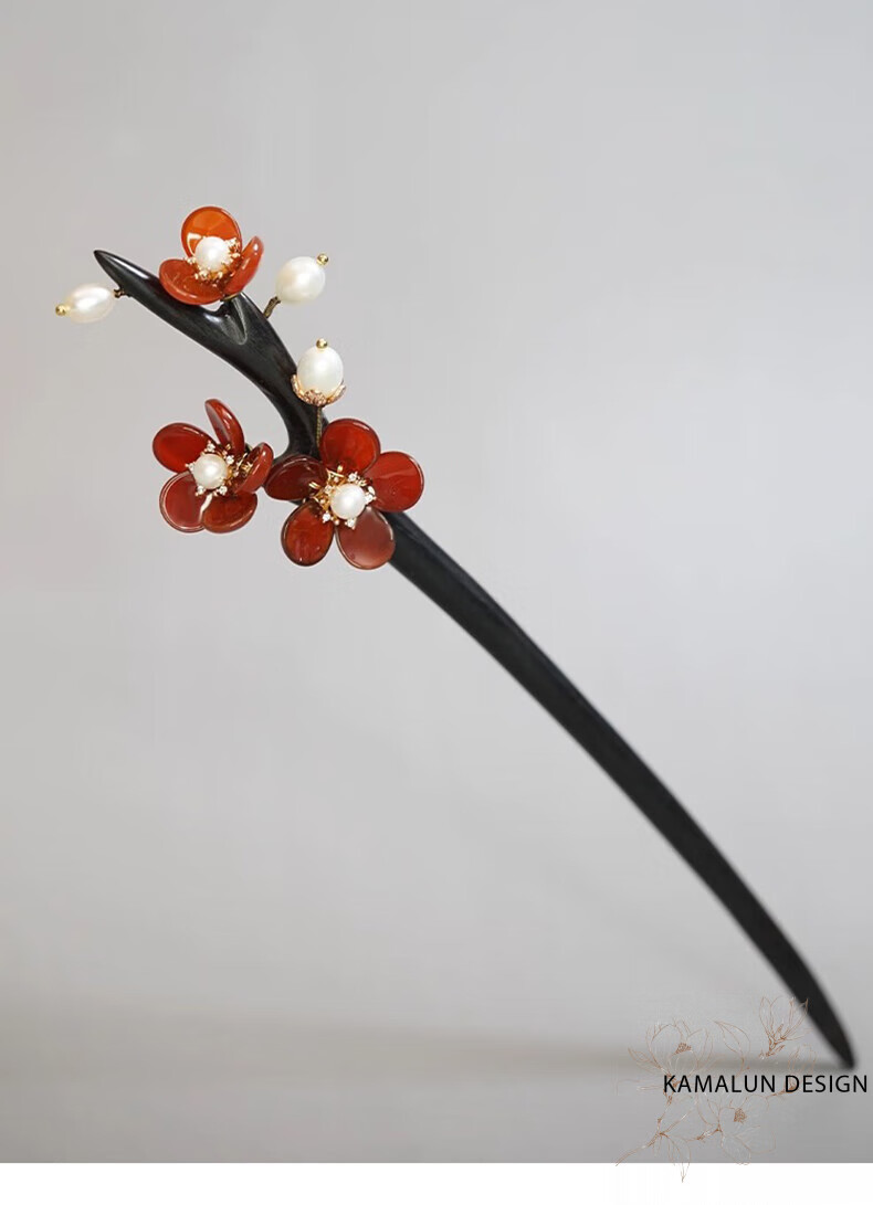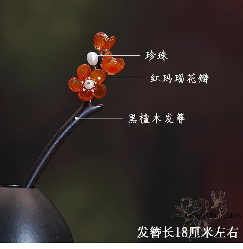Kamalun (KAMALUN) red agate plum hairpin black sandalwood hairpin handmade Hanfu headwear high-end daily wear new Chinese style hairpin red agate plum blossom A style pole length 18 cm