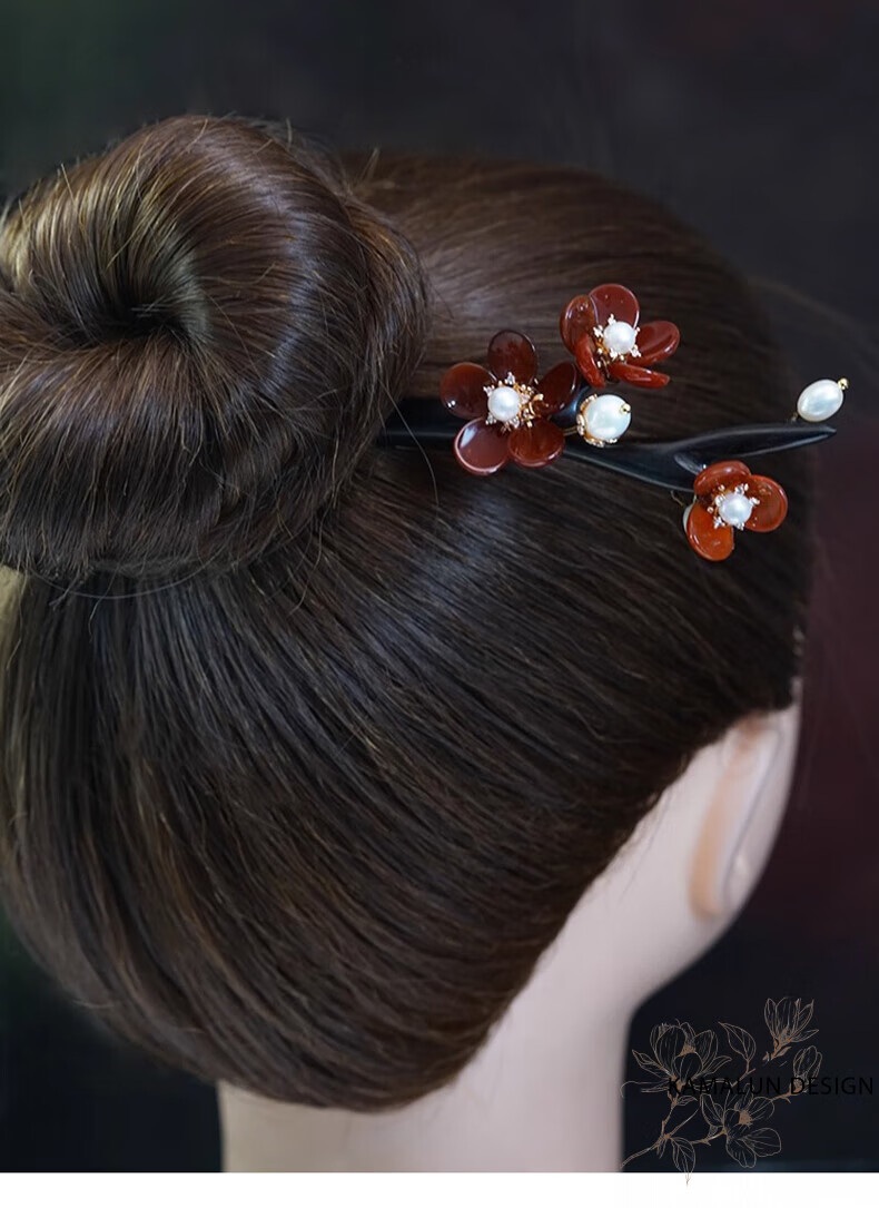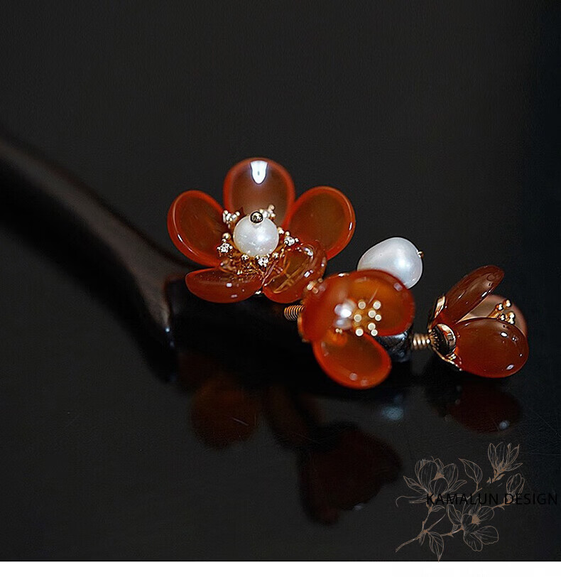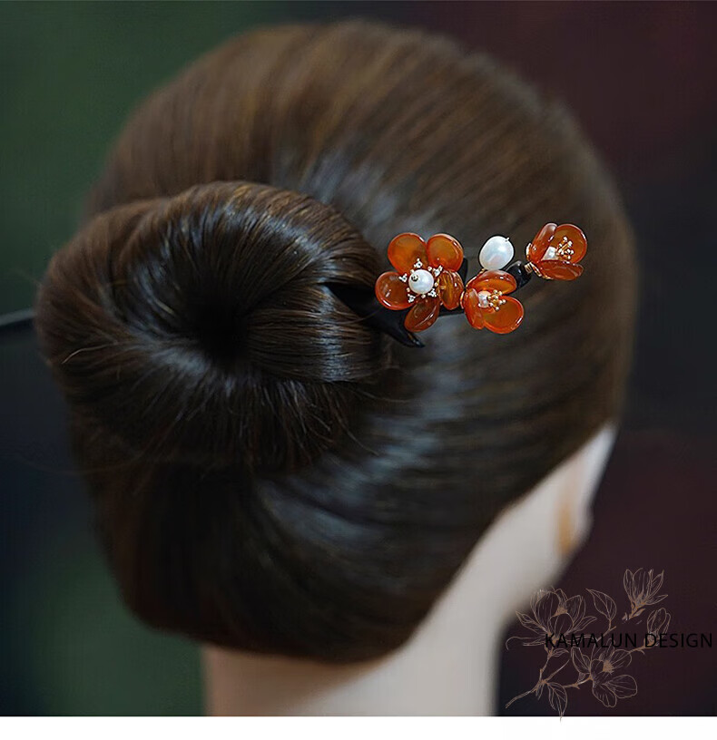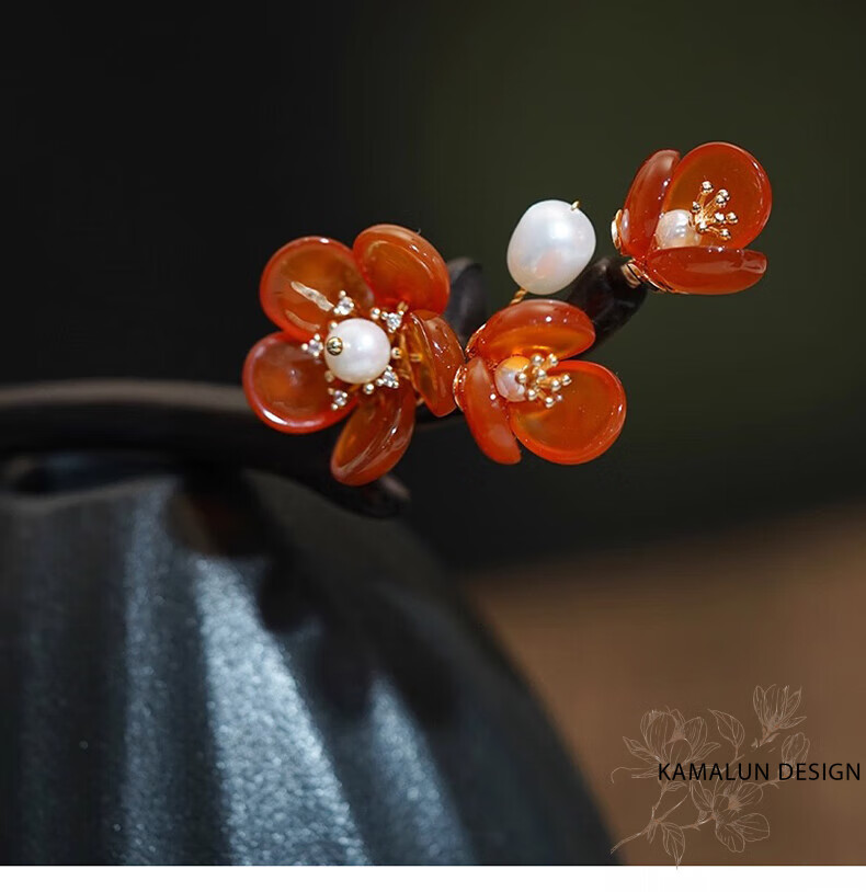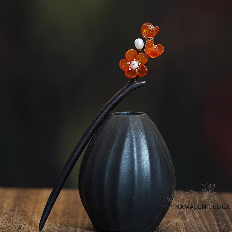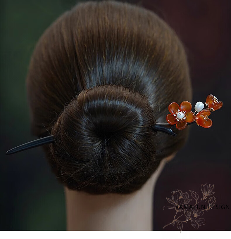 Kamalun (KAMALUN) red agate plum hairpin black sandalwood hairpin handmade Hanfu headwear high-end daily wear new Chinese style hairpin red agate plum blossom A style pole length 18 cm
