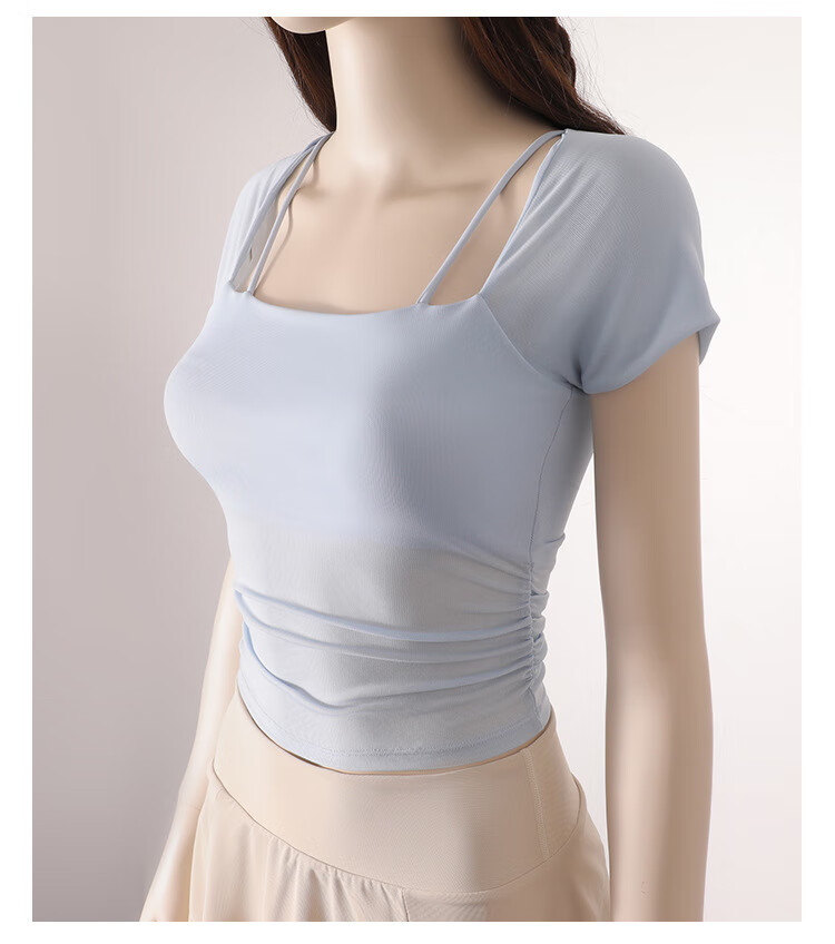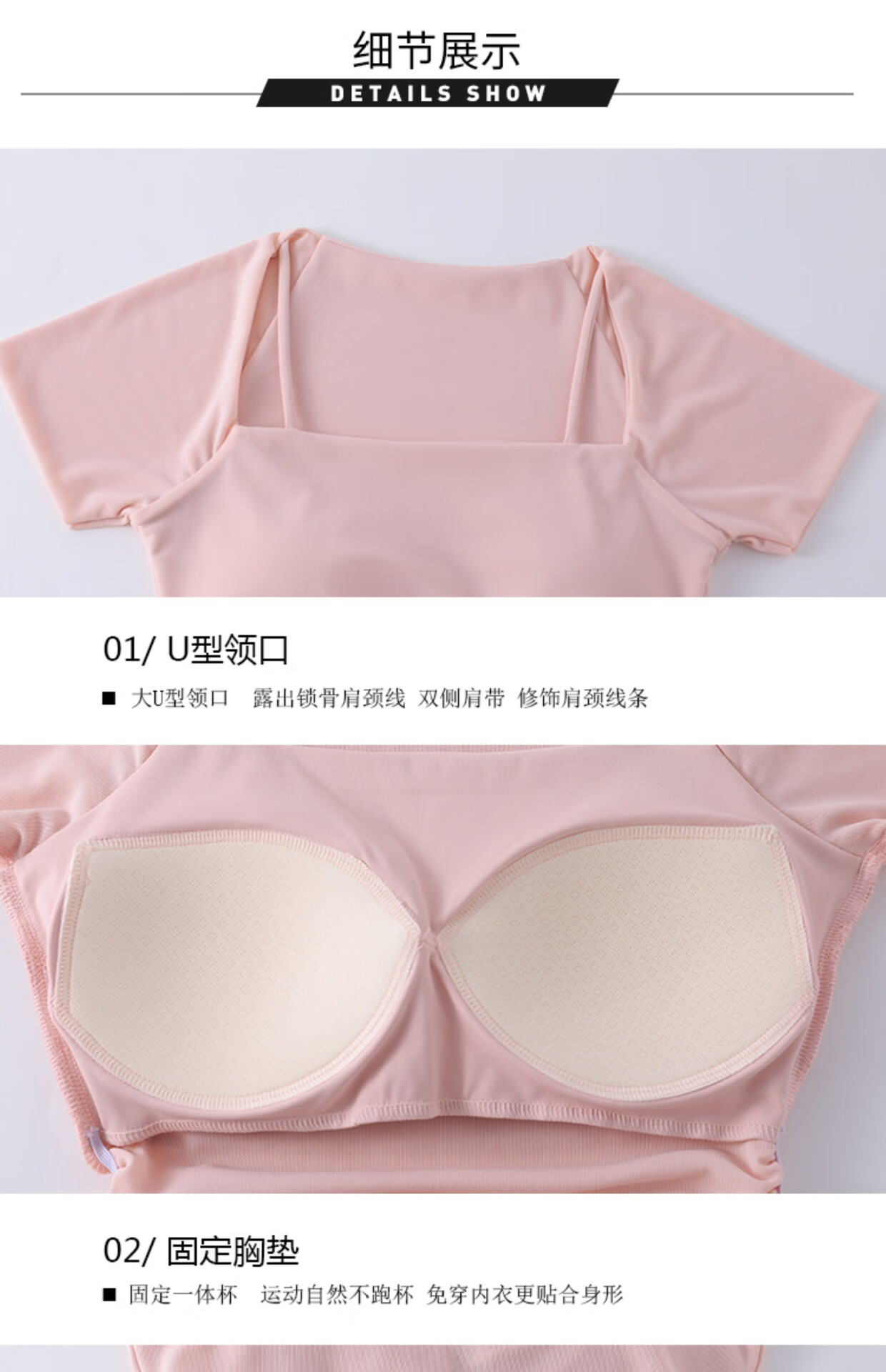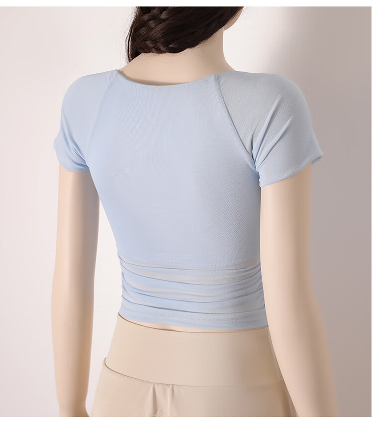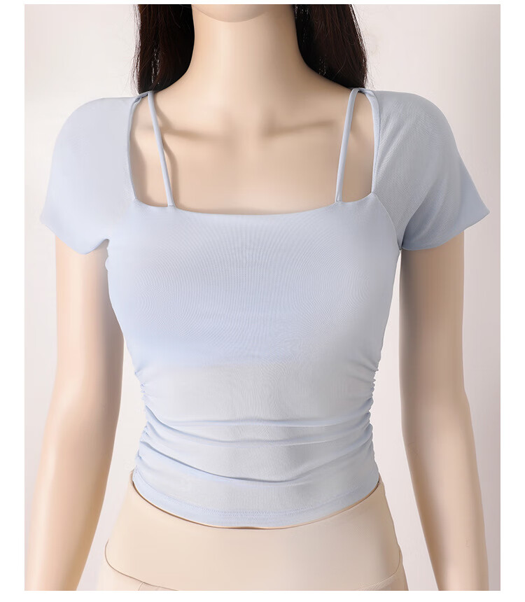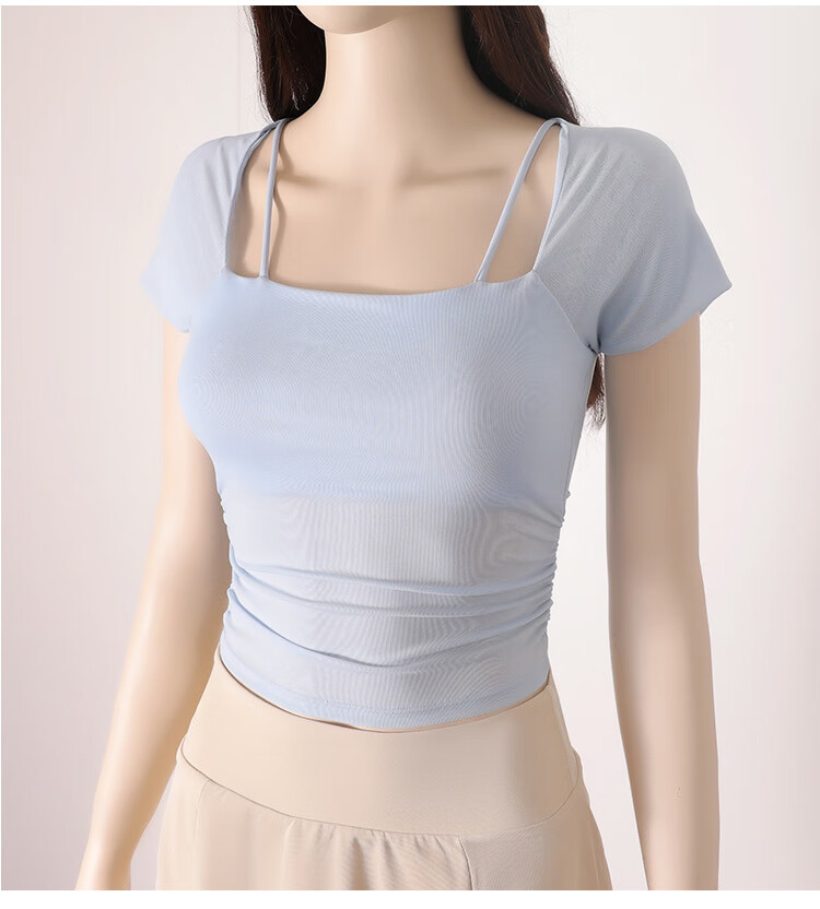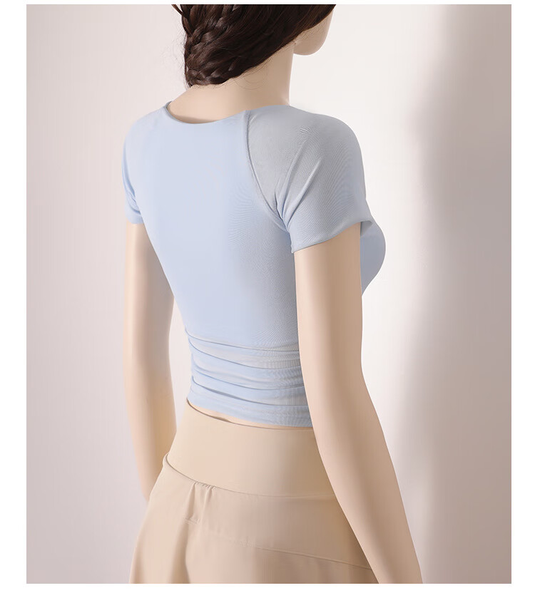 LULUUVTTOH shock-proof yoga clothes with chest pads for women, summer sports short-sleeved T-shirt tops, slimming Pilates training clothes, light blue M