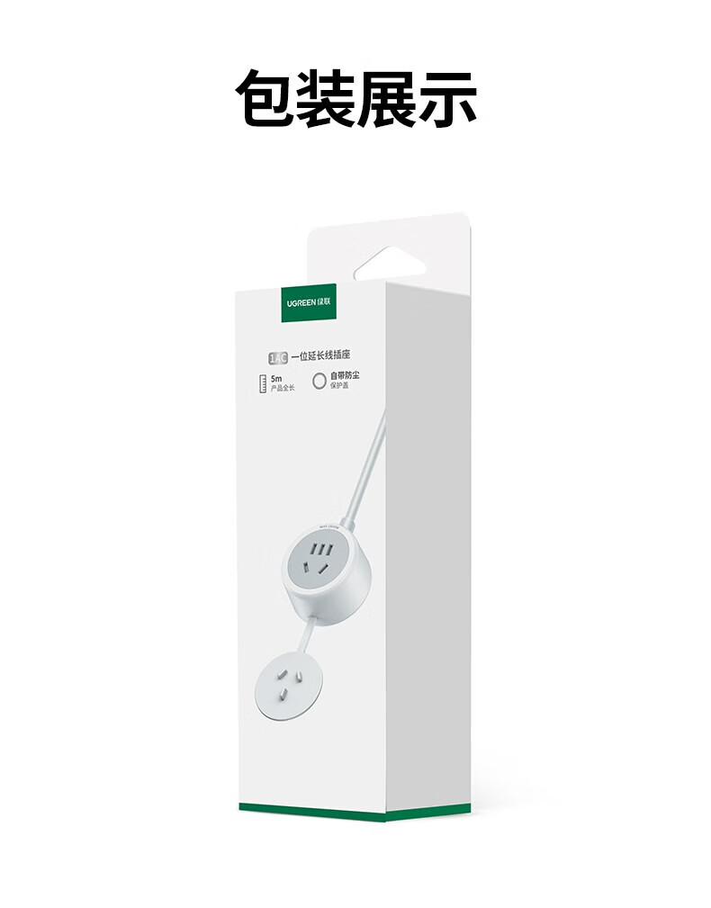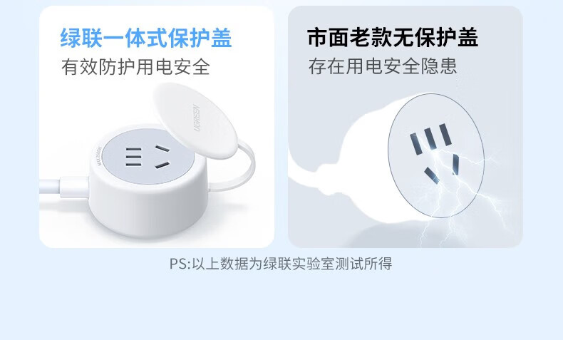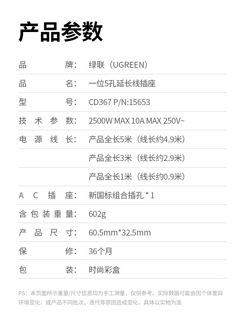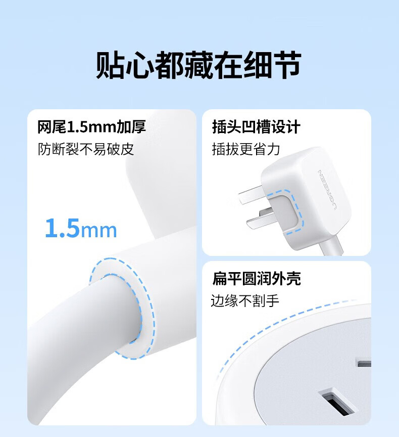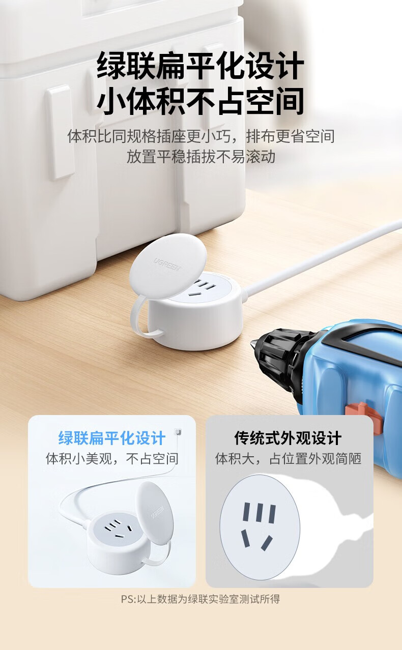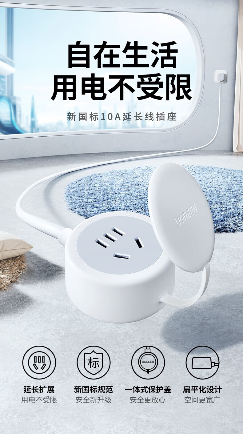 UGREEN power socket extension cord/socket strip/multi-functional mini power strip/wiring board/pull cord board/dormitory strip electric vehicle charging three-hole with dust cover short and space-saving total length 0.6 meters 10A