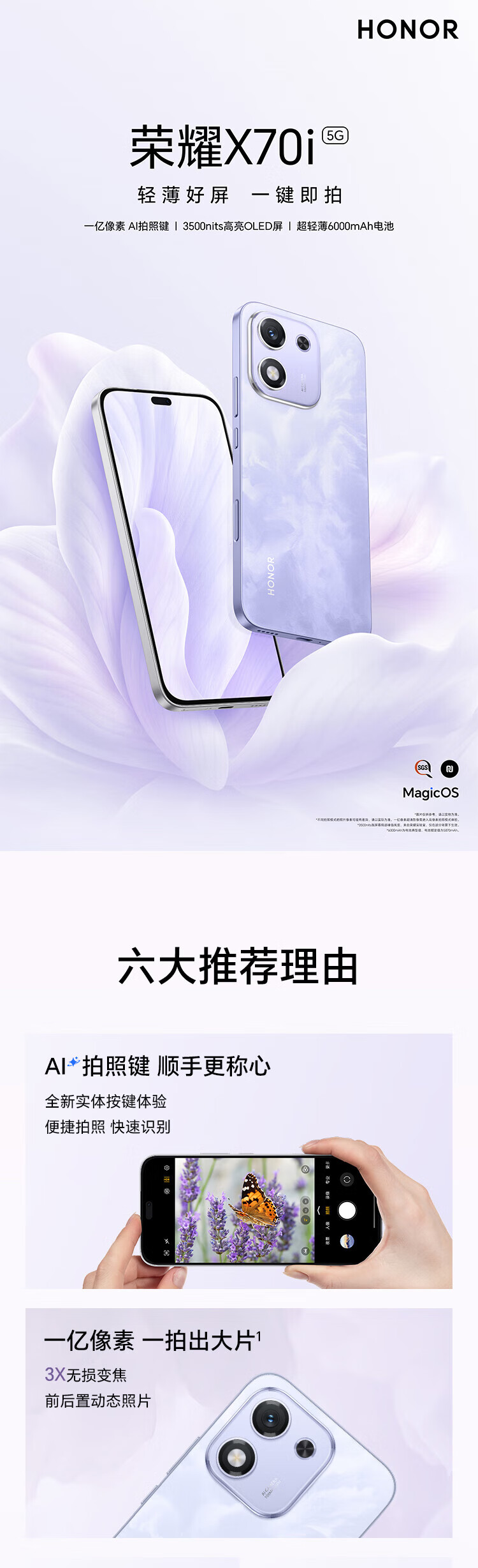 Honor 5G new product X70i 2025 new machine launched 100 million pixel AI camera key OLED eye protection large screen Honor