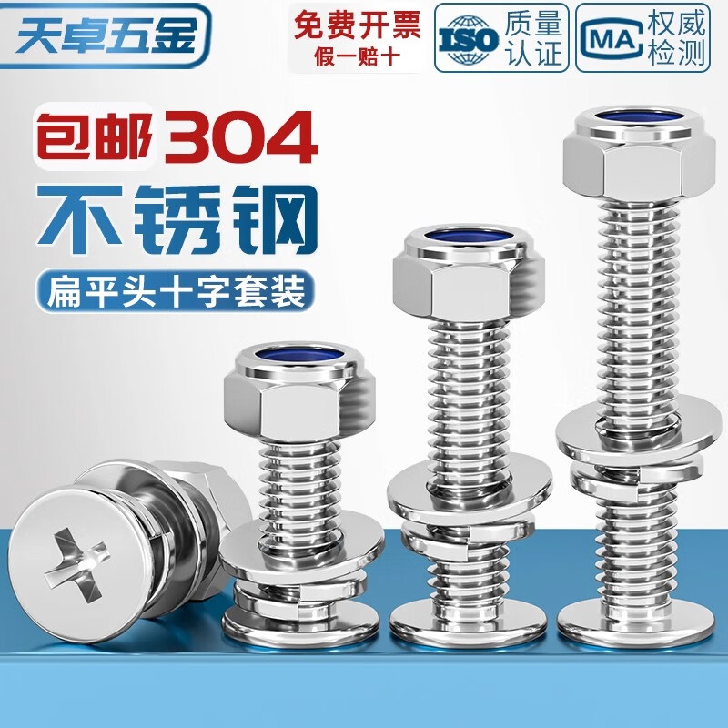 Tianzhuo Hardware 304 stainless steel cross flat head screw lock nut set complete flat head screw nut and gasket combination set M3*10 (head diameter 6)-20 sets