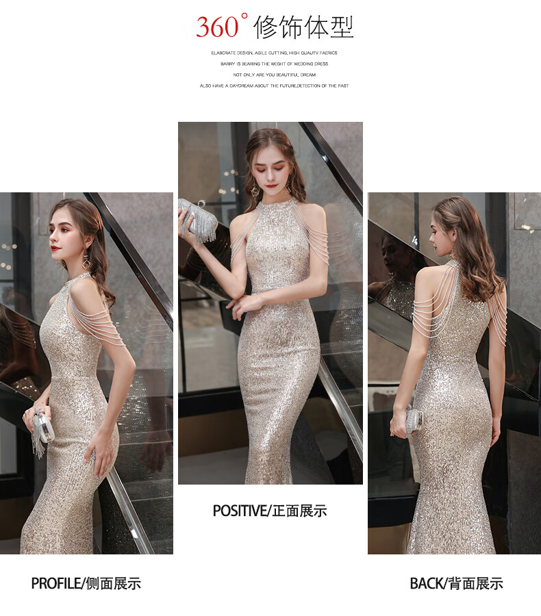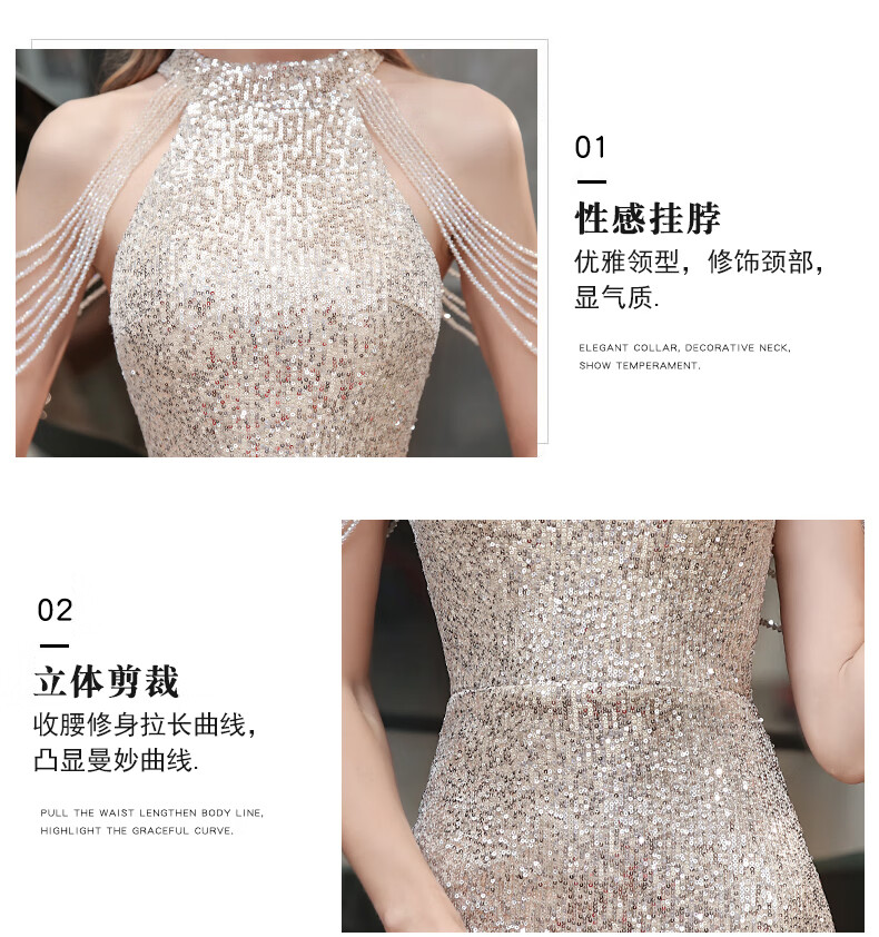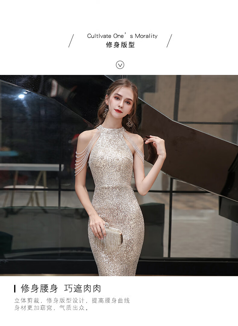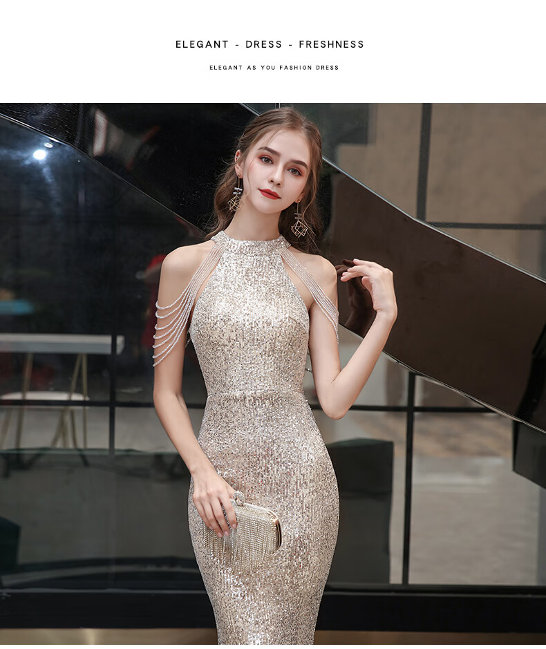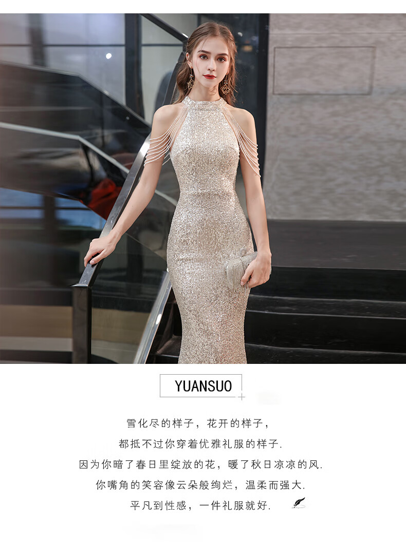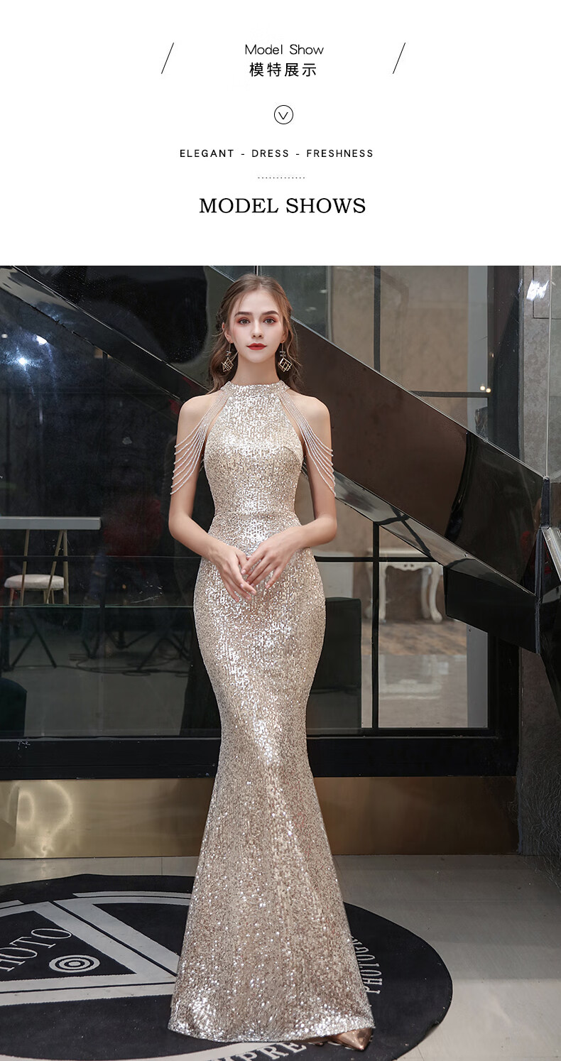Ancient Champions League evening dress for women, high-end banquet temperament, heavy industry fishtail long dress, light luxury niche high-end annual meeting host engagement, apricot M high-quality stretch version