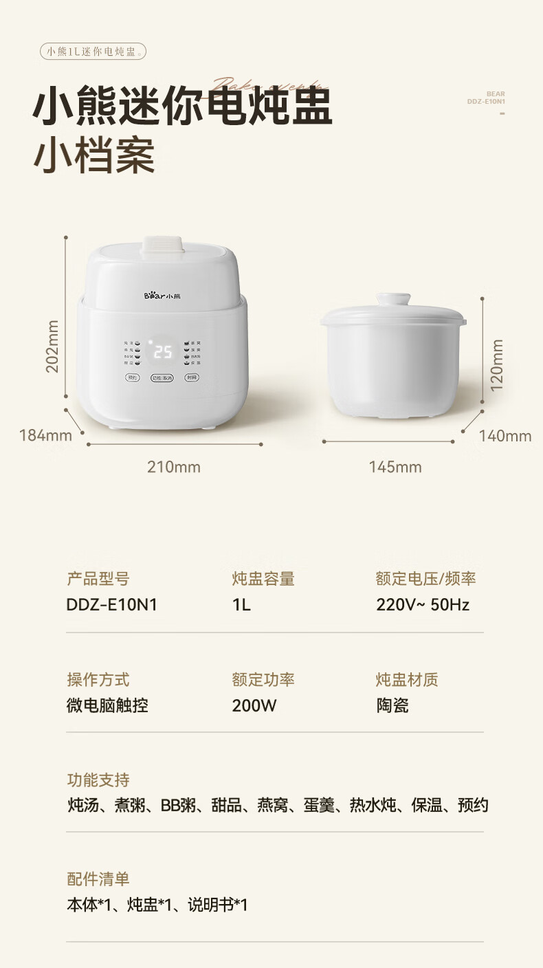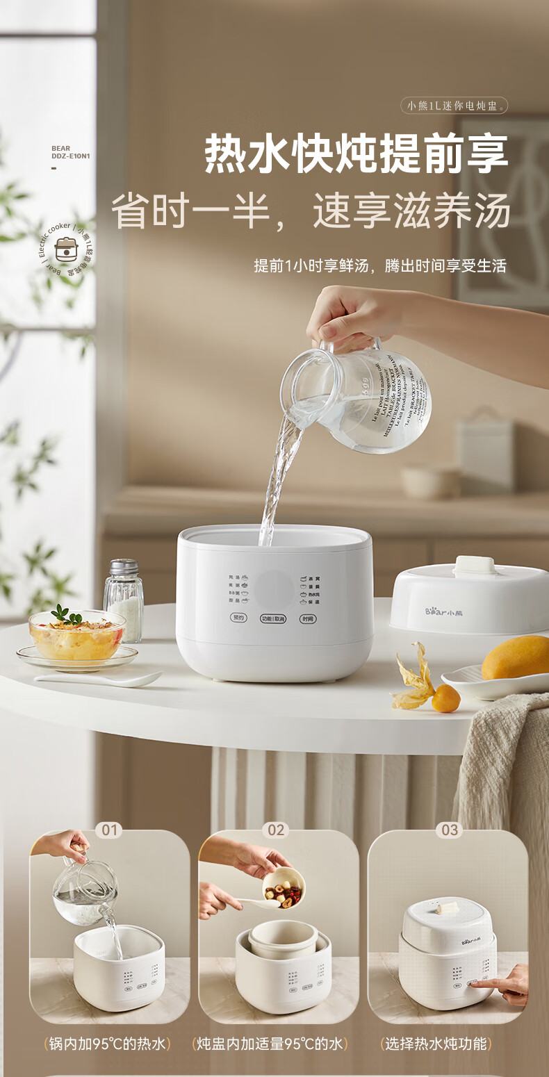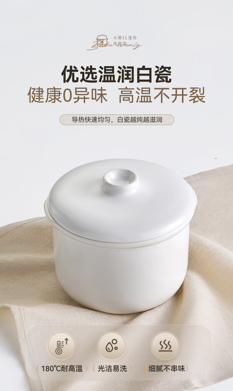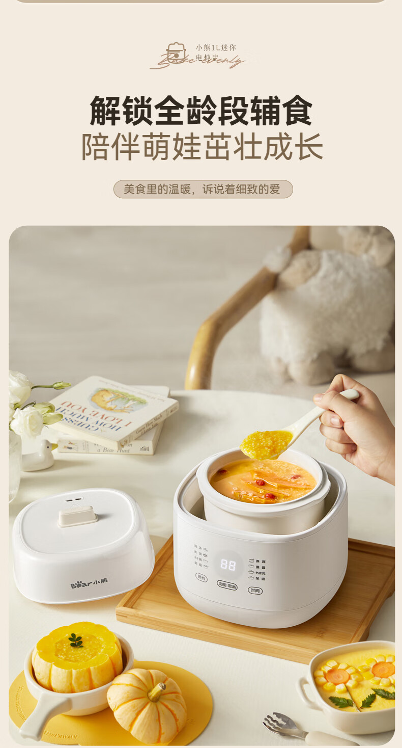 Bear electric stew pot, bird's nest stew pot, water-proof stew household soup pot, electric stew pot, small stew pot for 1-2 people, baby food supplement, small capacity, 1 liter, can be scheduled, kept warm, hot water for quick stewing, 1L, small capacity DDZ-E10N1 without lifting ring
