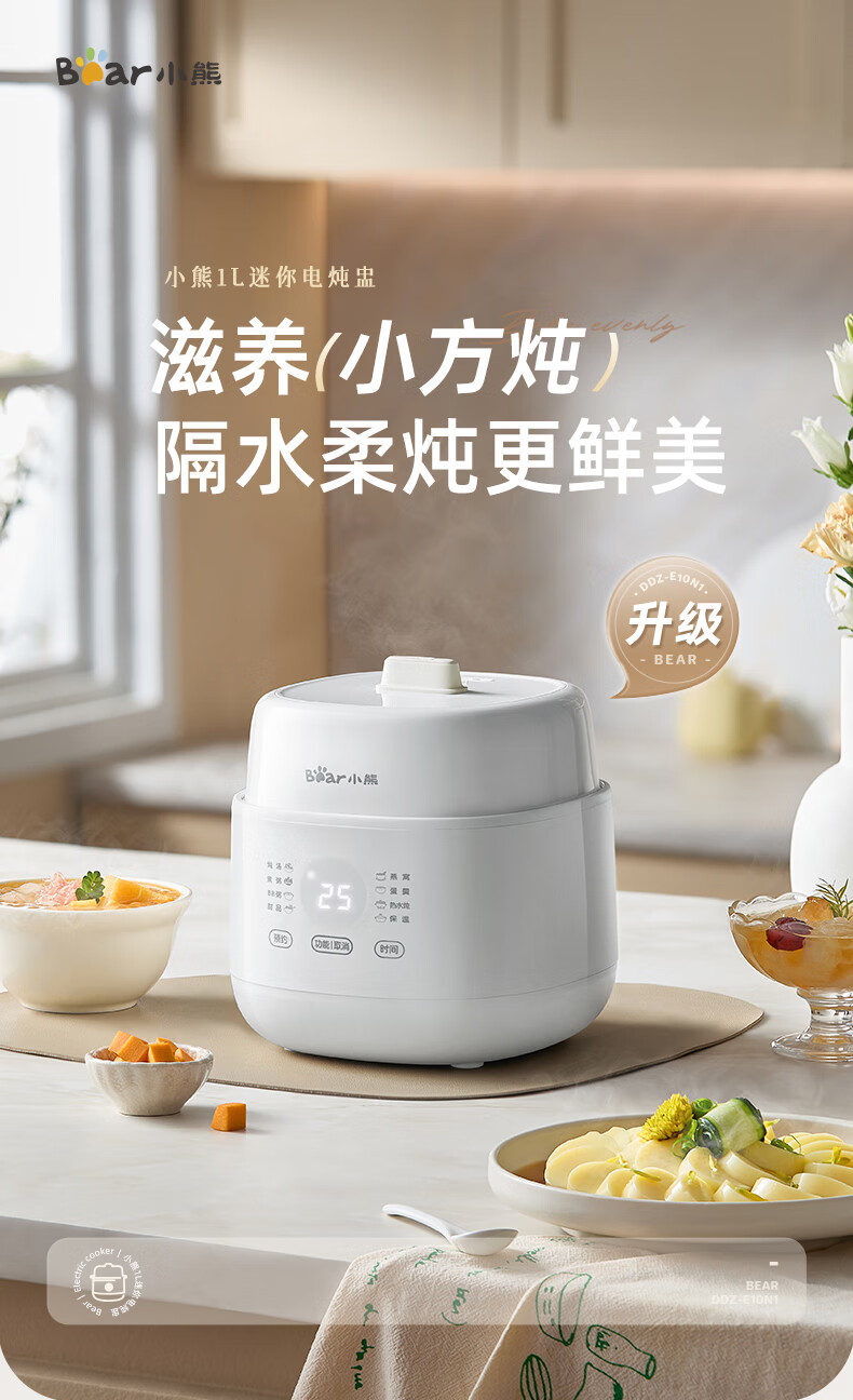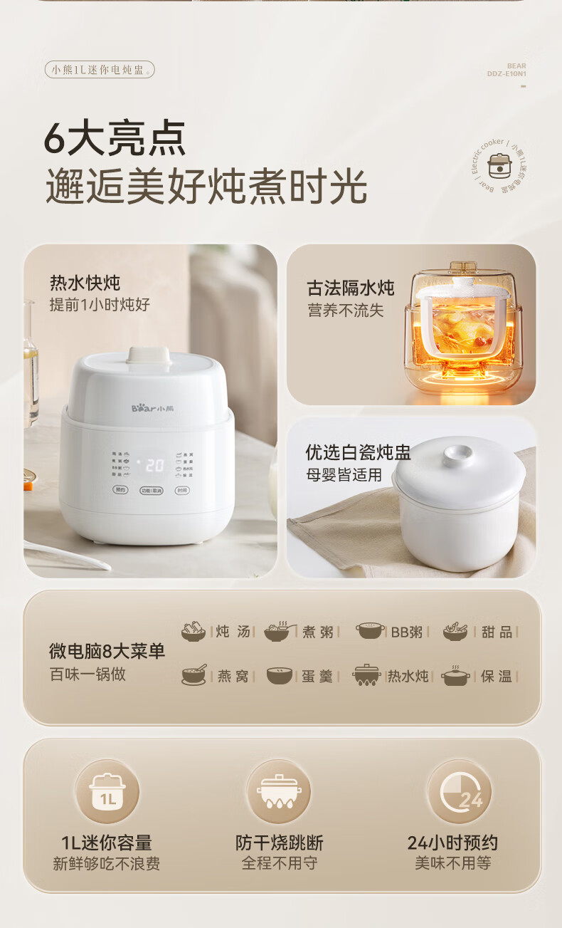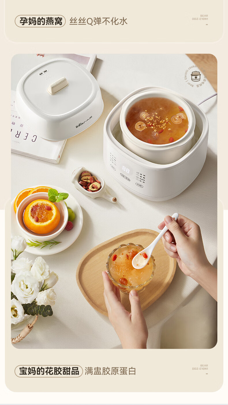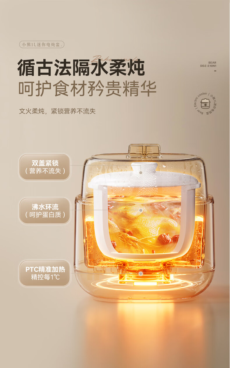 Bear electric stew pot, bird's nest stew pot, water-proof stew household soup pot, electric stew pot, small stew pot for 1-2 people, baby food supplement, small capacity, 1 liter, can be scheduled, kept warm, hot water for quick stewing, 1L, small capacity DDZ-E10N1 without lifting ring