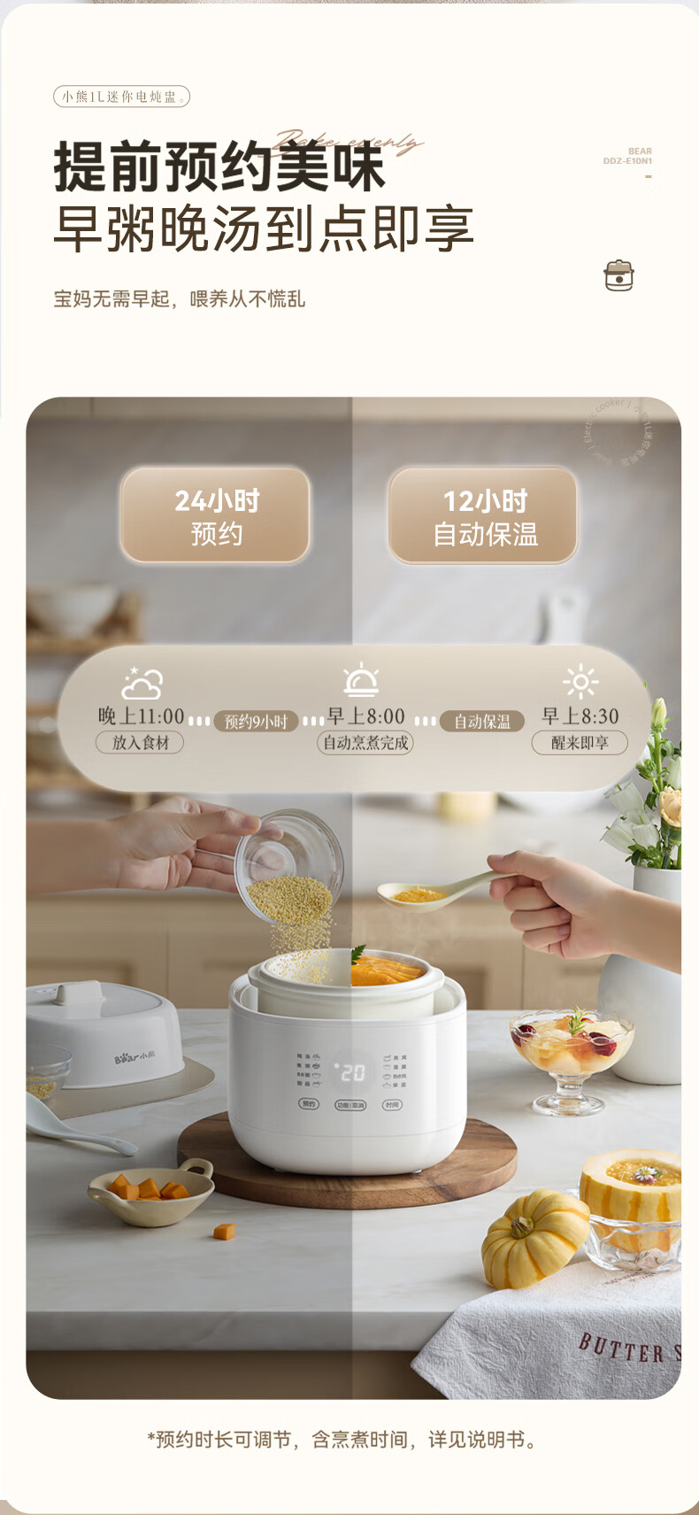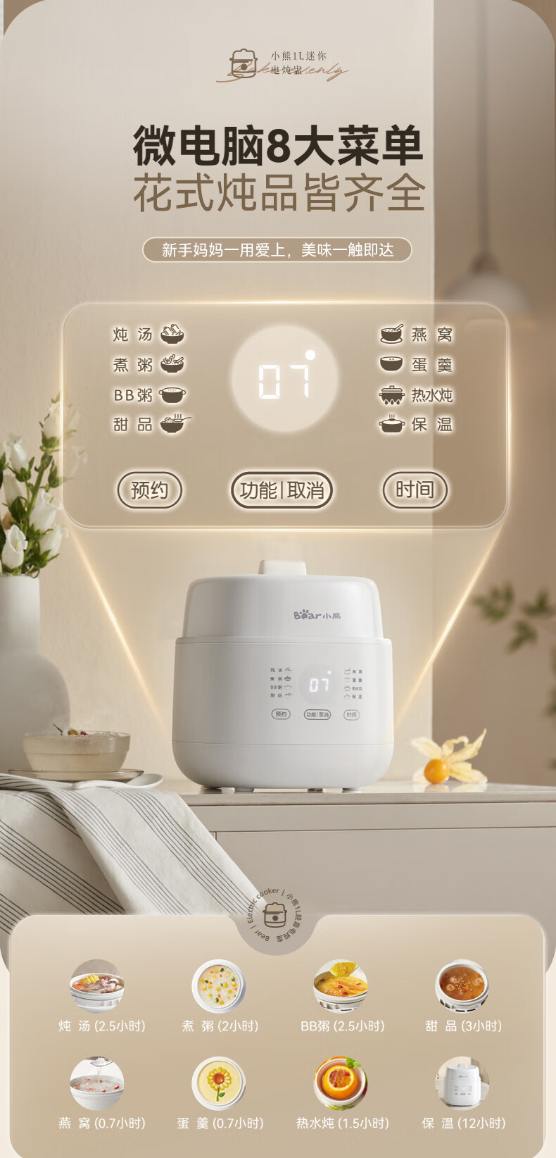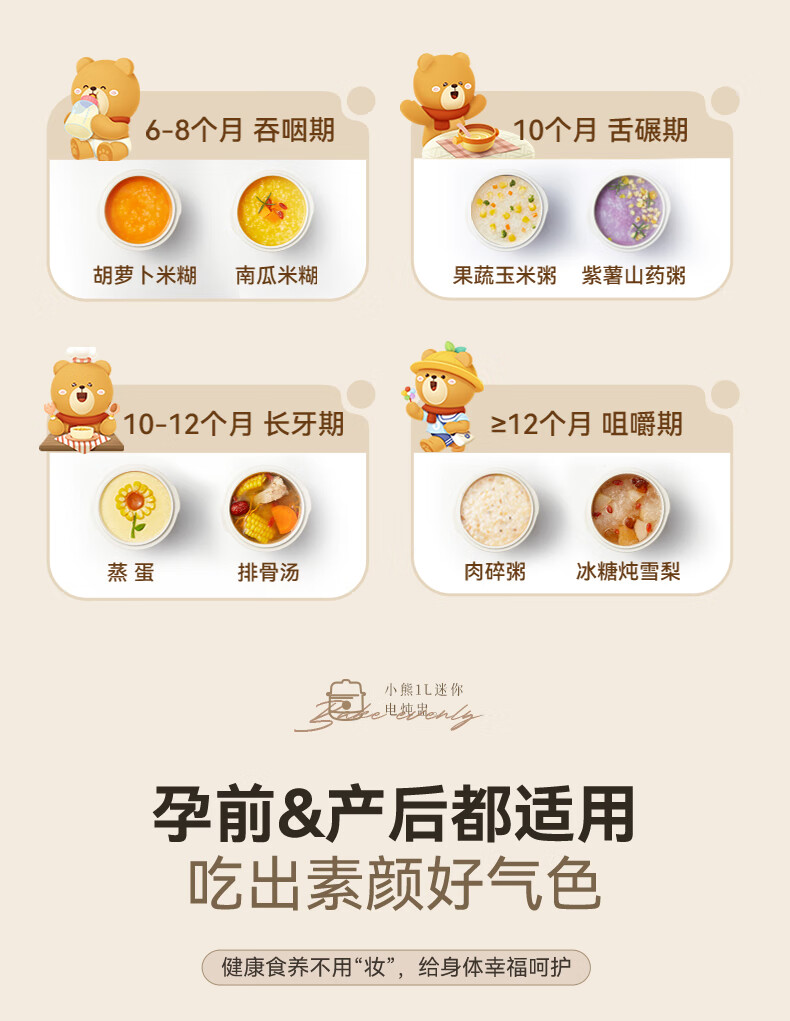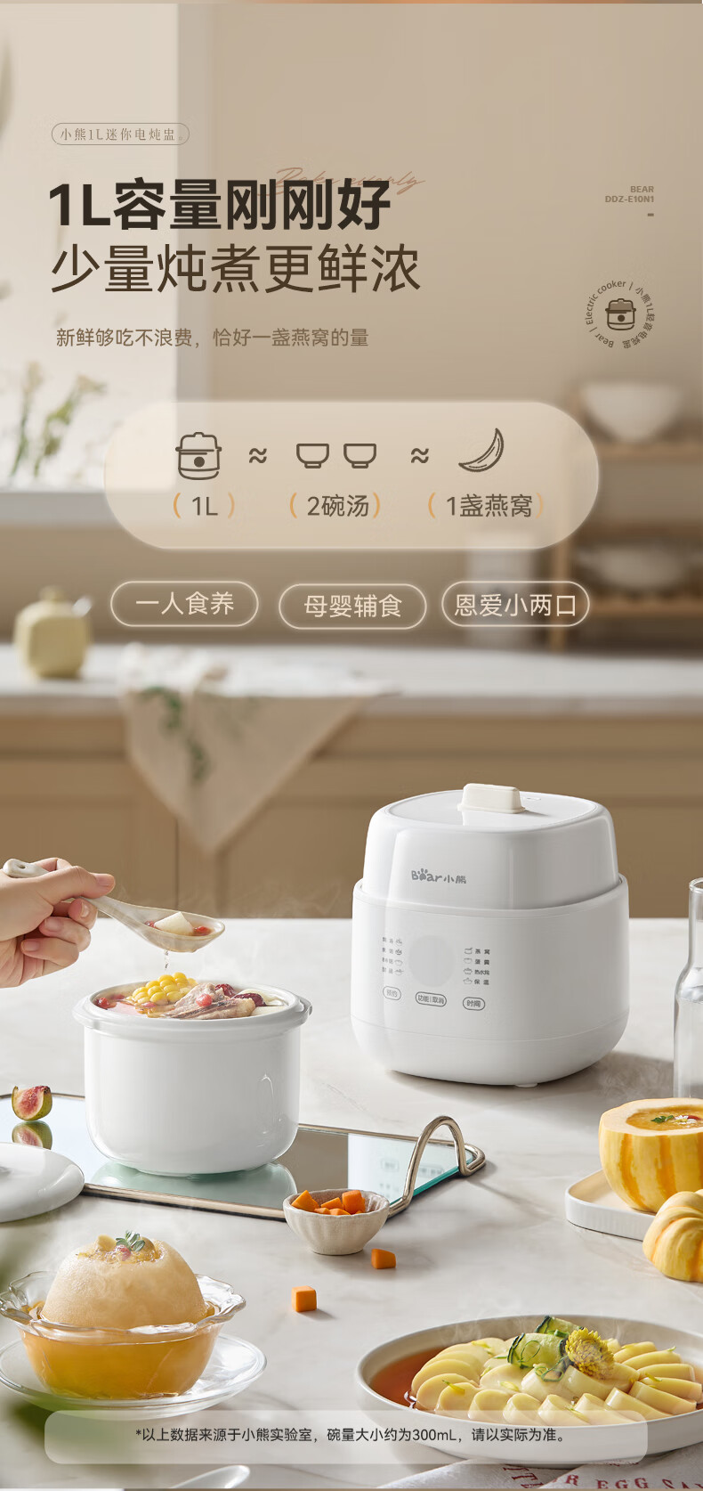 Bear electric stew pot, bird's nest stew pot, water-proof stew household soup pot, electric stew pot, small stew pot for 1-2 people, baby food supplement, small capacity, 1 liter, can be scheduled, kept warm, hot water for quick stewing, 1L, small capacity DDZ-E10N1 without lifting ring