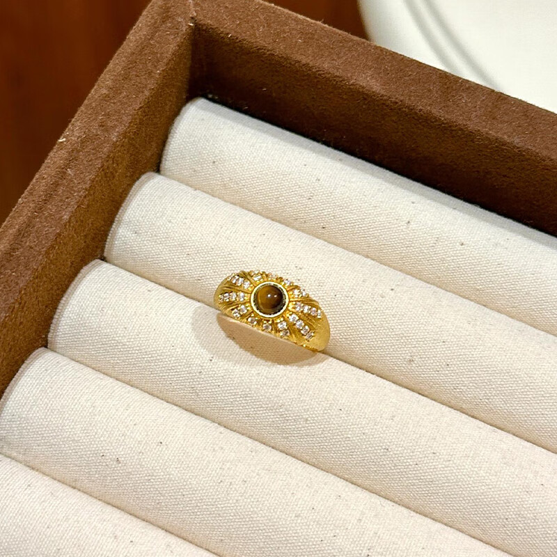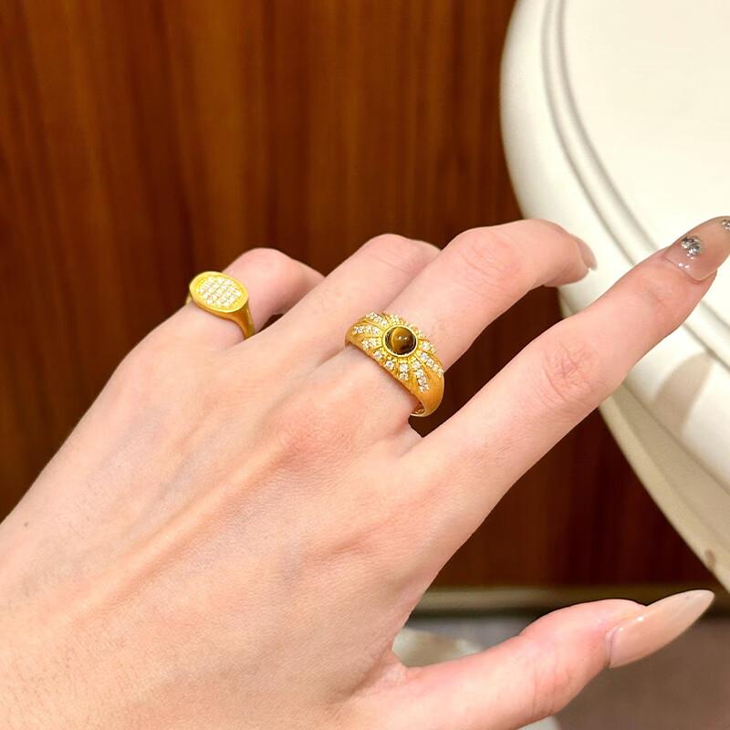 Yulongjing gold brushed tiger eye stone ring for women, new 999 solid gold dot diamond inlaid ring, closed ring for girlfriend, 12 circle size, gold about 2.1g-2.2g