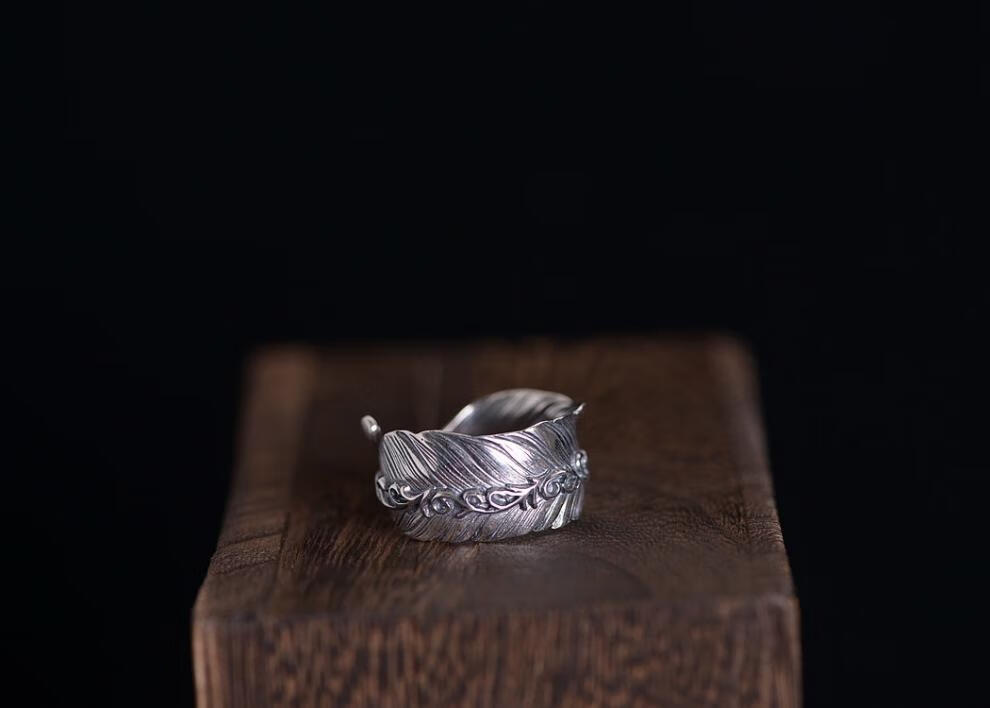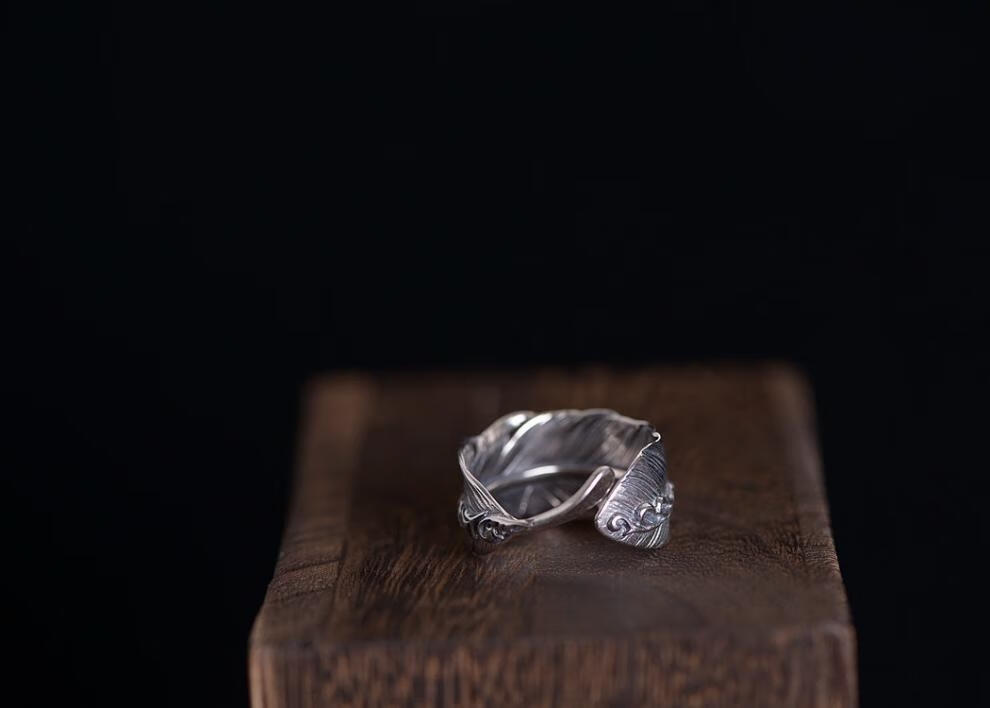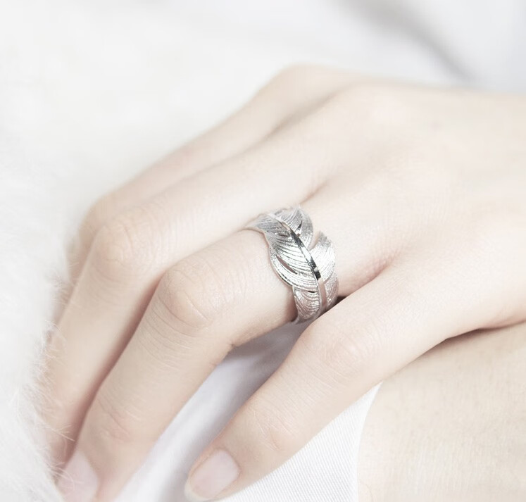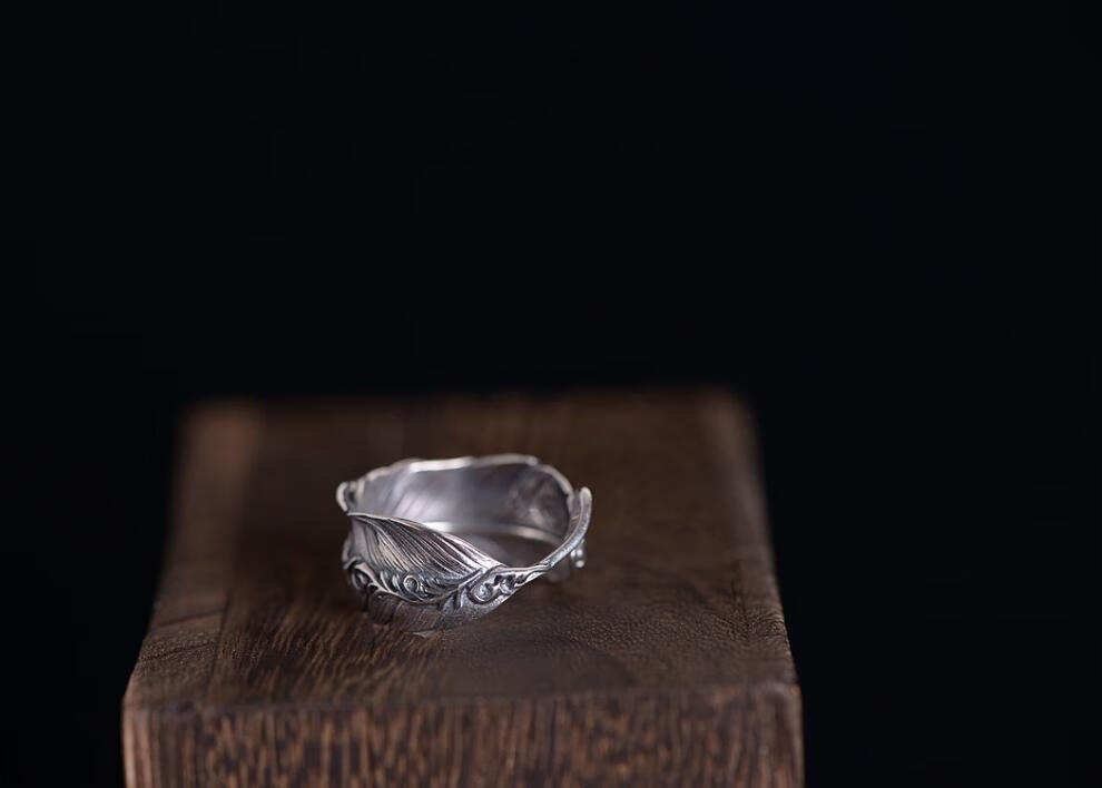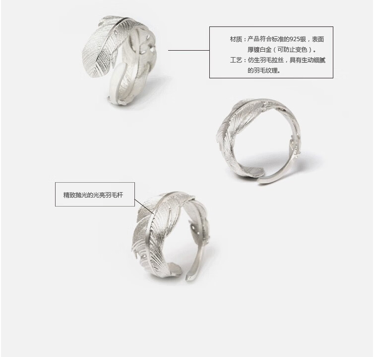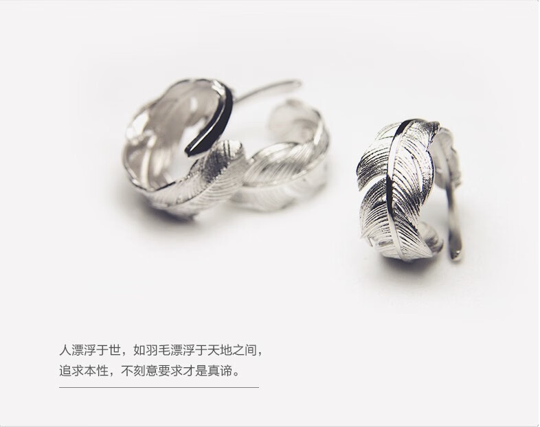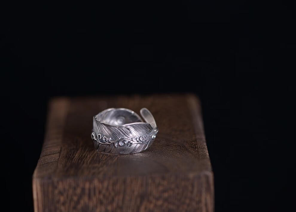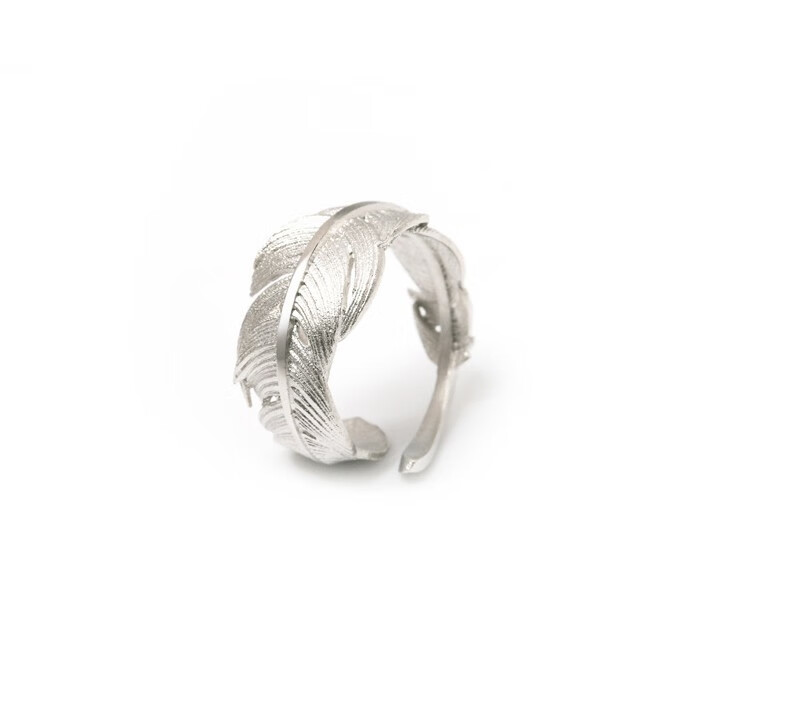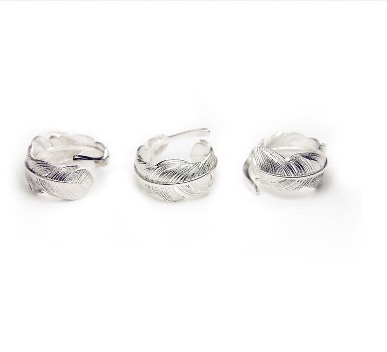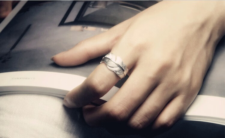 Flash engraved old Phoenix Japanese and Korean style 9999 pure silver handmade couple open ring tail ring middle index finger jewelry trendy and fashionable feather ring (white and silver) same style as Lao Fengxiang