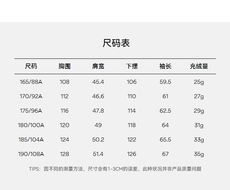 China (cm) 165 / 88-90 170 / 96-98 175 / 108-110 180 / 118-122 185 / 126-130