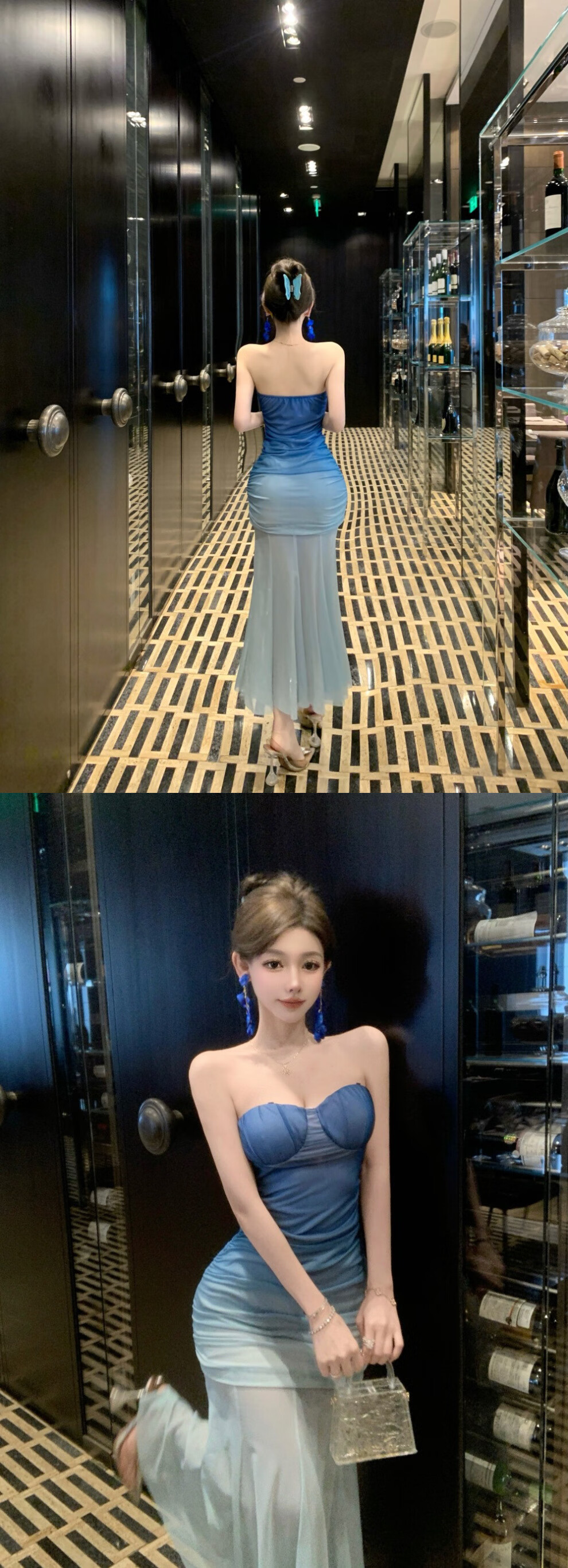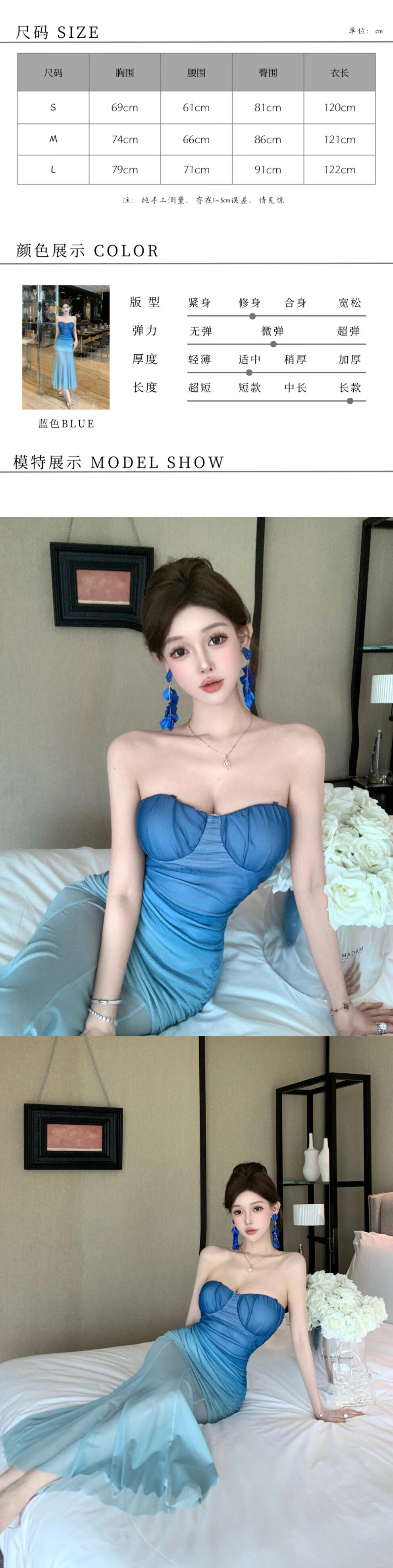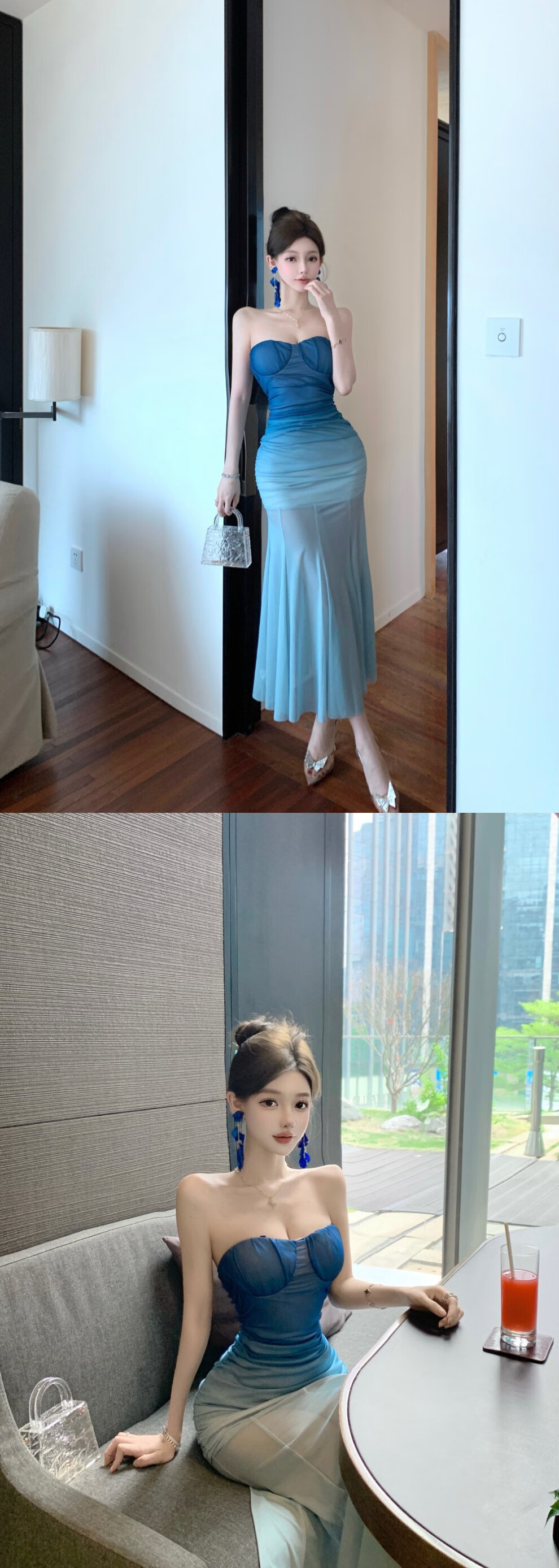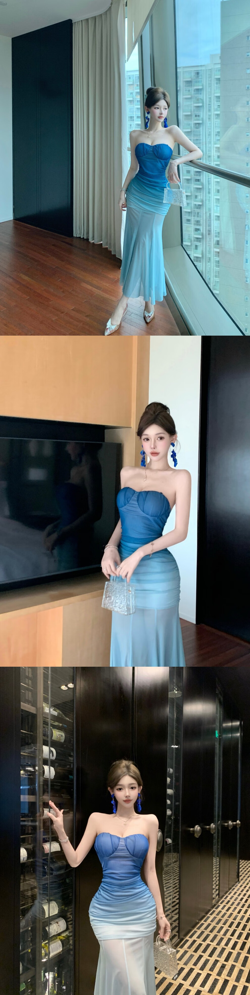 French blue mesh gradient tube top dress in the shimmer for women on seaside vacation, waist-slimming temperament evening dress, fishtail long skirt, gradient tube top dress, blue M