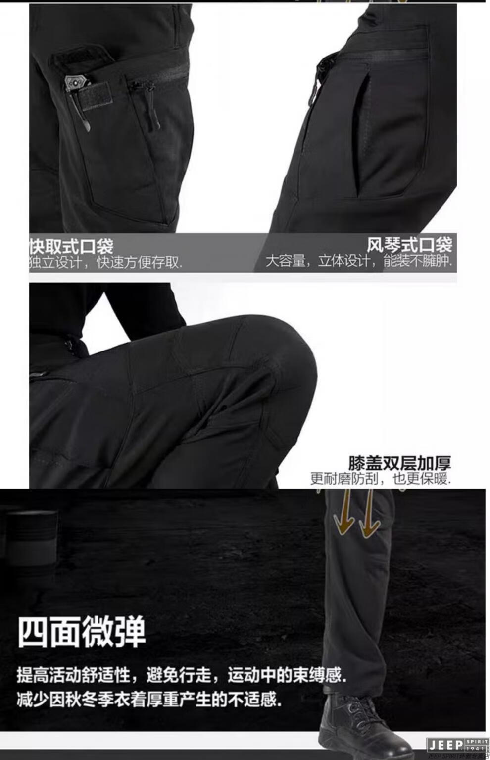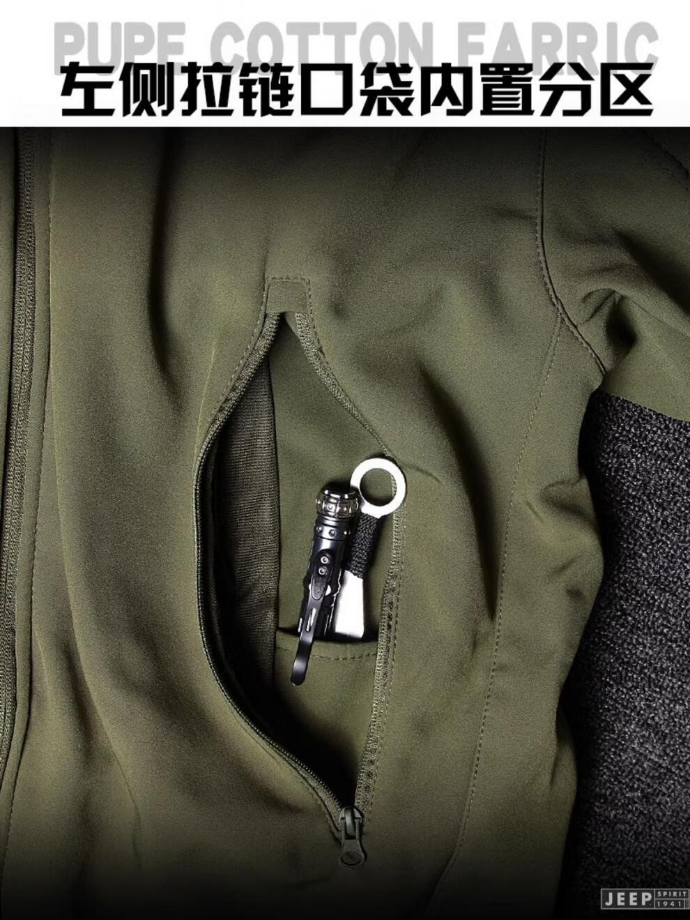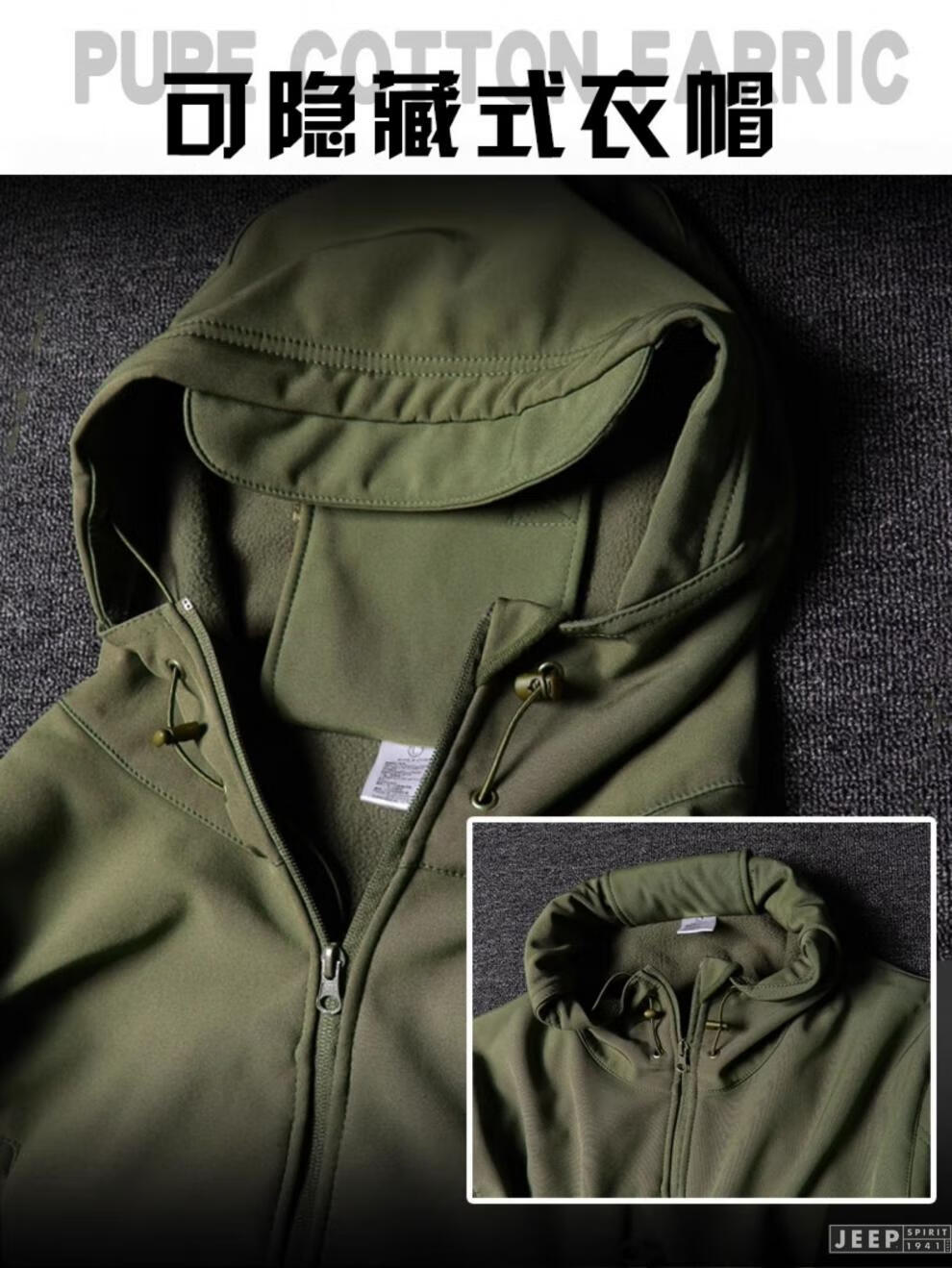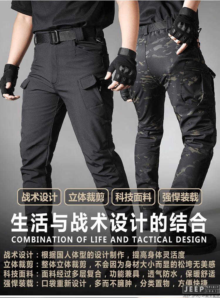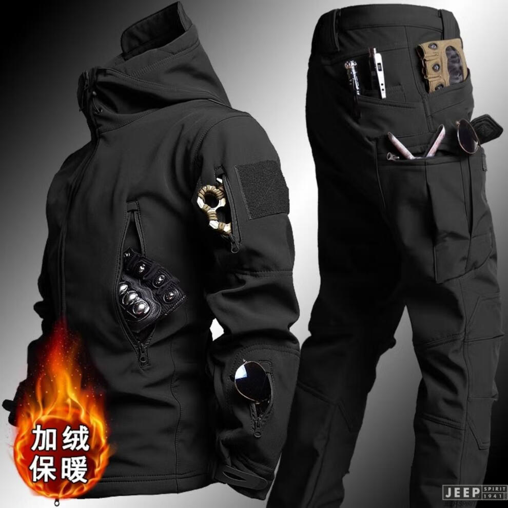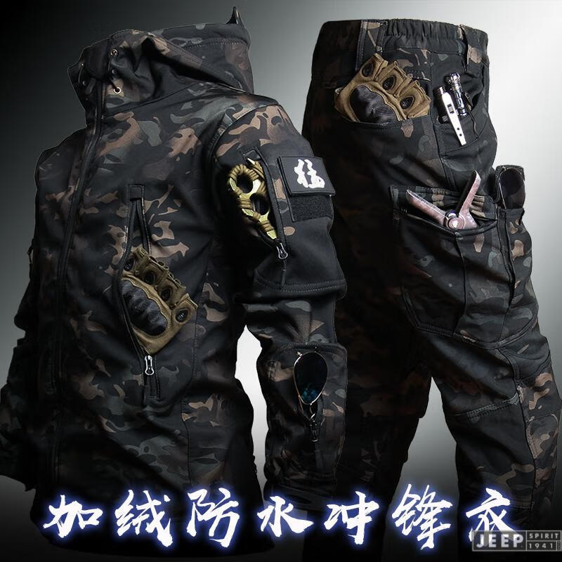 JEEP SPIRIT Outdoor Tactical Soft Shell Jacket Men's Velvet Camouflage Jacket Workwear Hooded Winter Cycling Overalls Windproof Shark Charge Suit-Dark Night S (100-120Jin Jin equals 0.5kg)