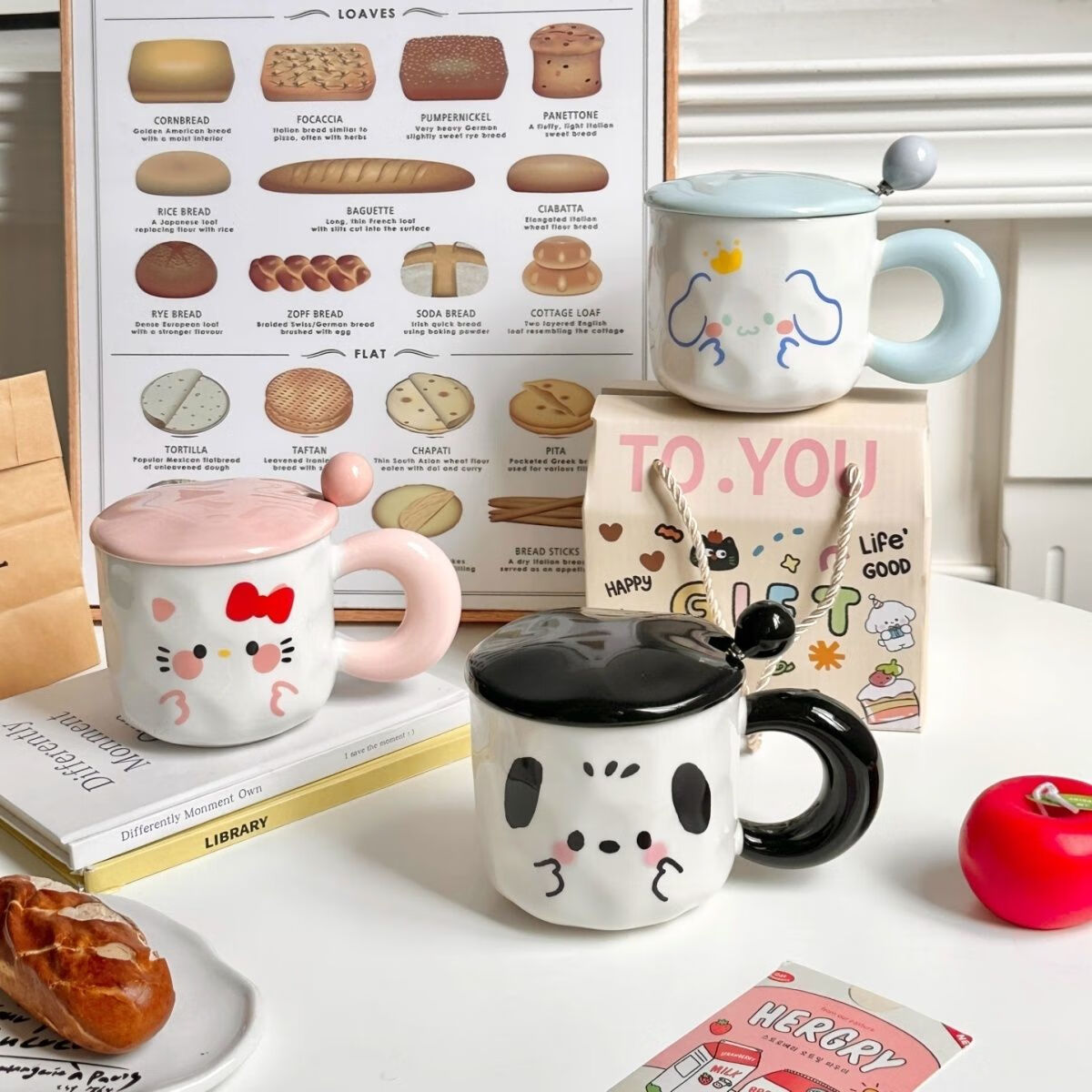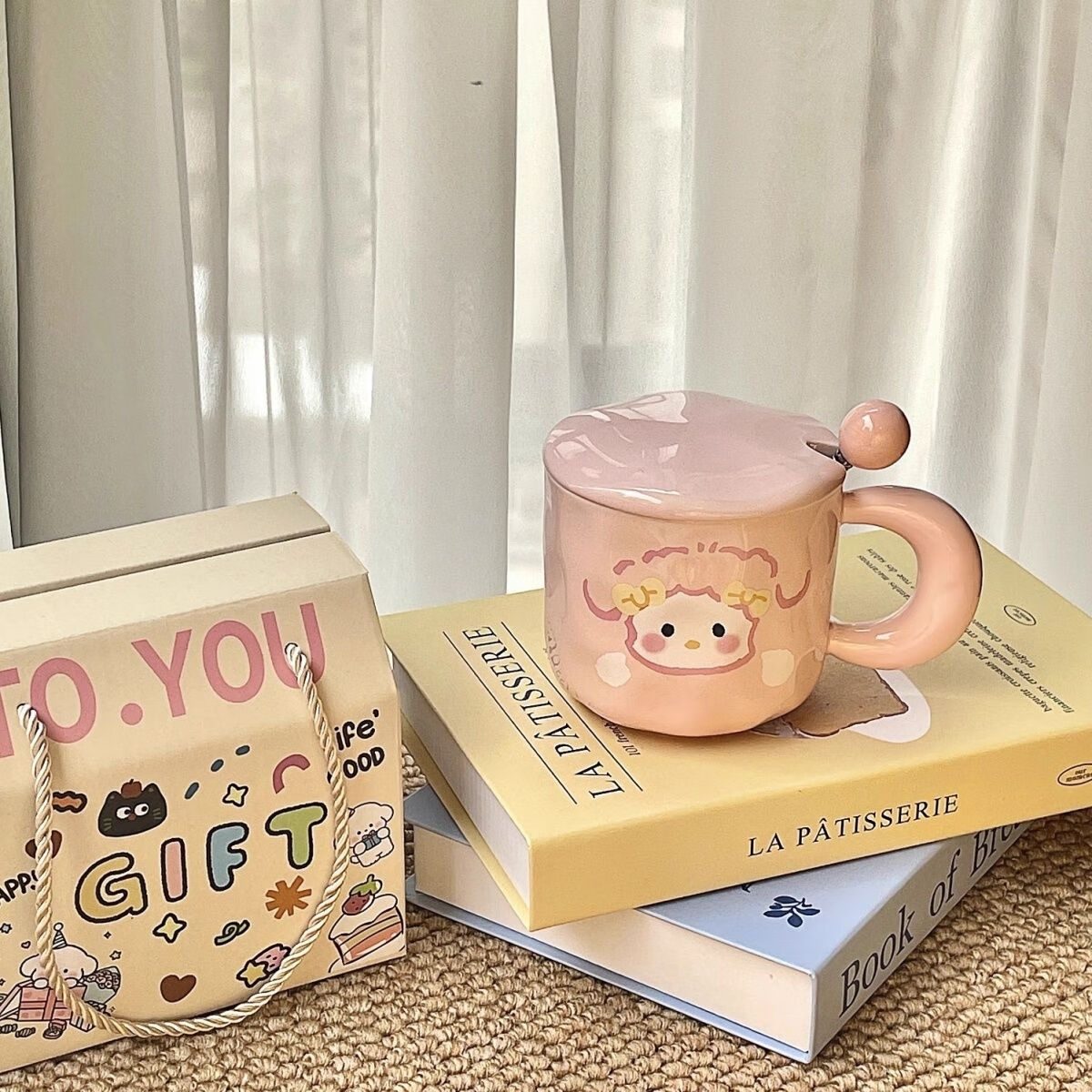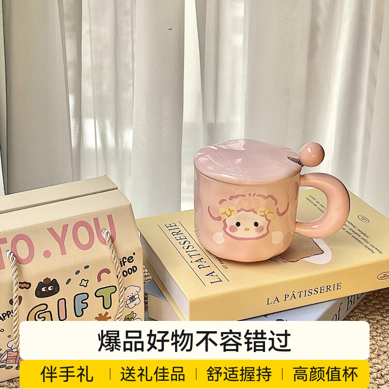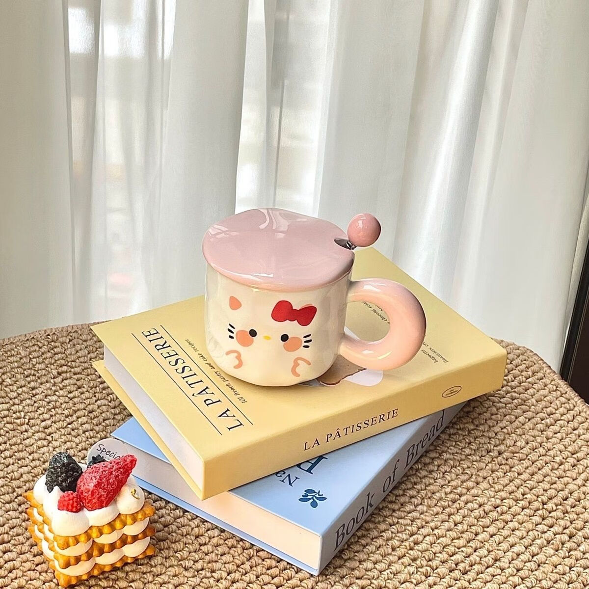 Ceramic mug with lid and spoon, good-looking cup as souvenir for women, household water cup, cute couple coffee breakfast cup, pink cute kitten, cup + lid + spoon