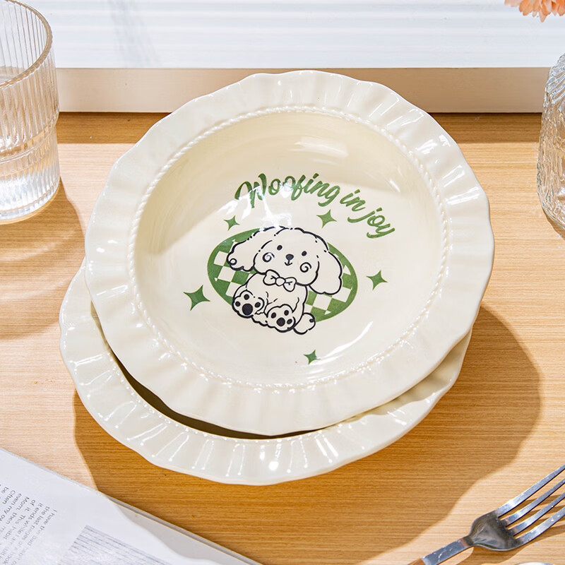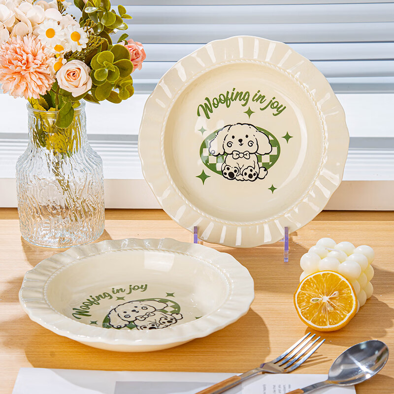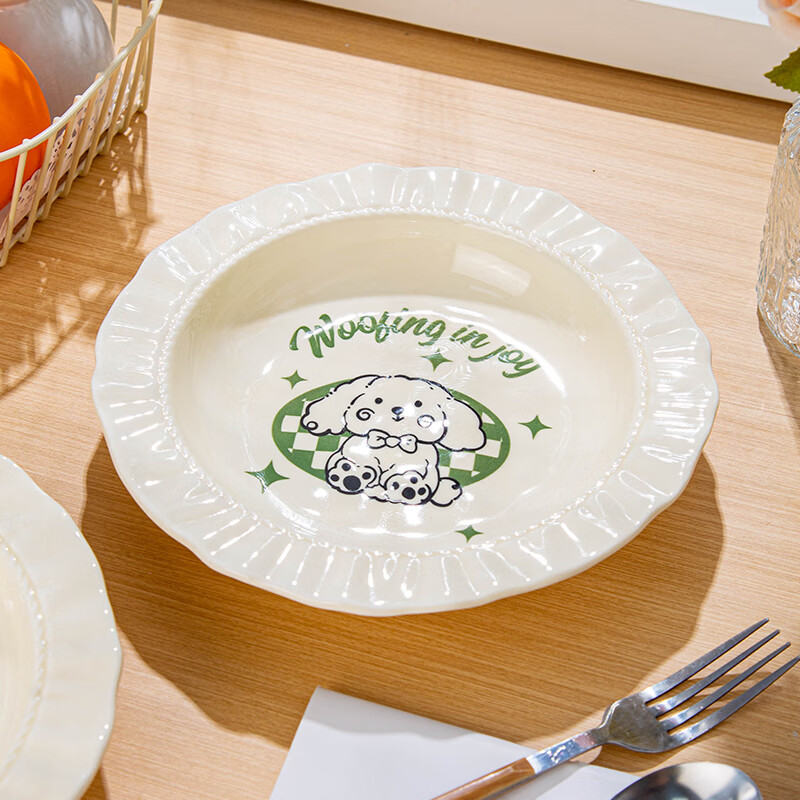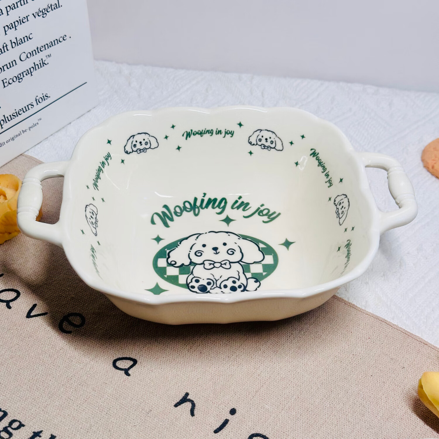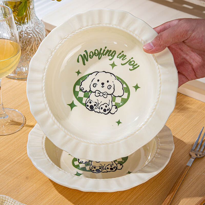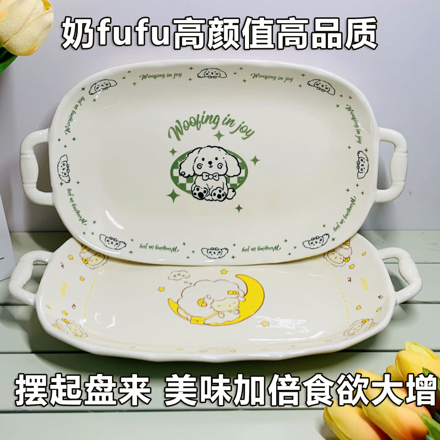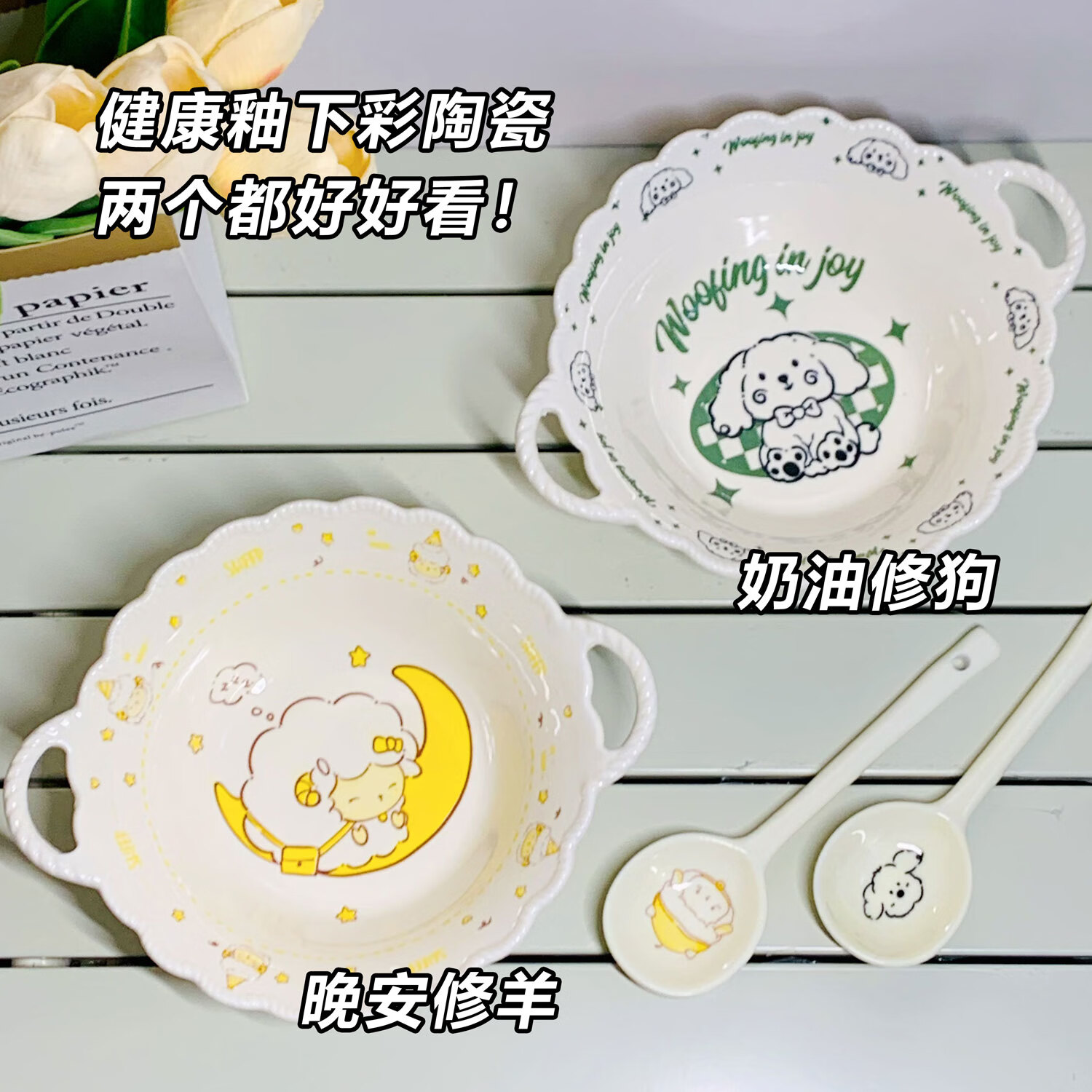 Milk fufu bowl and plate tableware set underglaze color ceramic bowl home ins high-looking plate dinner plate double-eared soup bowl 1 pack cream puppy flower basket bowl