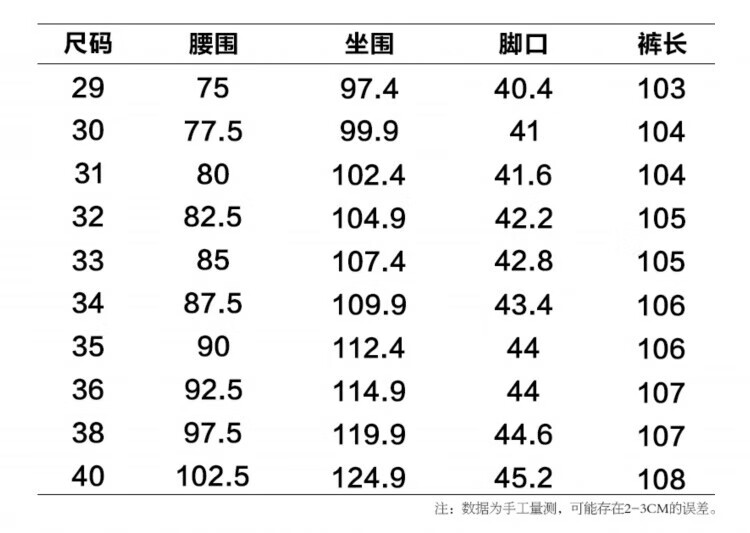 Outseam (cm) 99 cm 101.5 cm 104 cm 106.5 cm 109 cm