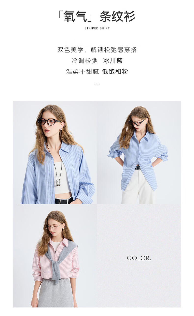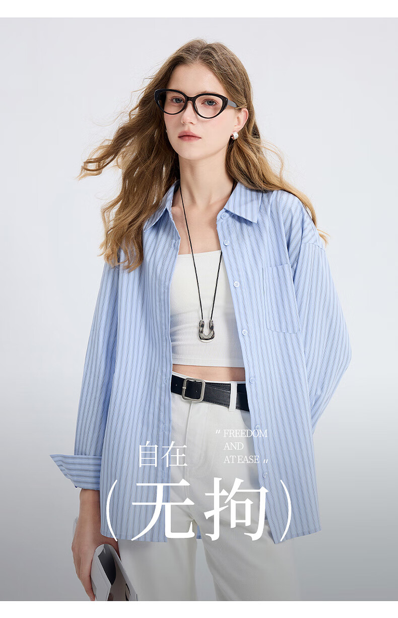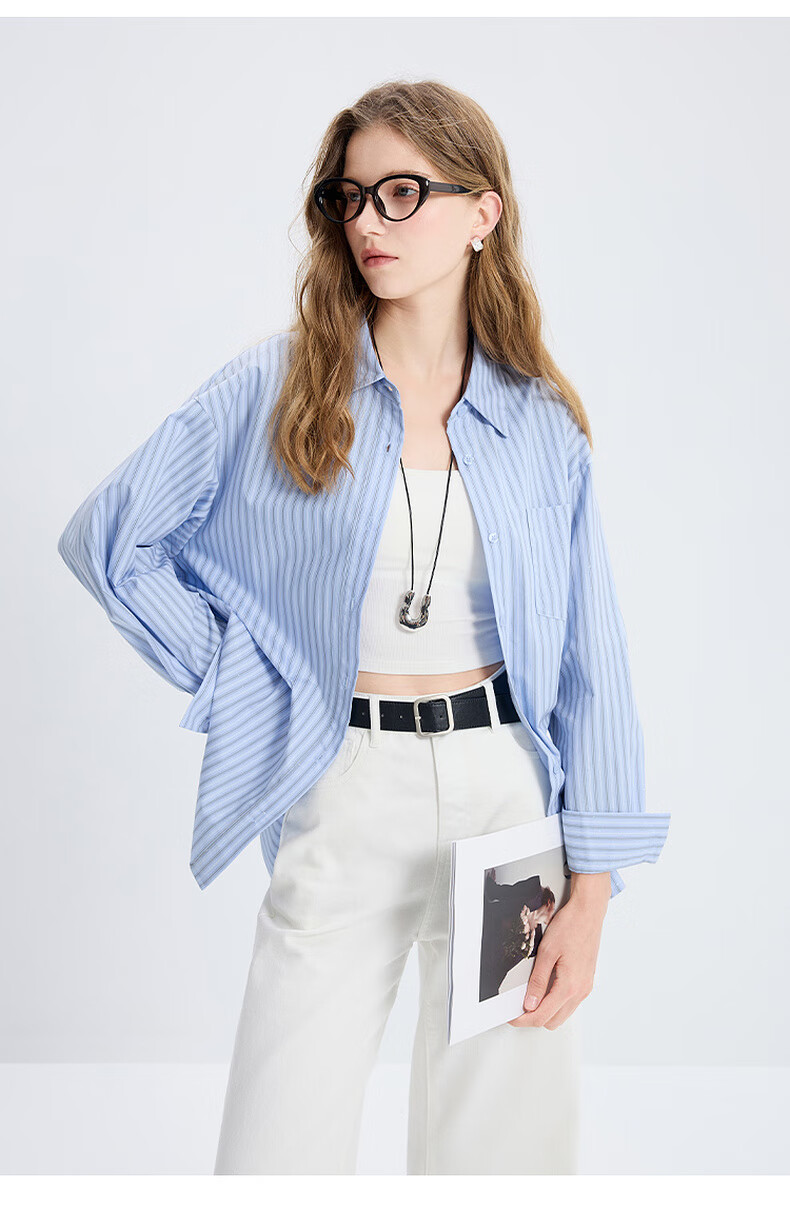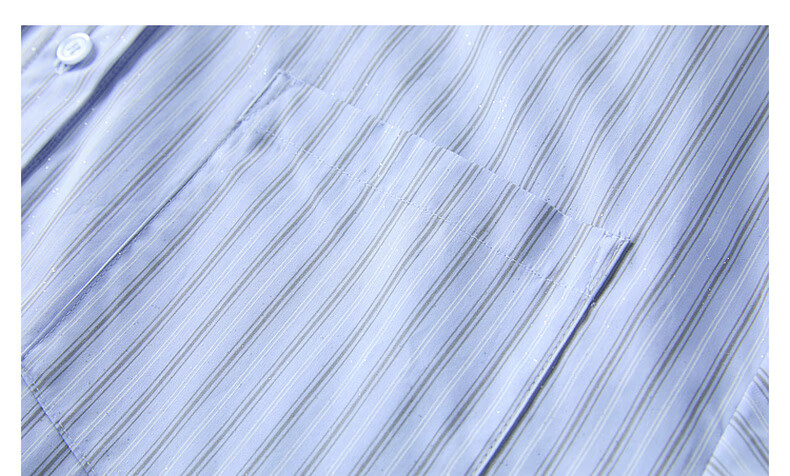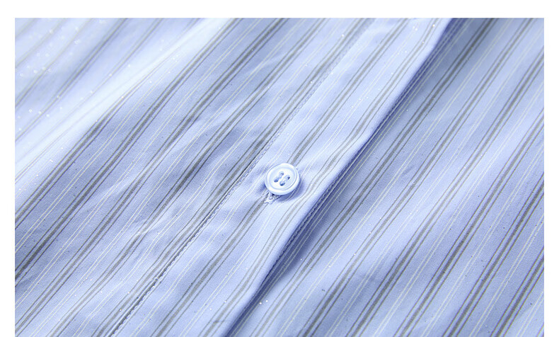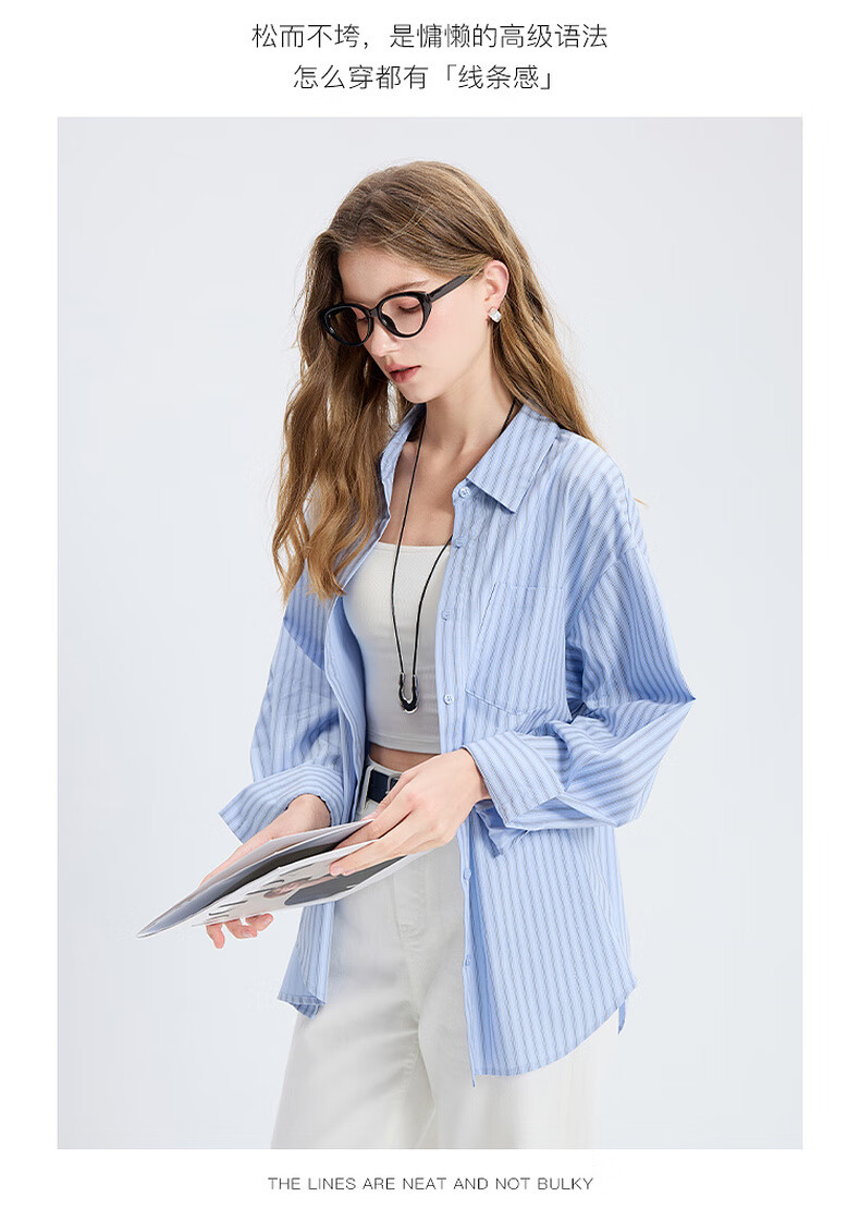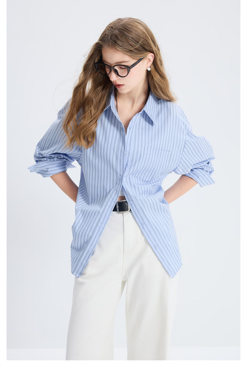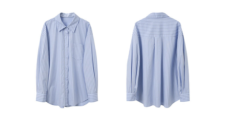 Tricolor 100 Cotton 2025 Autumn New Long Sleeve Loose Striped Shirt Lapel Shirt Cardigan Top M Glacier Blue Stripe M 160/84A