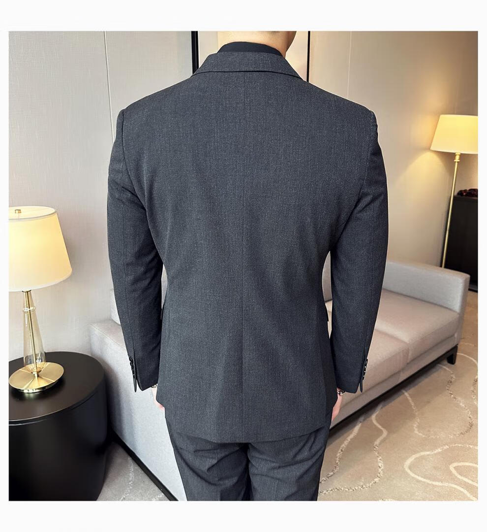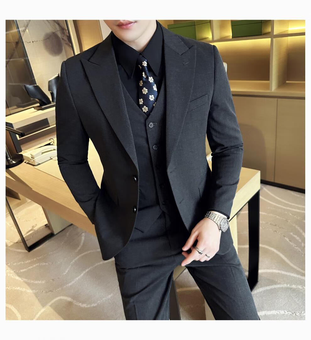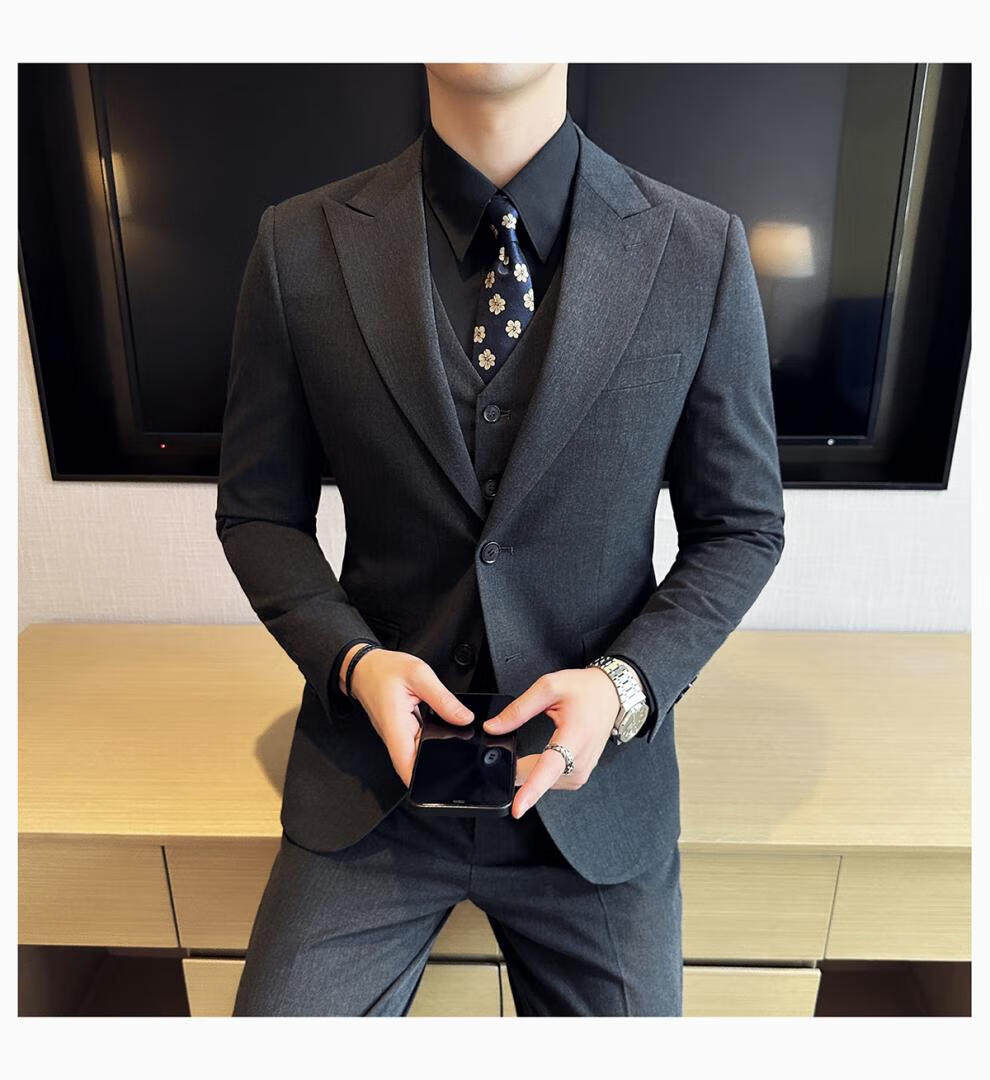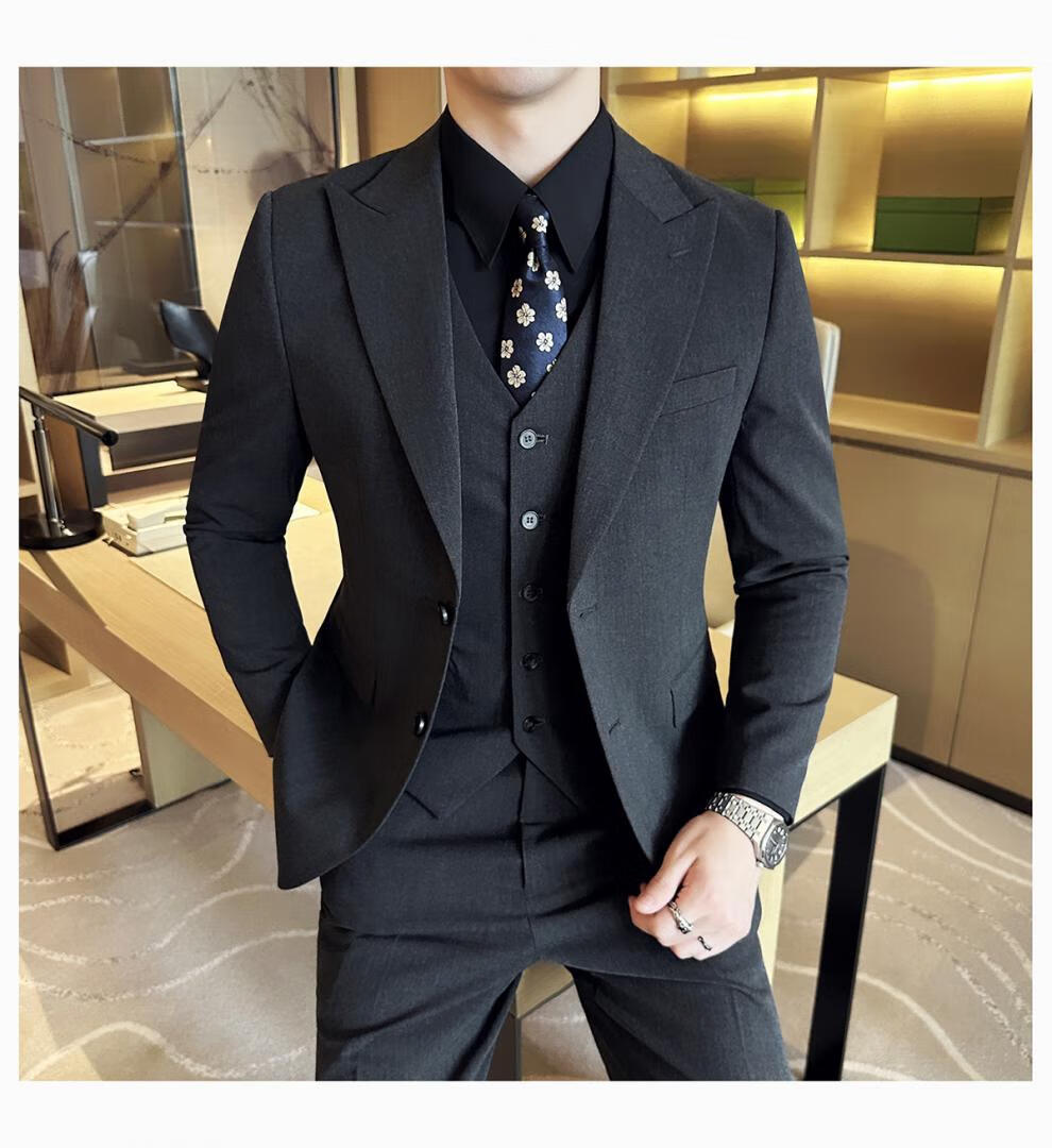 ROMON wide collar peak lapel suit business formal three-piece suit double slit wedding groom suit men's slim dark gray suit + vest + trousers two buttons L