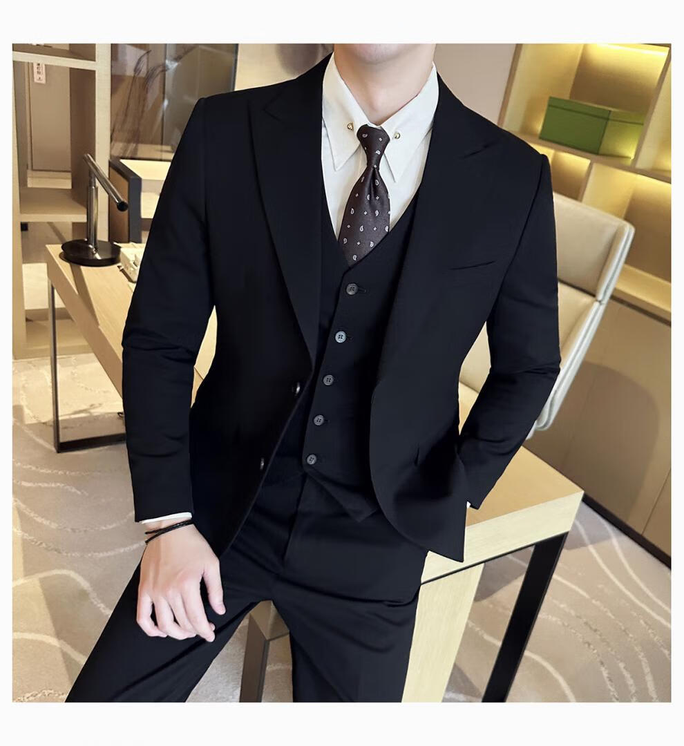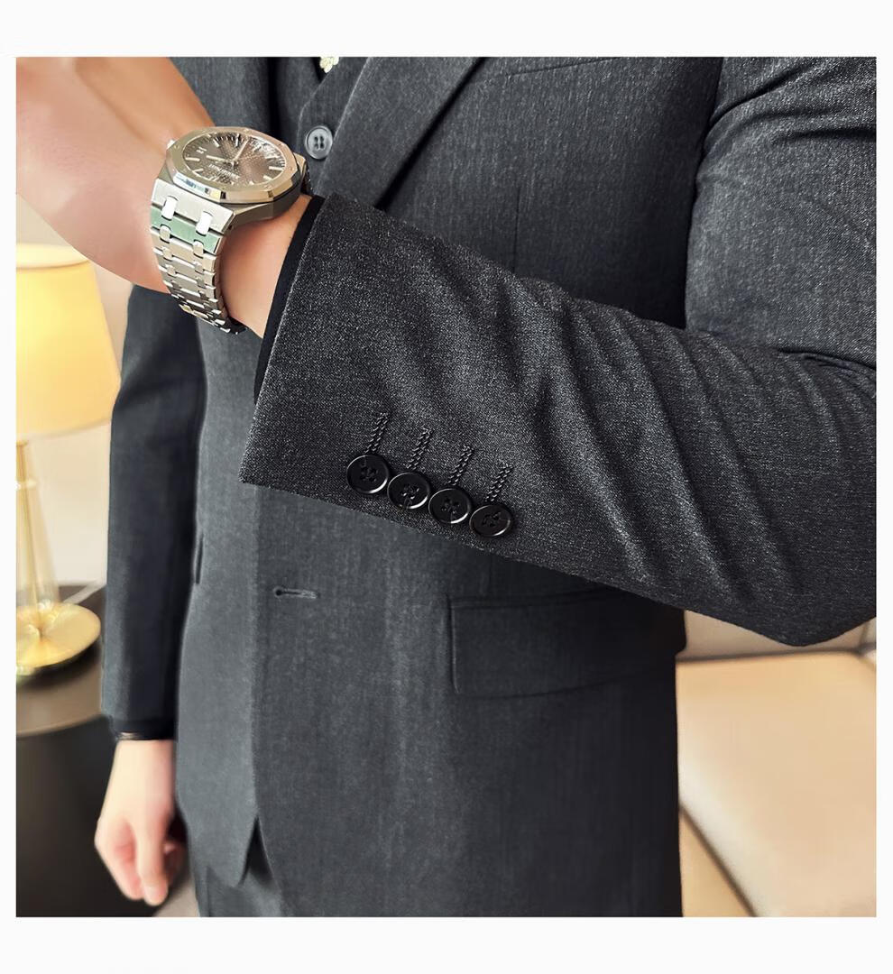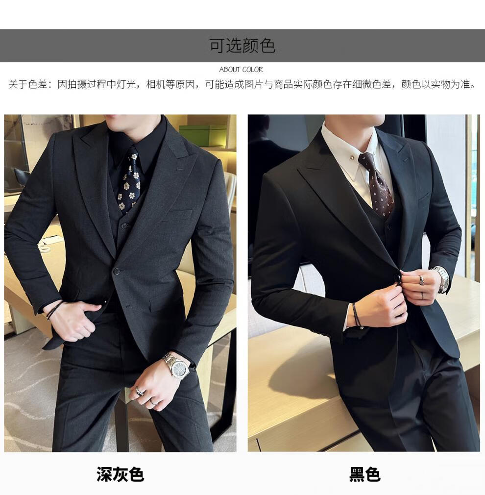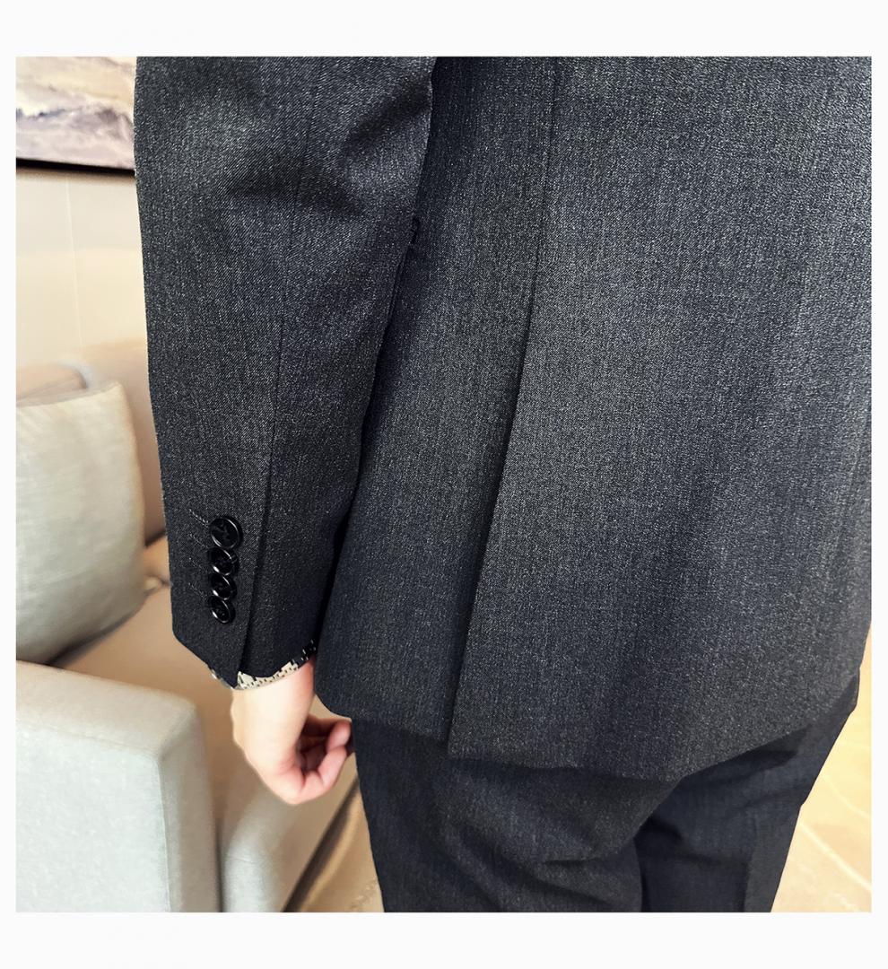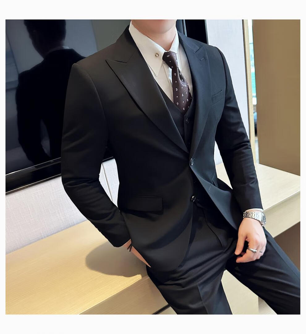 ROMON wide collar peak lapel suit business formal three-piece suit double slit wedding groom suit men's slim dark gray suit + vest + trousers two buttons L