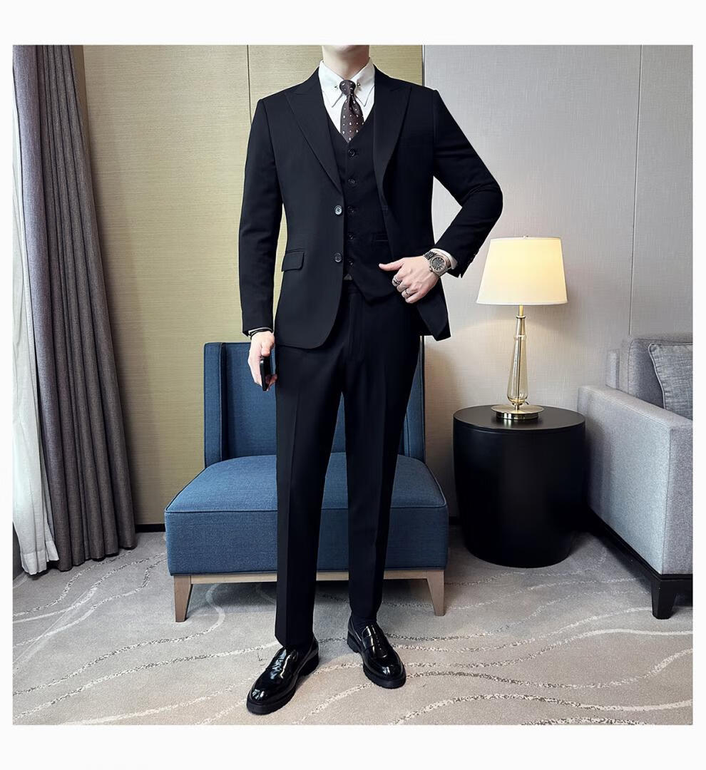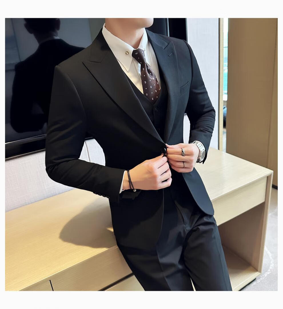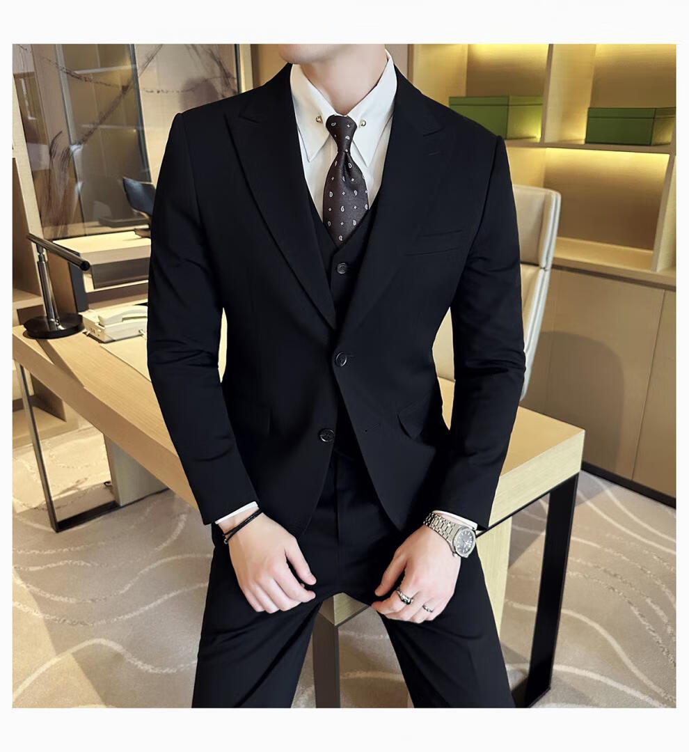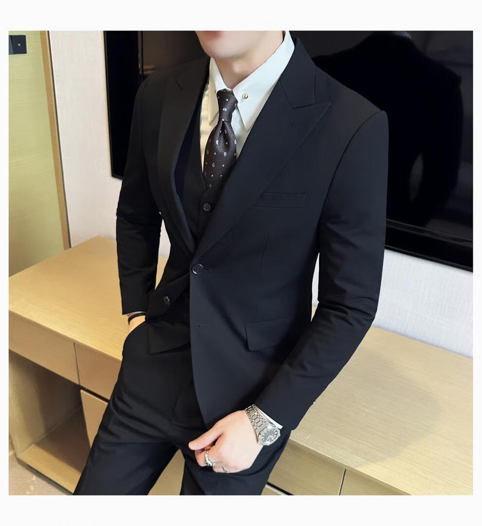 ROMON wide collar peak lapel suit business formal three-piece suit double slit wedding groom suit men's slim dark gray suit + vest + trousers two buttons L