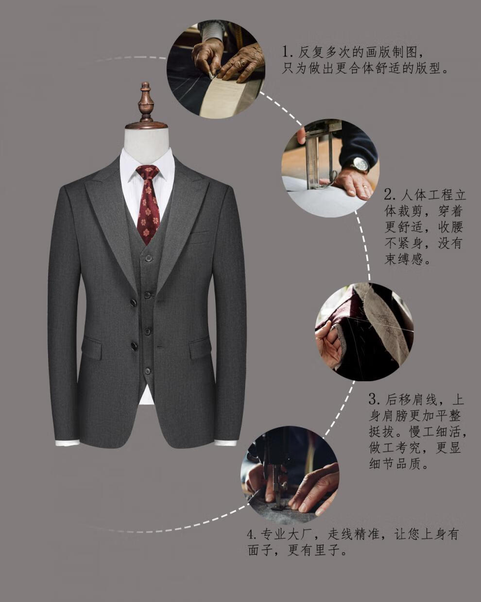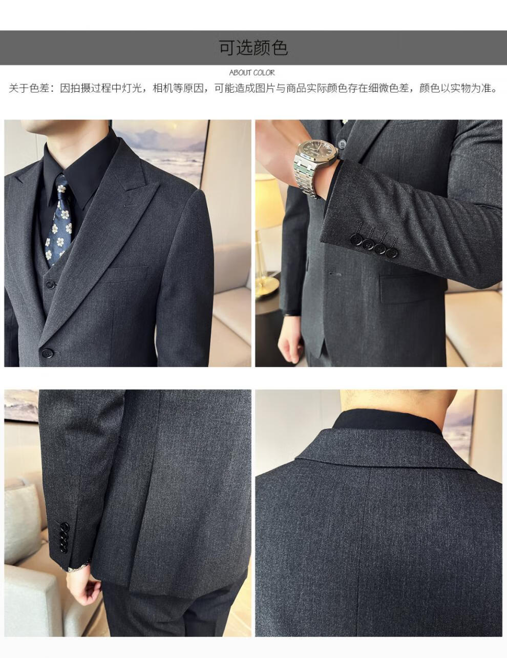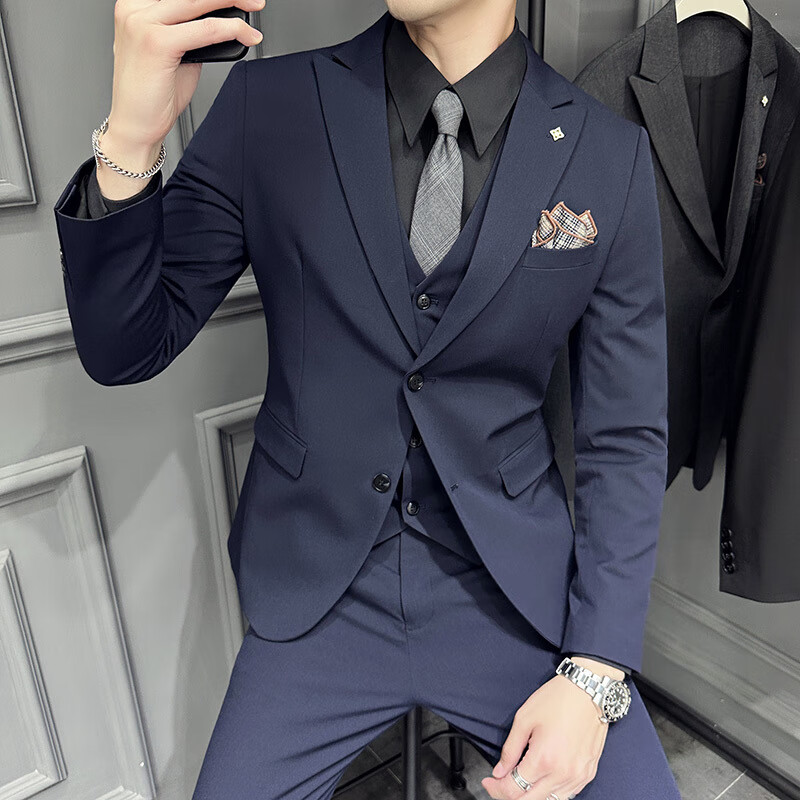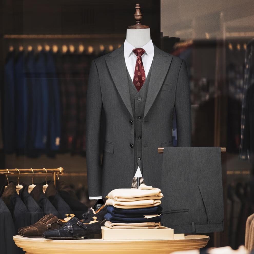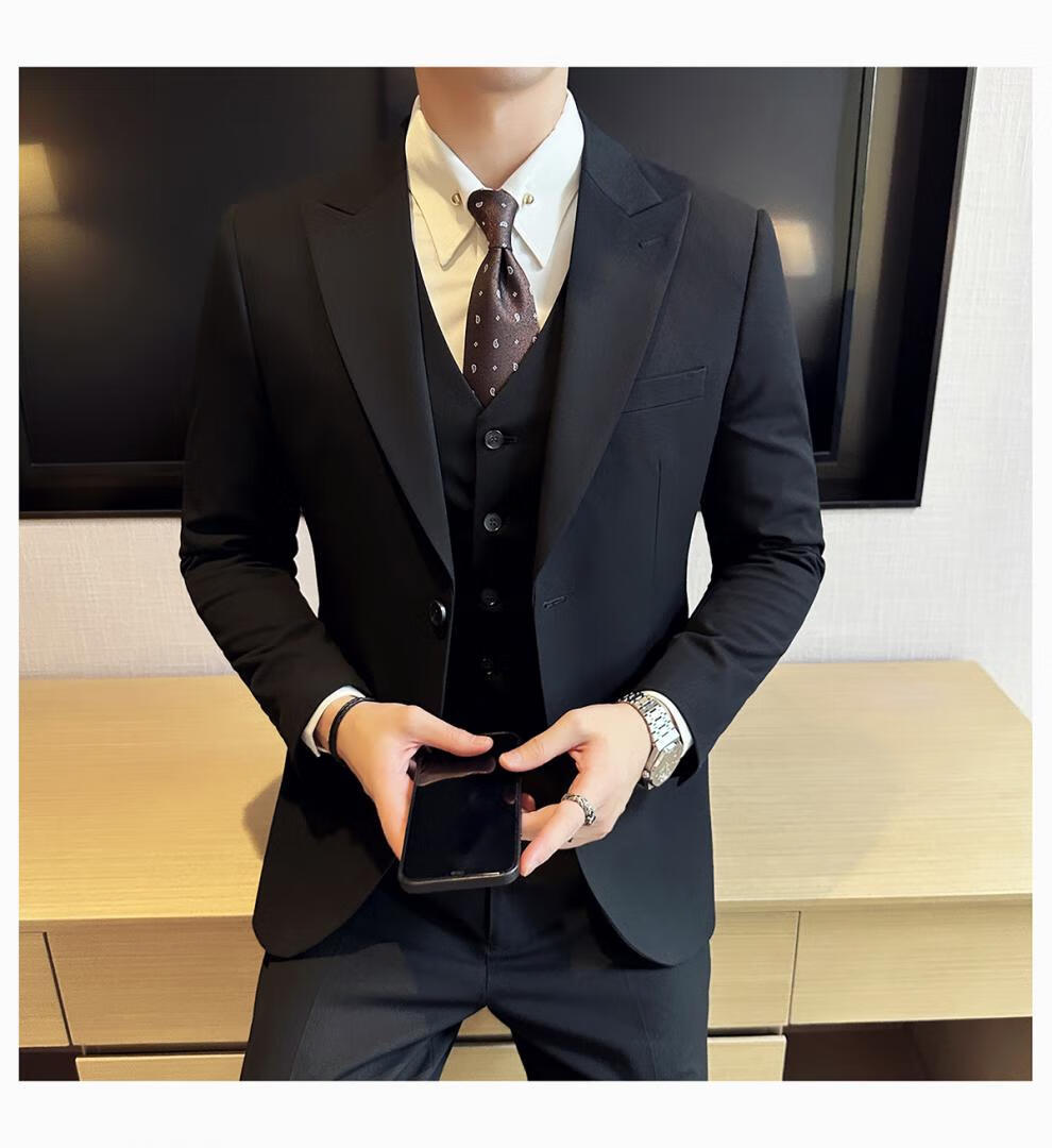 ROMON wide collar peak lapel suit business formal three-piece suit double slit wedding groom suit men's slim dark gray suit + vest + trousers two buttons L