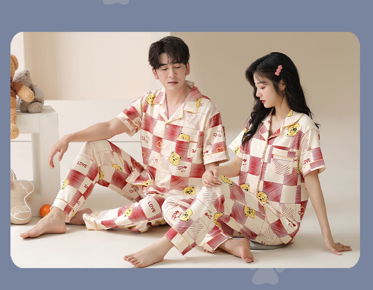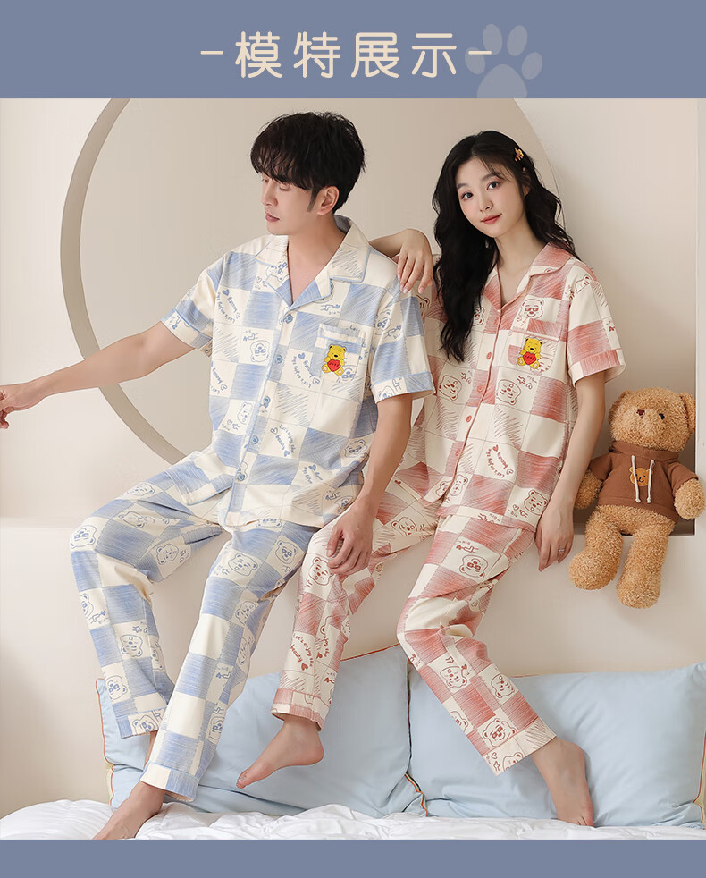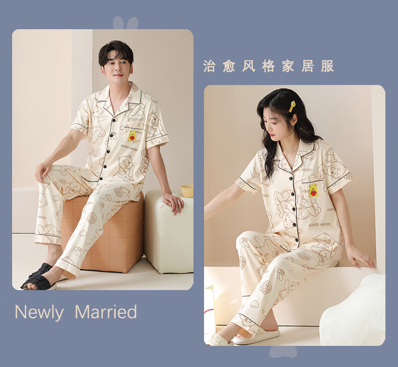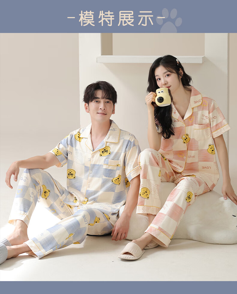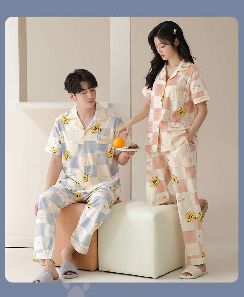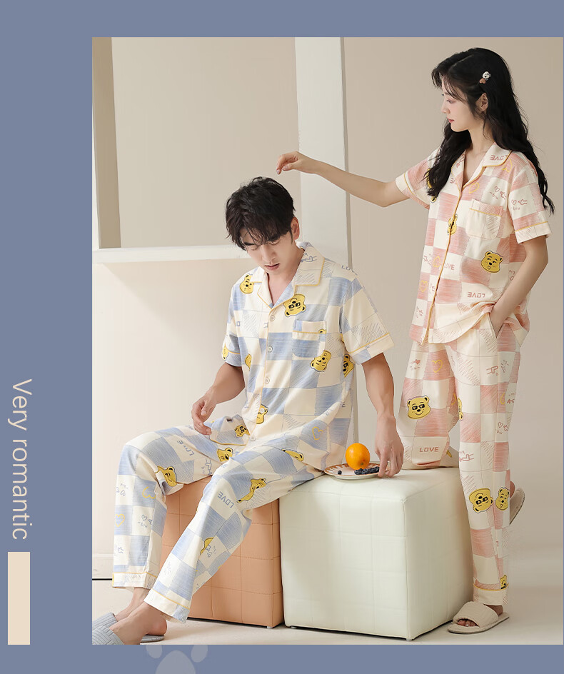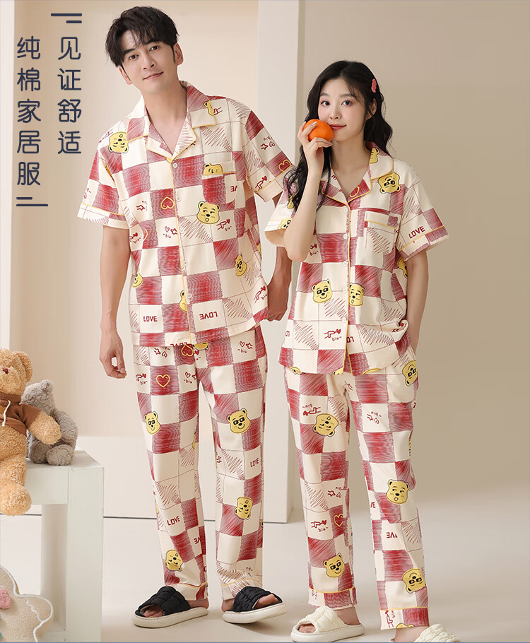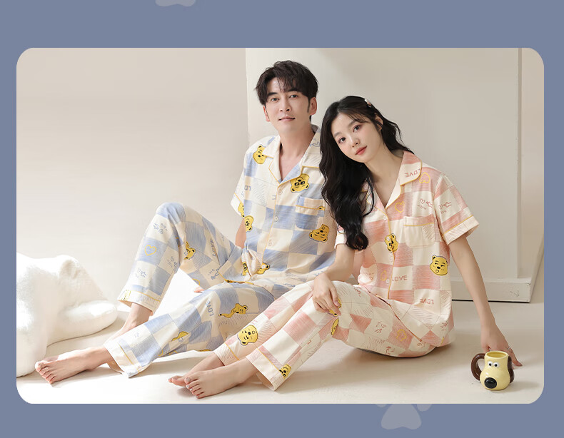 LangSha couple pajamas for one man and one woman, summer pure cotton thin section 7A antibacterial and anti-mite short-sleeved trousers, cardigan, casual home wear 6229 XL female + 3XL male