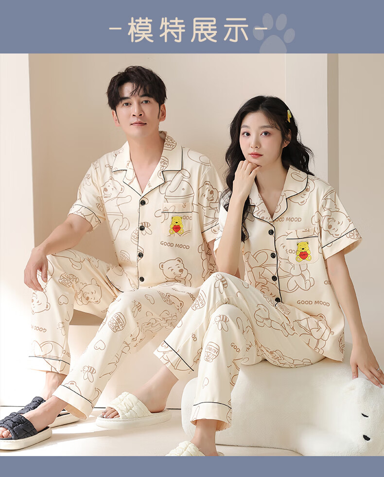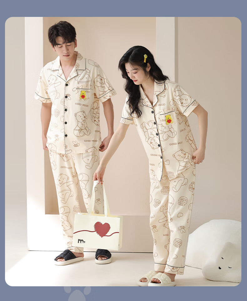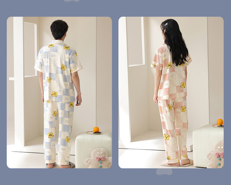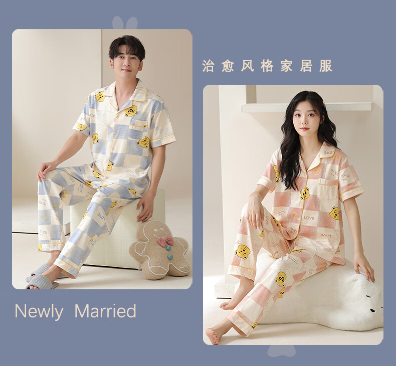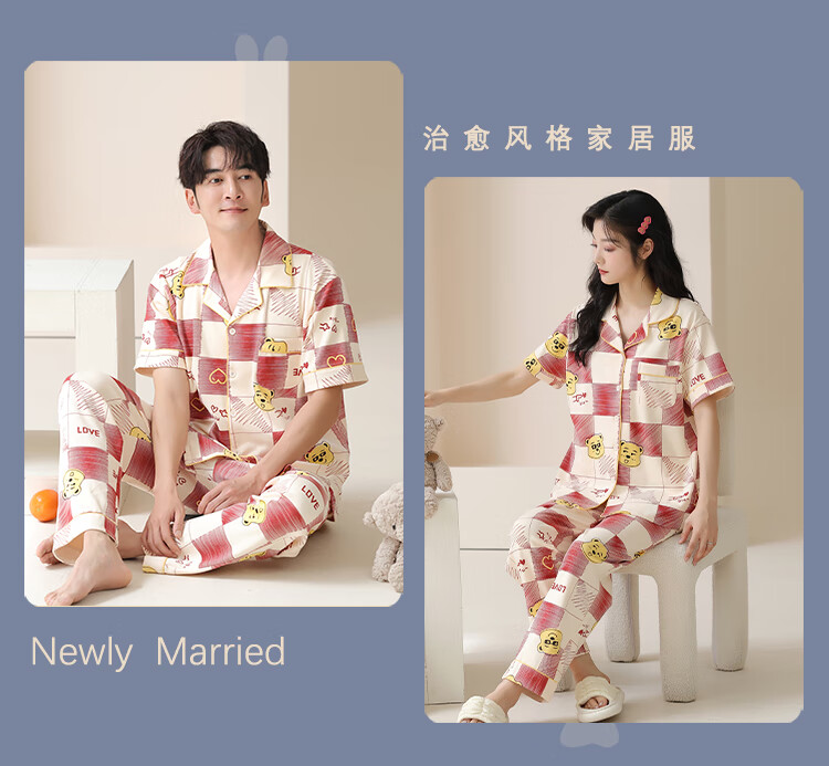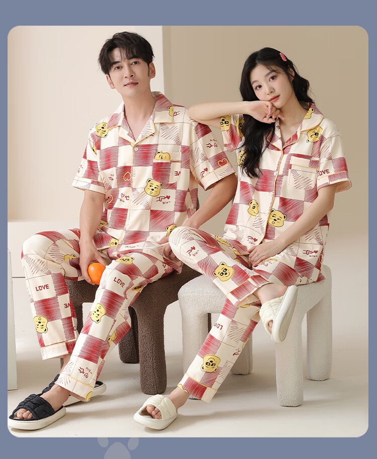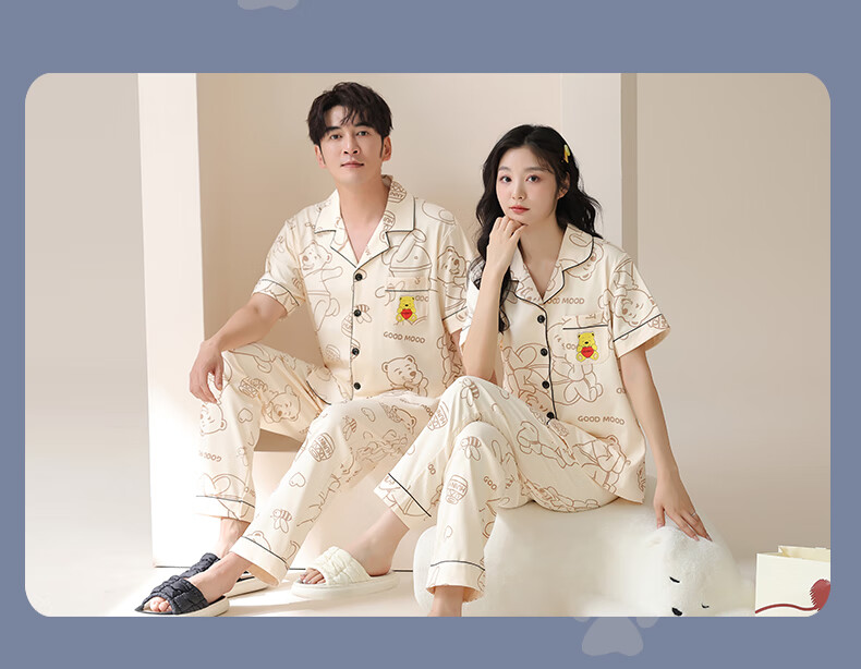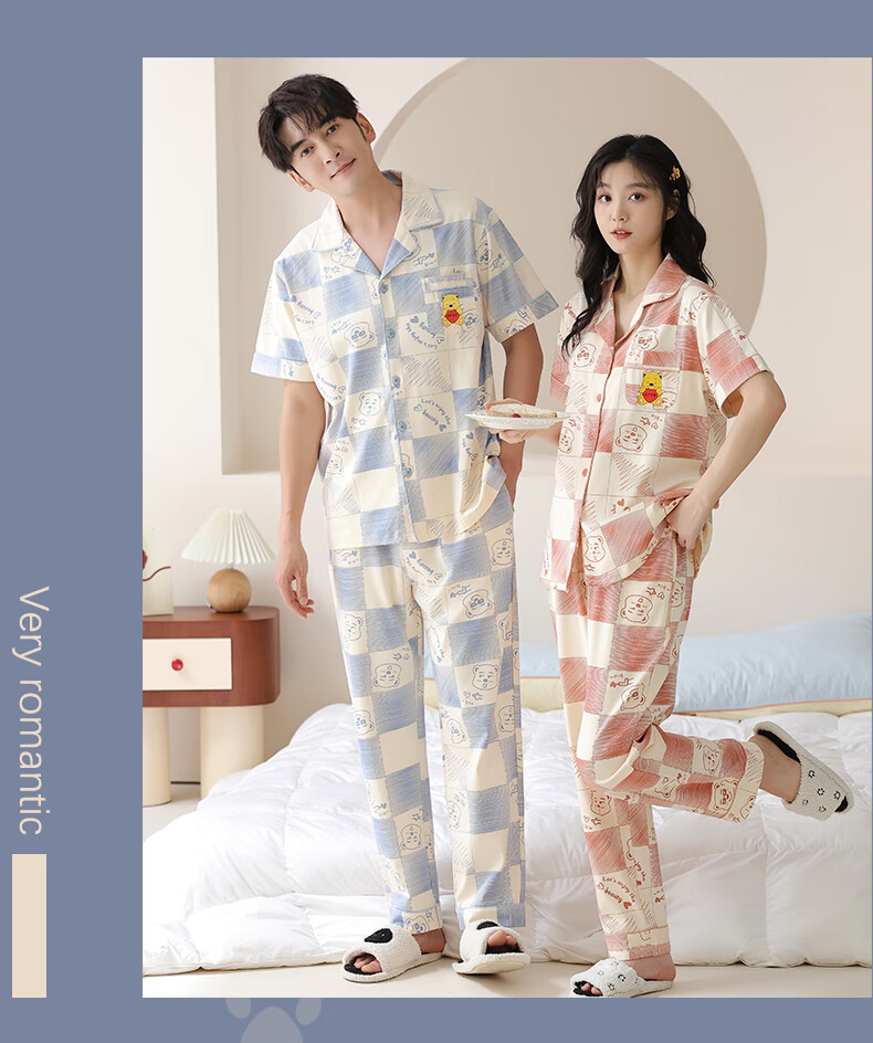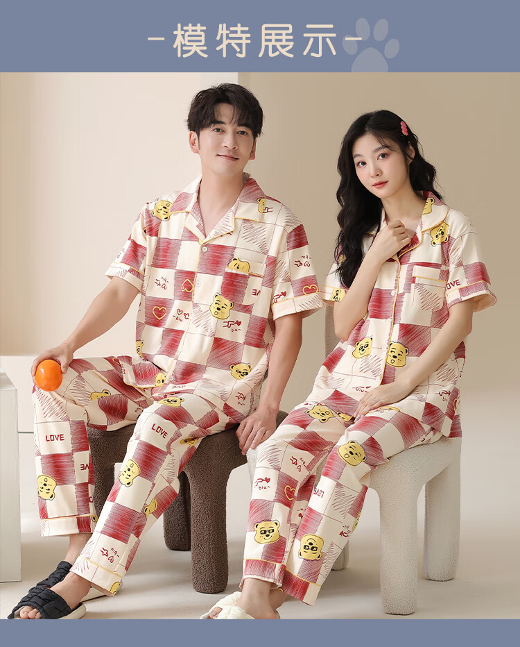 LangSha couple pajamas for one man and one woman, summer pure cotton thin section 7A antibacterial and anti-mite short-sleeved trousers, cardigan, casual home wear 6229 XL female + 3XL male