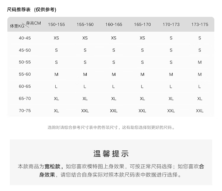 China (cm) 160-165/84-86 165-170 / 88-90 167-172 / 92-96 168-173 / 98-102 170-176 / 106-110