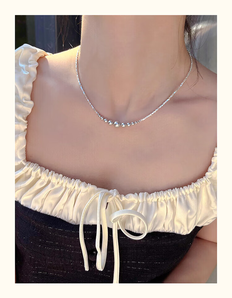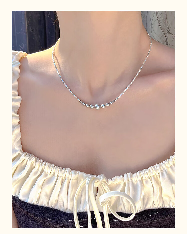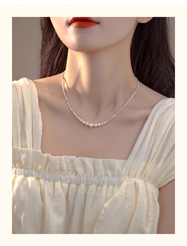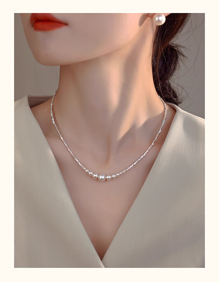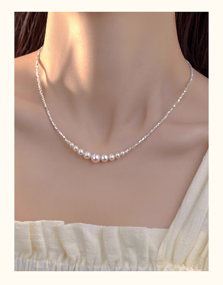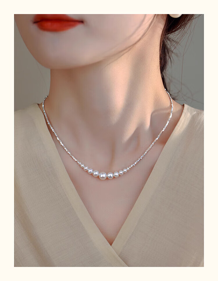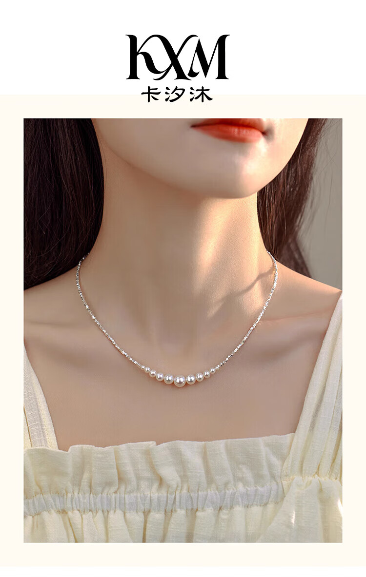 Kaximu Broken Silver Pearl Necklace for Women Gradient Smile Stitching Design Shijia Pearl Highlight Clavicle Chain Light Luxury Sweater Chain for Women Broken Silver Pearl Necklace Gift Box