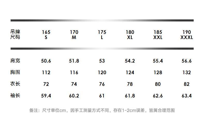 China (cm) 165 / 88-90 170 / 96-98 175 / 108-110 180 / 118-122 185 / 126-130
