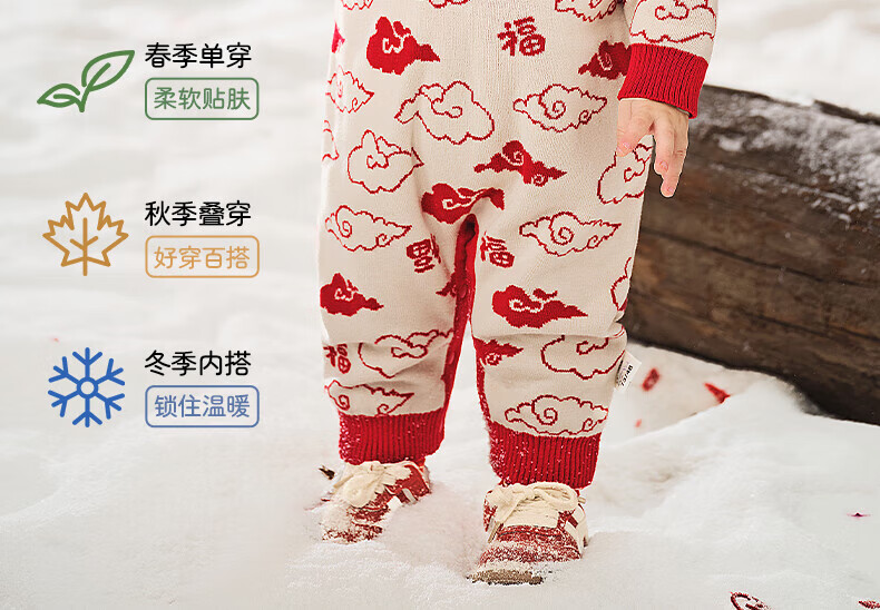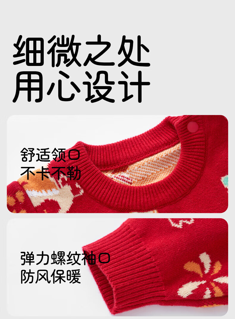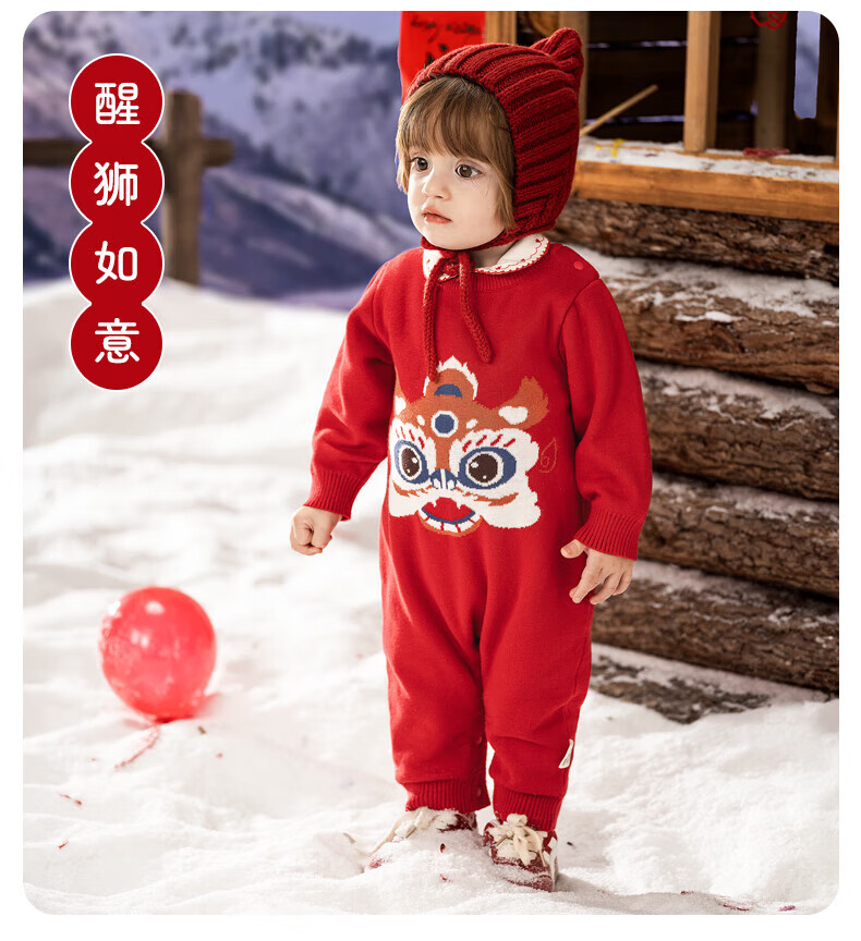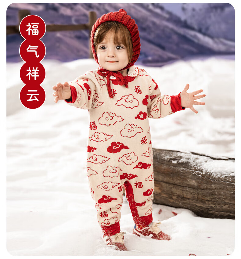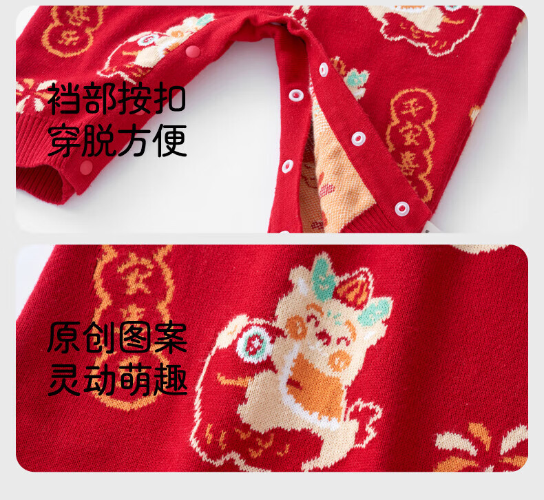 European pregnant baby autumn and winter children's clothing knitted one-piece plus velvet New Year's greetings red festive sweatshirt climbing suit, safe and happy, thickened and warm - velvet style 66 cm