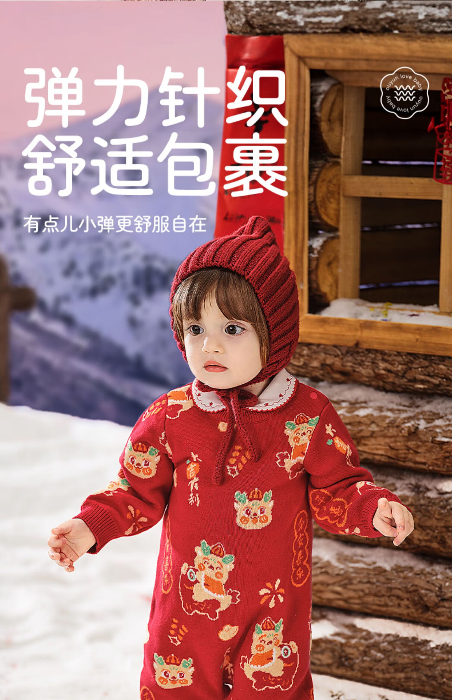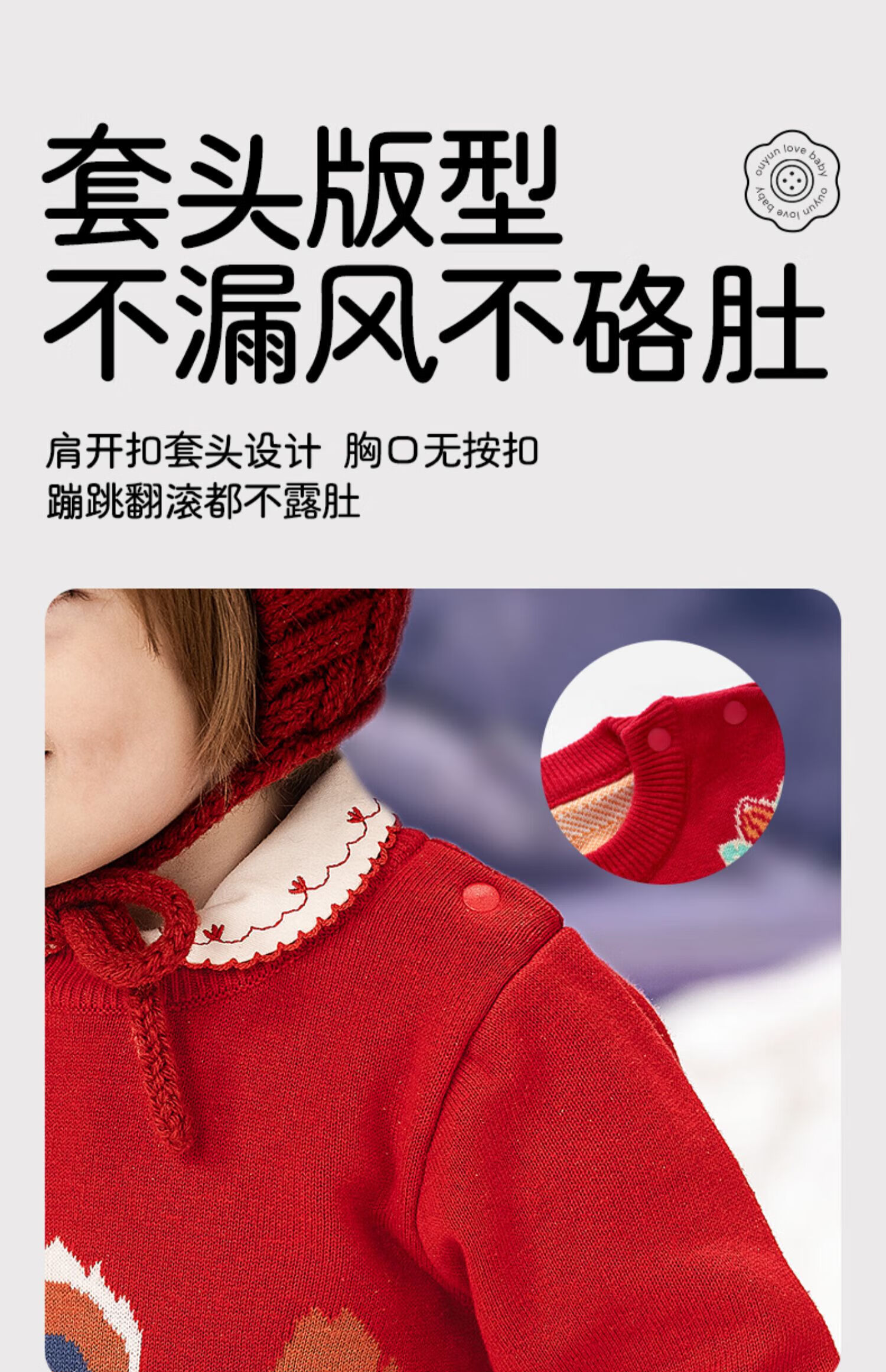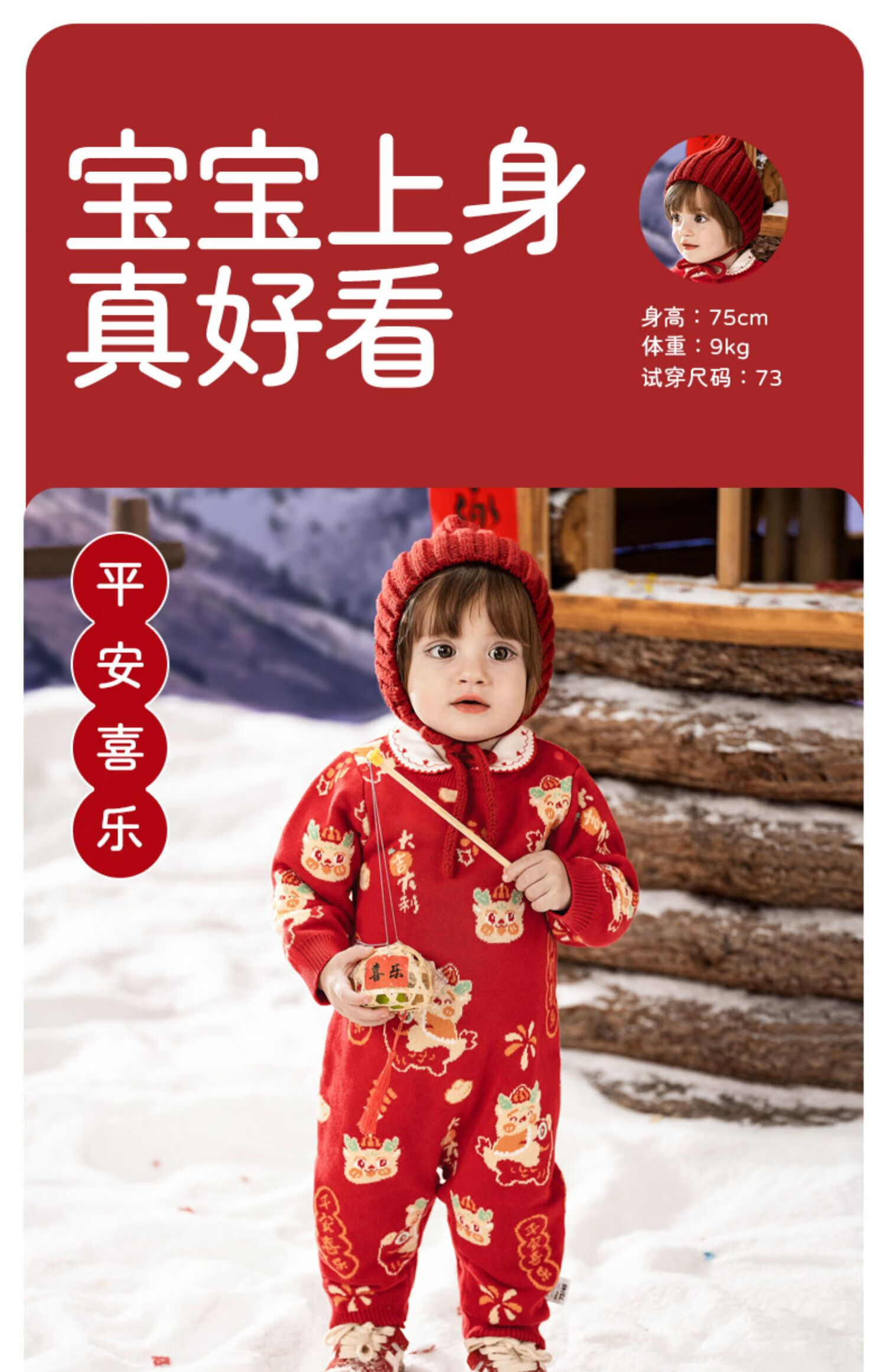 European pregnant baby autumn and winter children's clothing knitted one-piece plus velvet New Year's greetings red festive sweatshirt climbing suit, safe and happy, thickened and warm - velvet style 66 cm