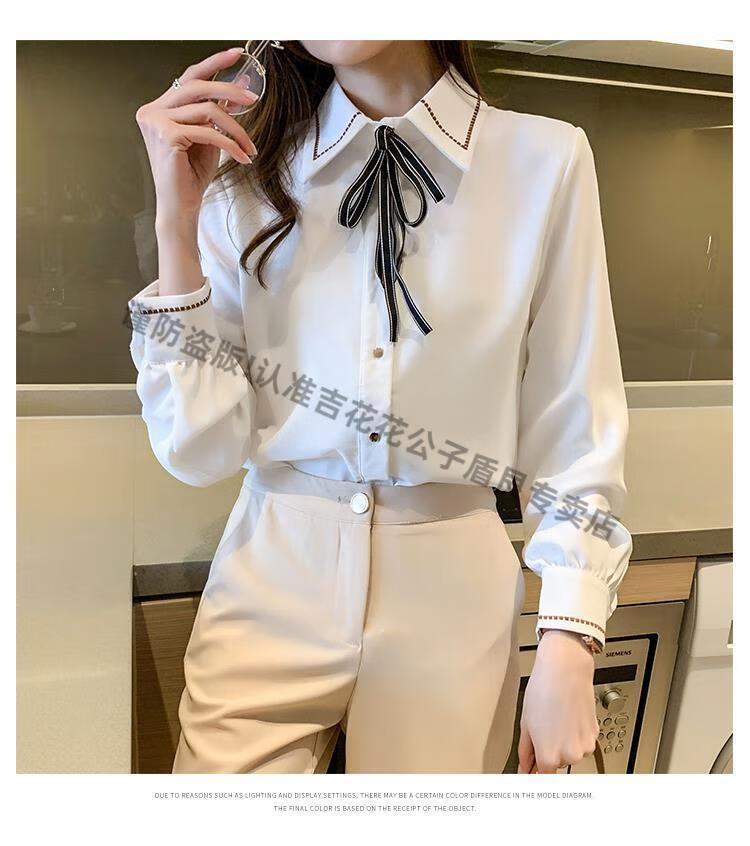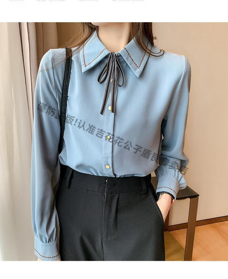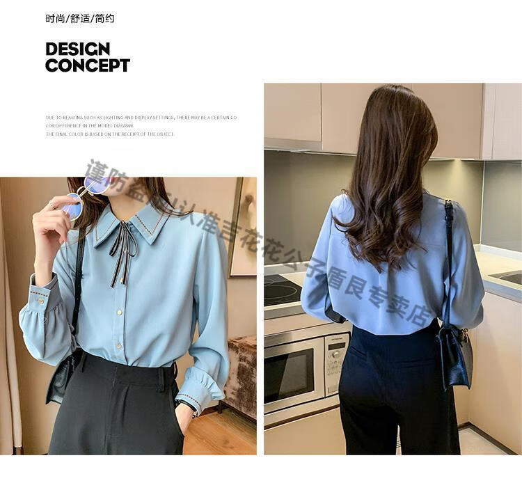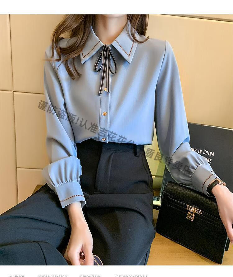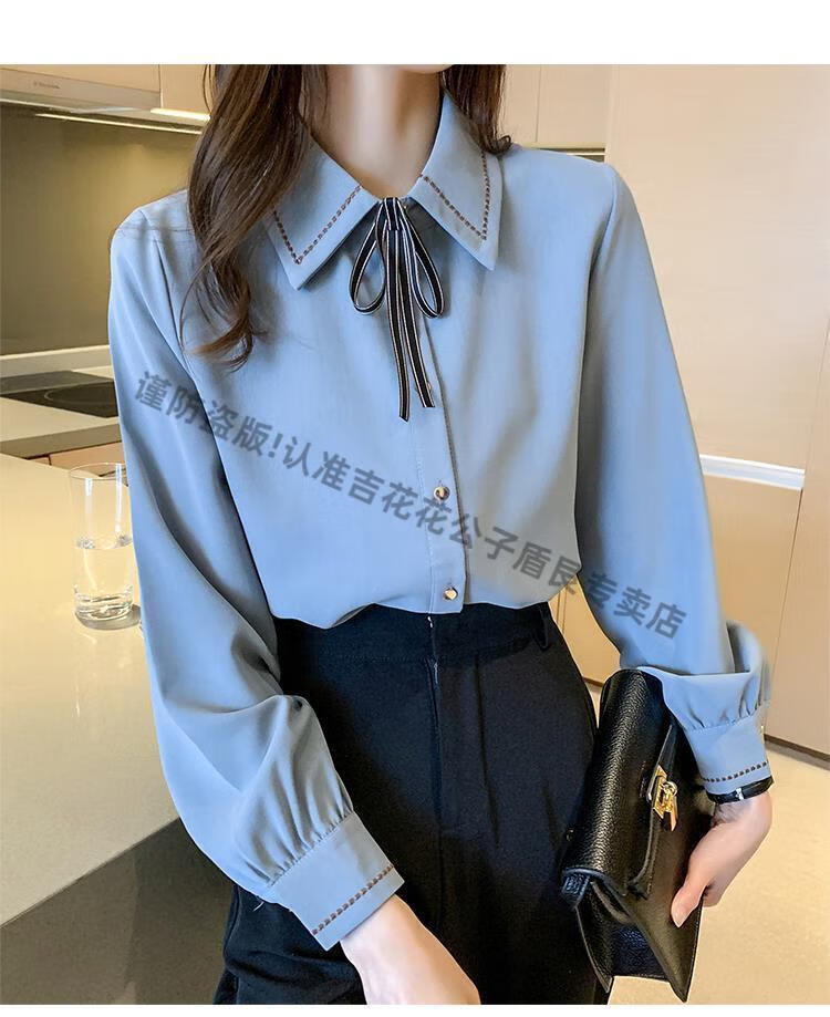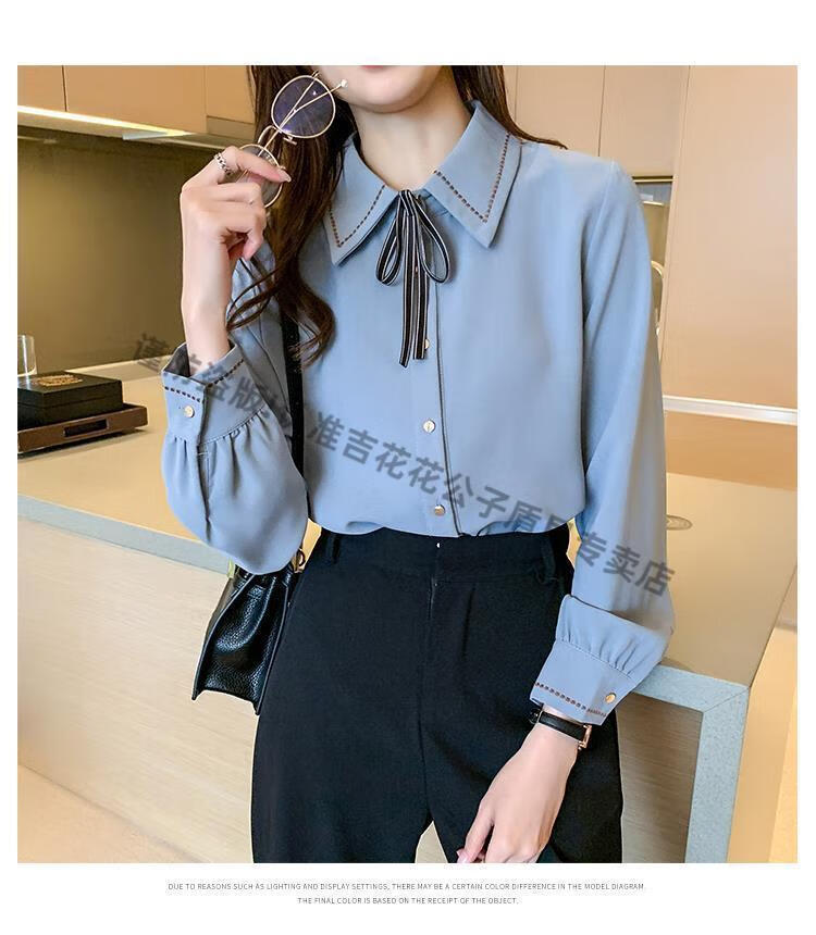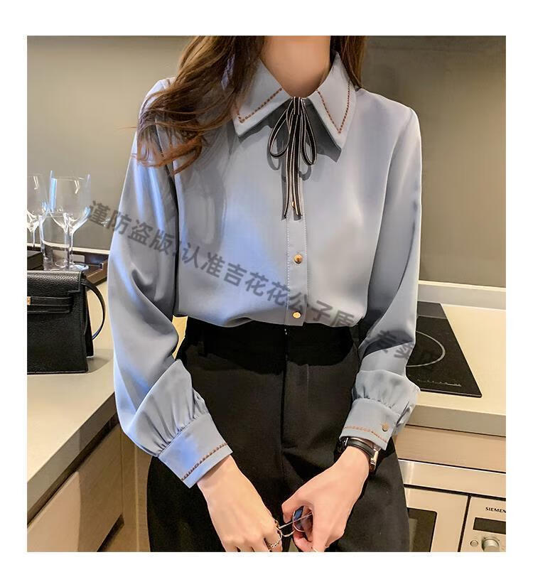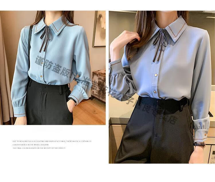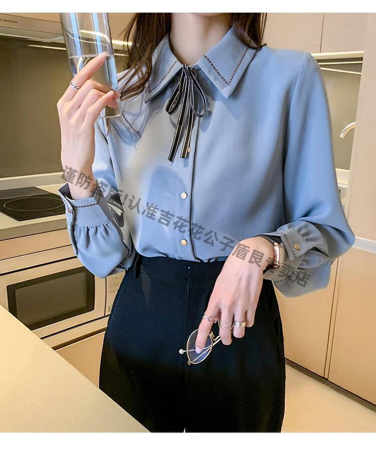 Playboy (PLAYBOY) autumn new chiffon shirt women's top bow tie lapel versatile polo collar shirt long-sleeved bottoming shirt blue XL 125-140Jin Jin equals 0.5 kg