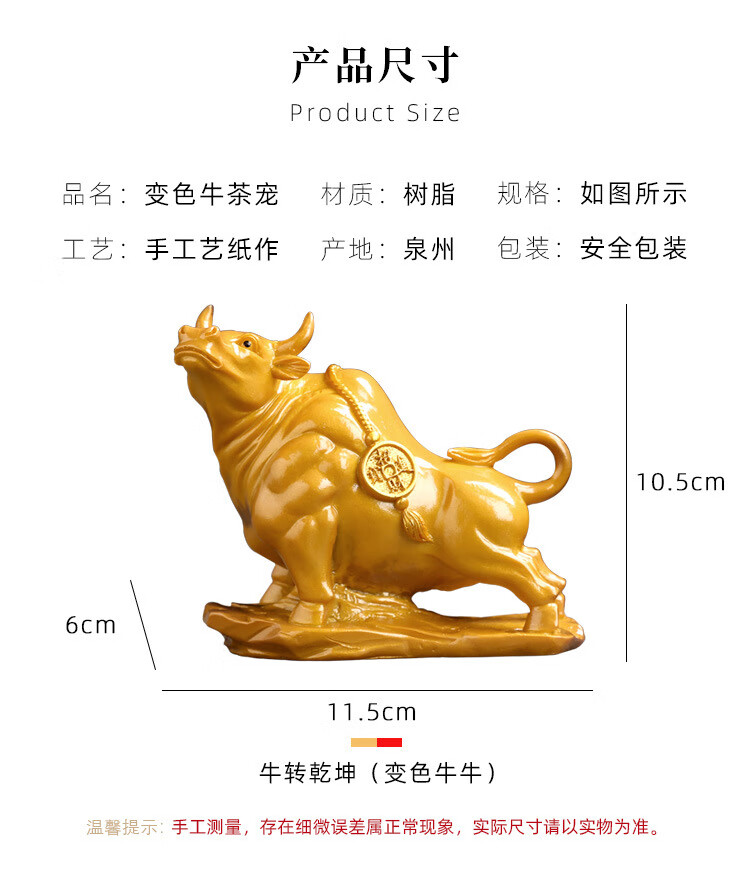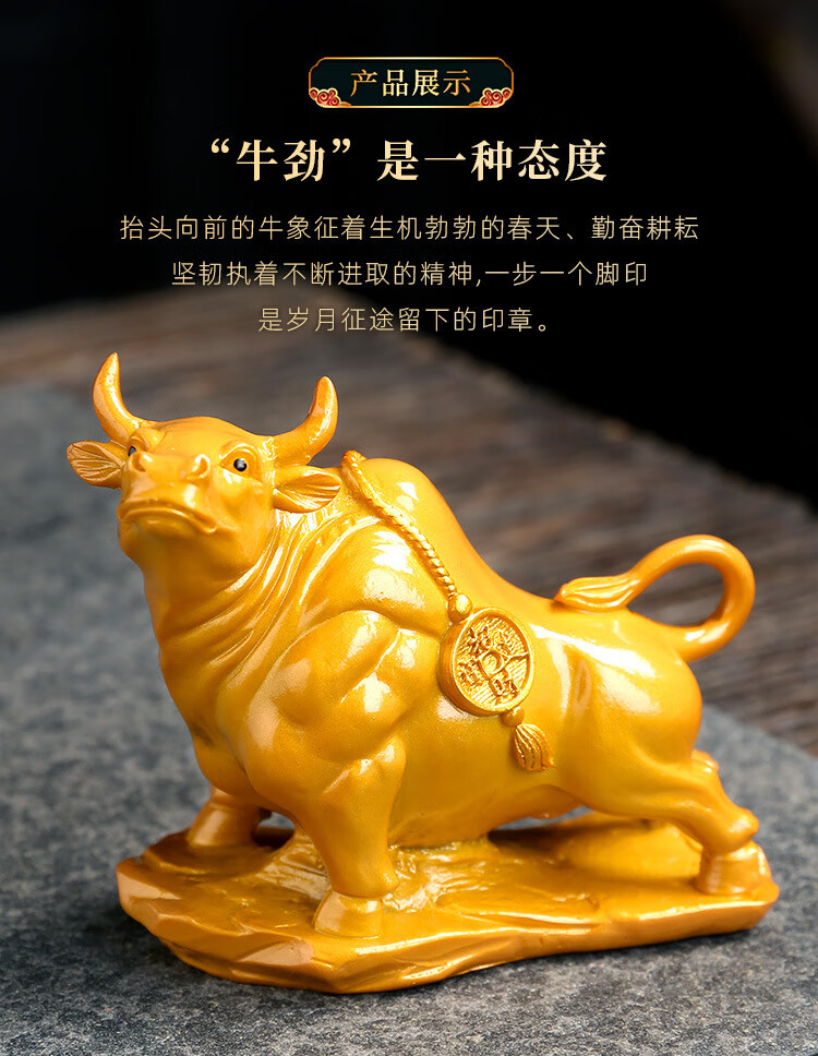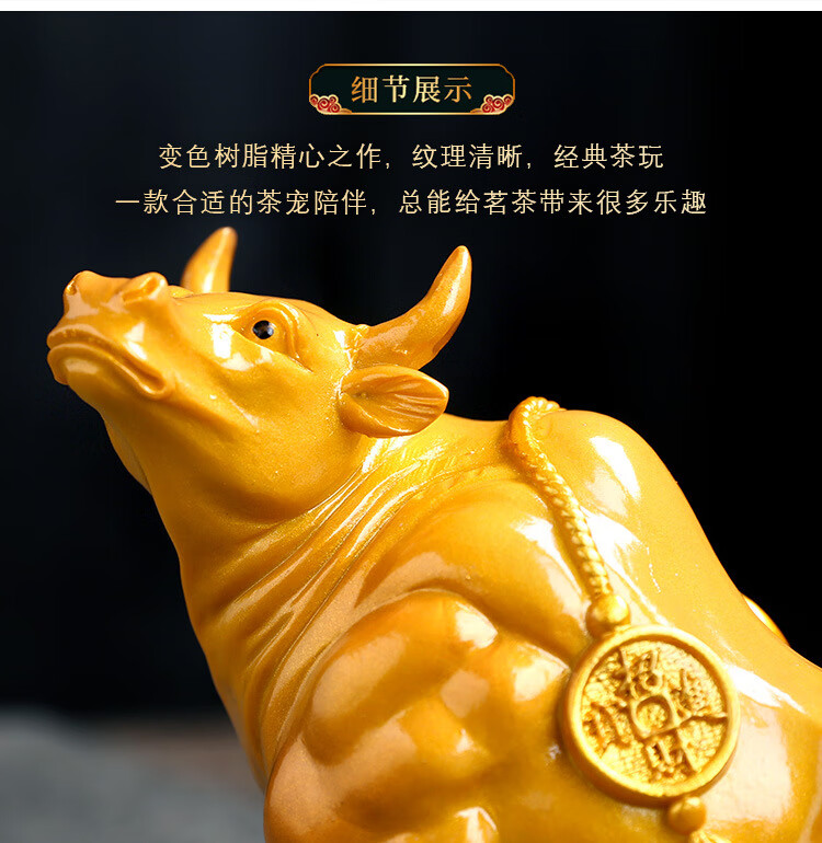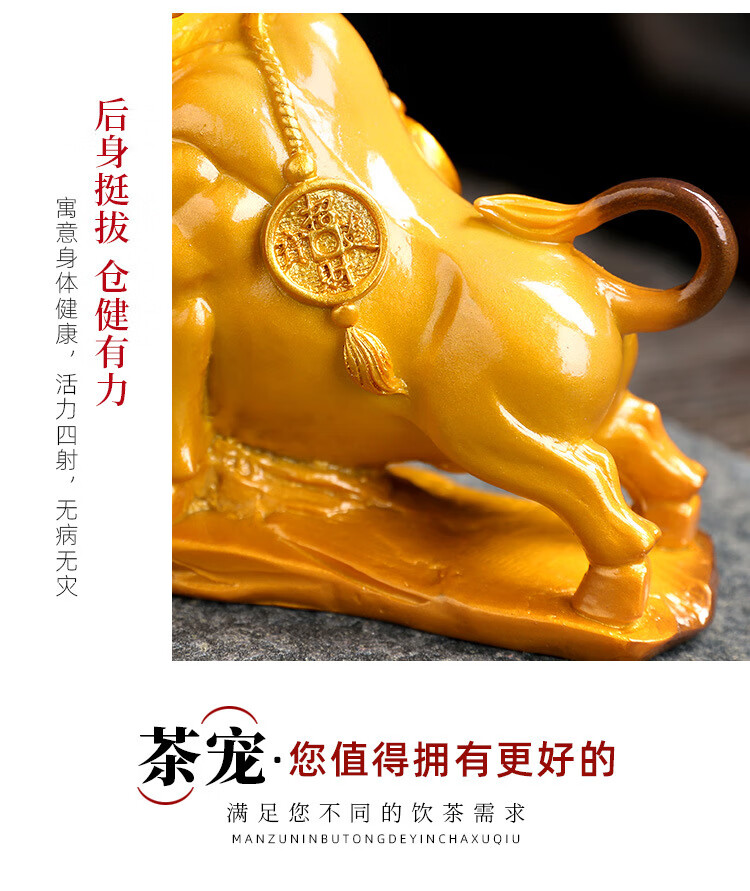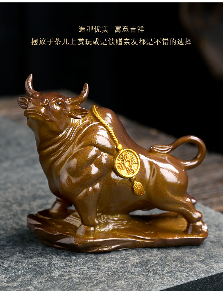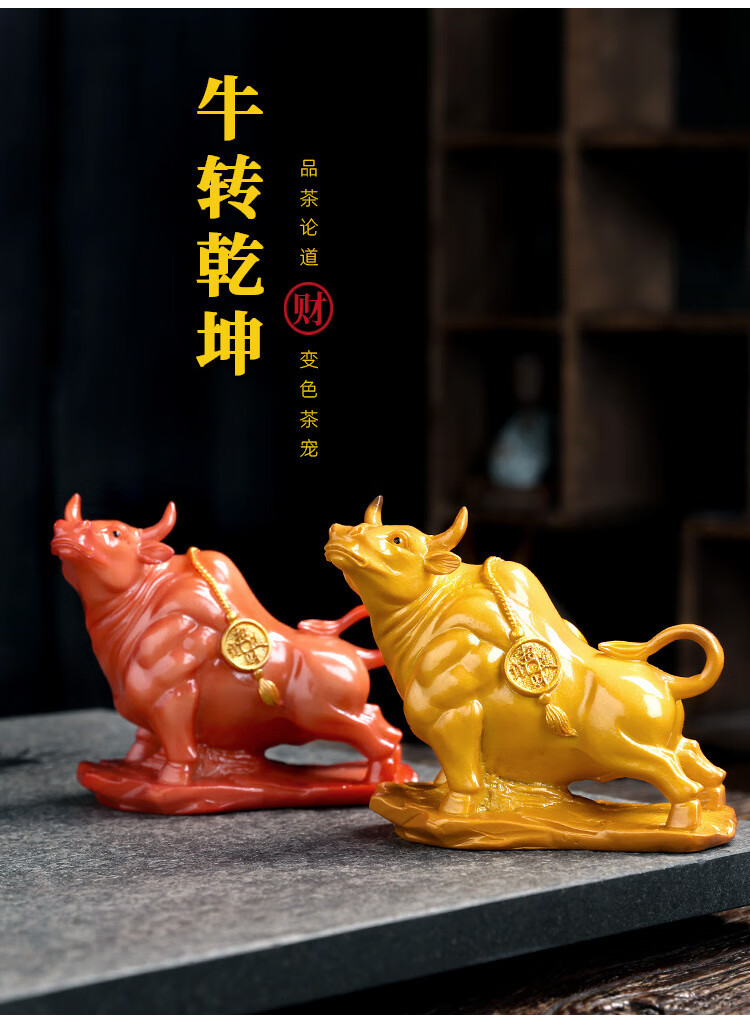 Carved feather color changing tea pet cow small ornaments boutique can be raised tea table decoration buffalo tea table tea tray tea play tea tray tea set decoration gift box style cow turns to heaven and earth (gold)
