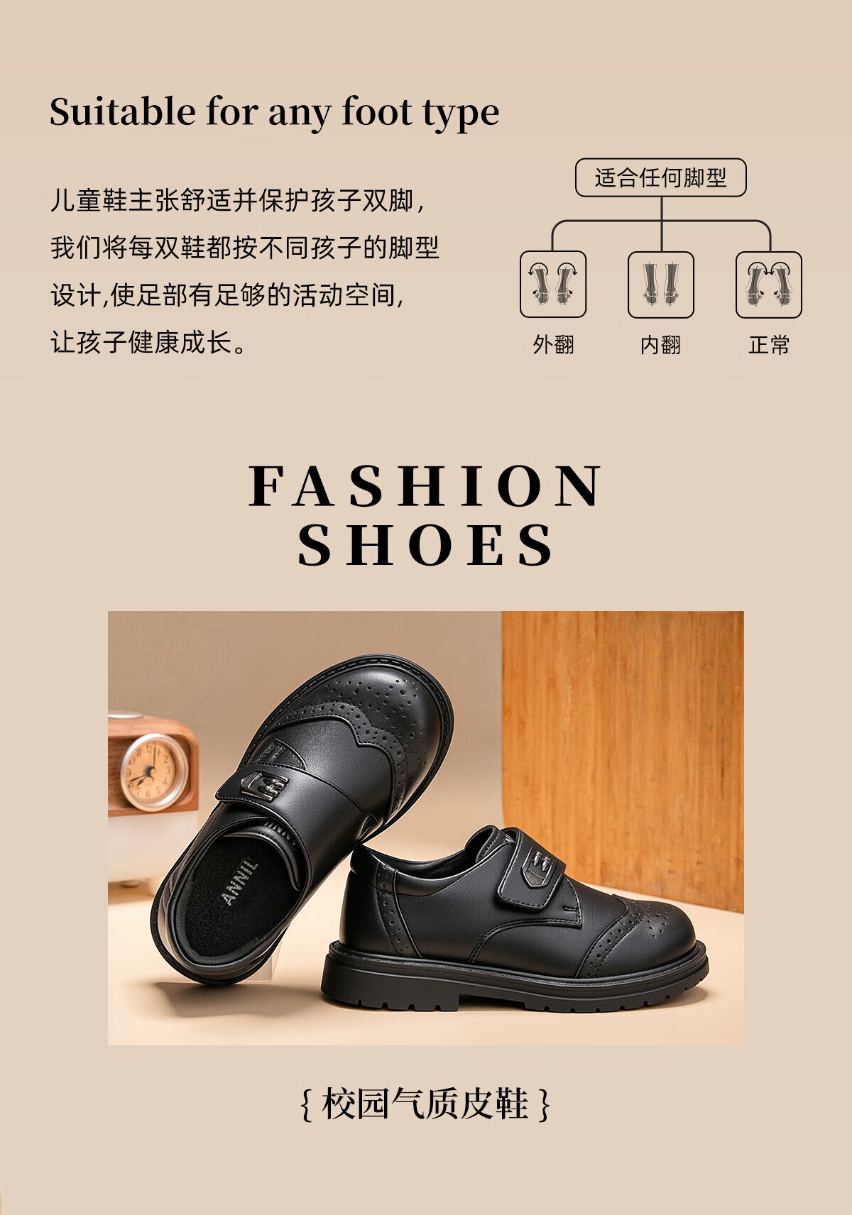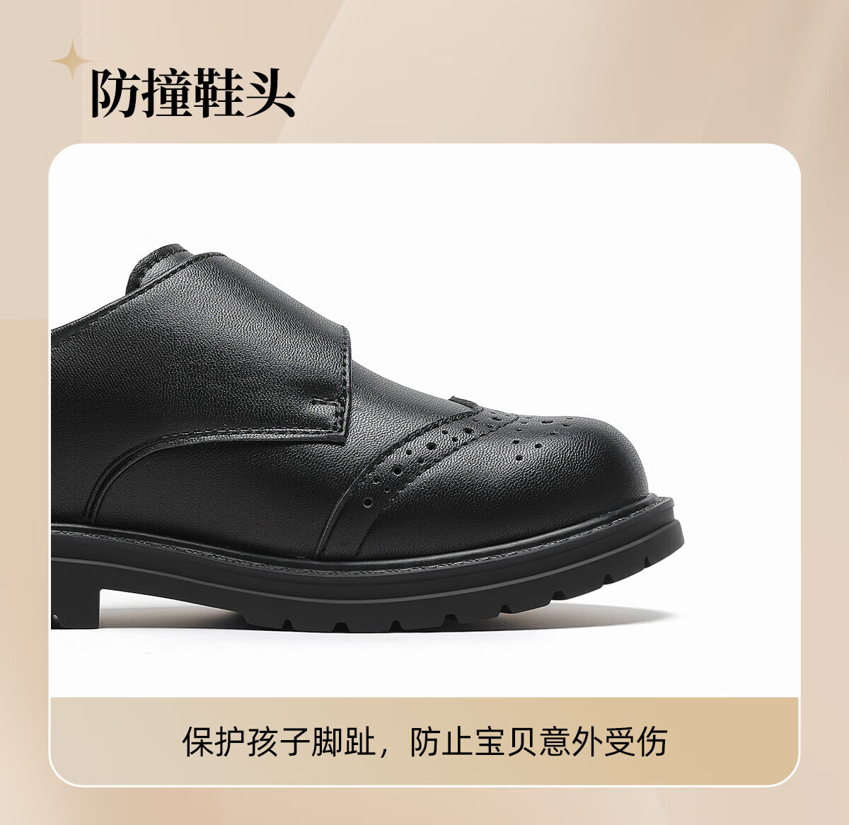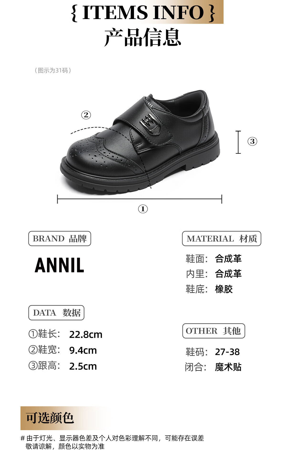 Annil (Annil) boys' leather shoes 2025 new performance small leather shoes children's leather shoes black medium and large children's black leather shoes boys 2477 black 35 inner length 22.6cm/foot length 21.6-22cm