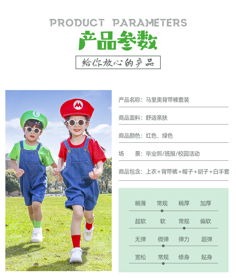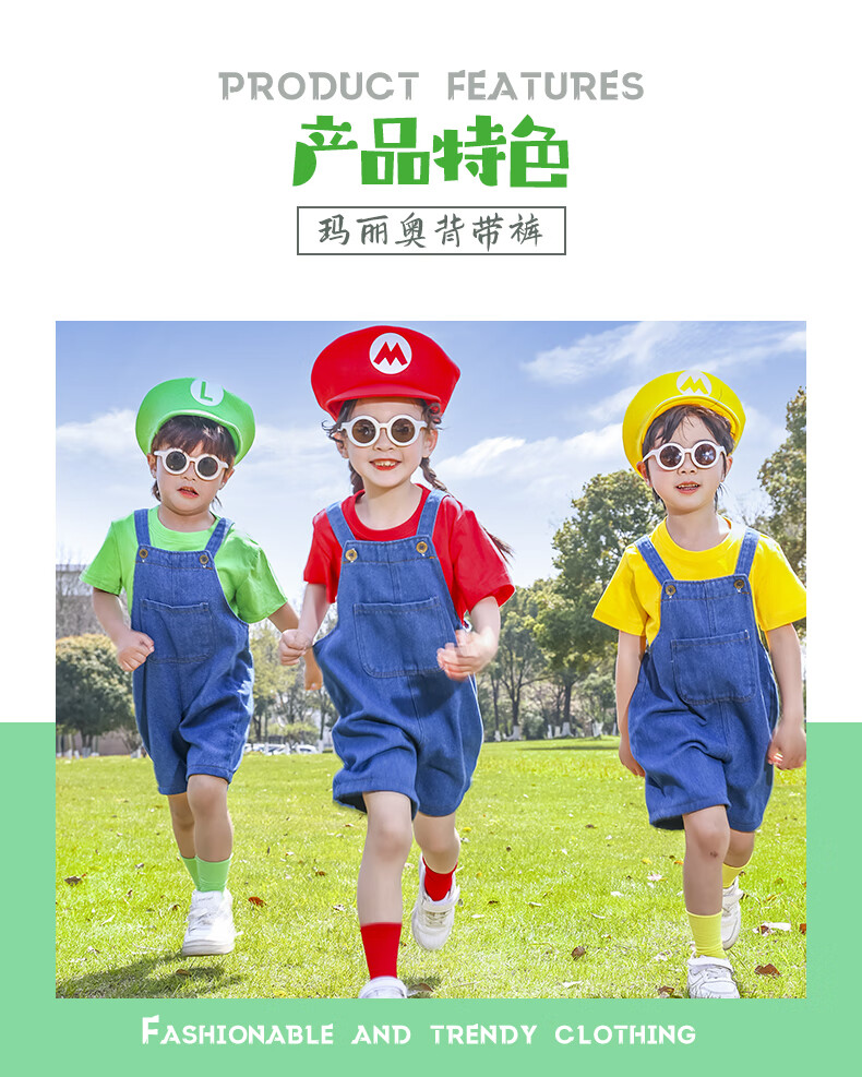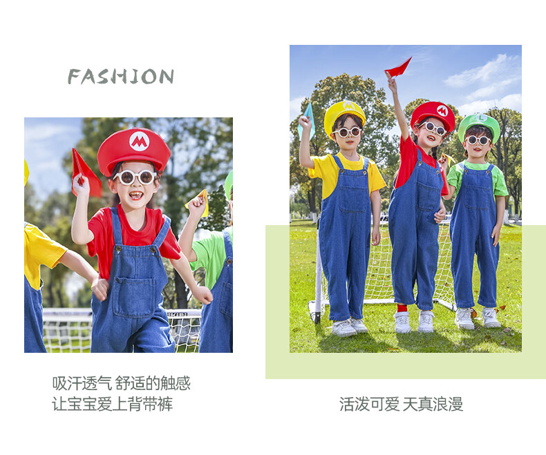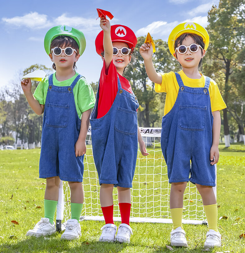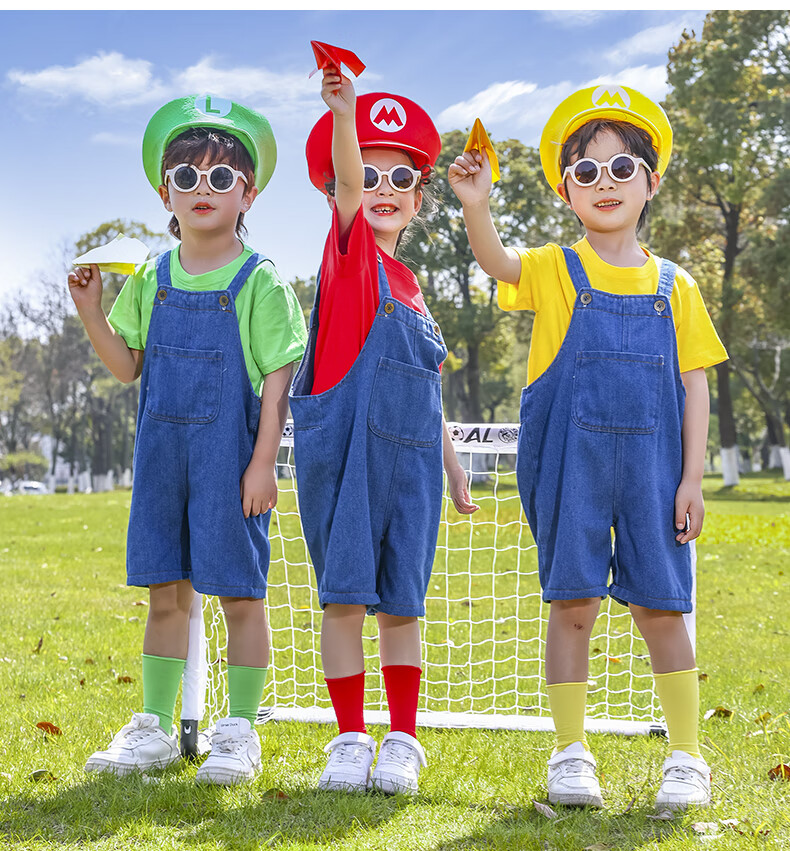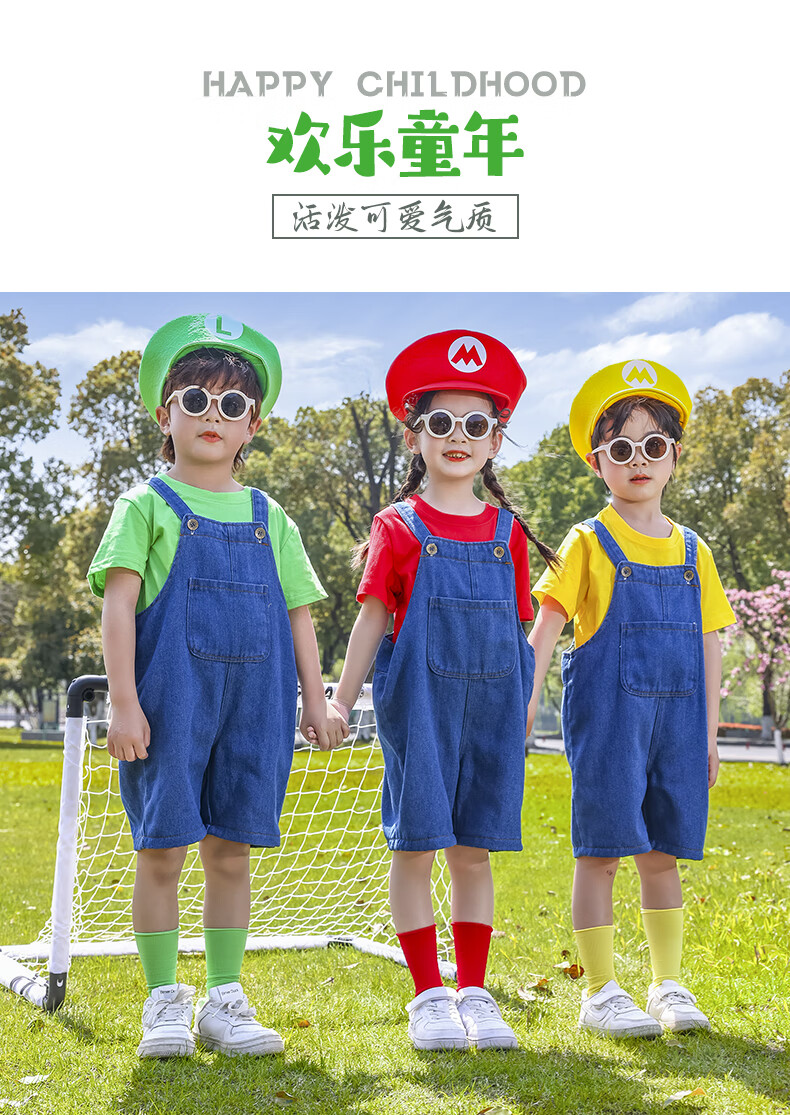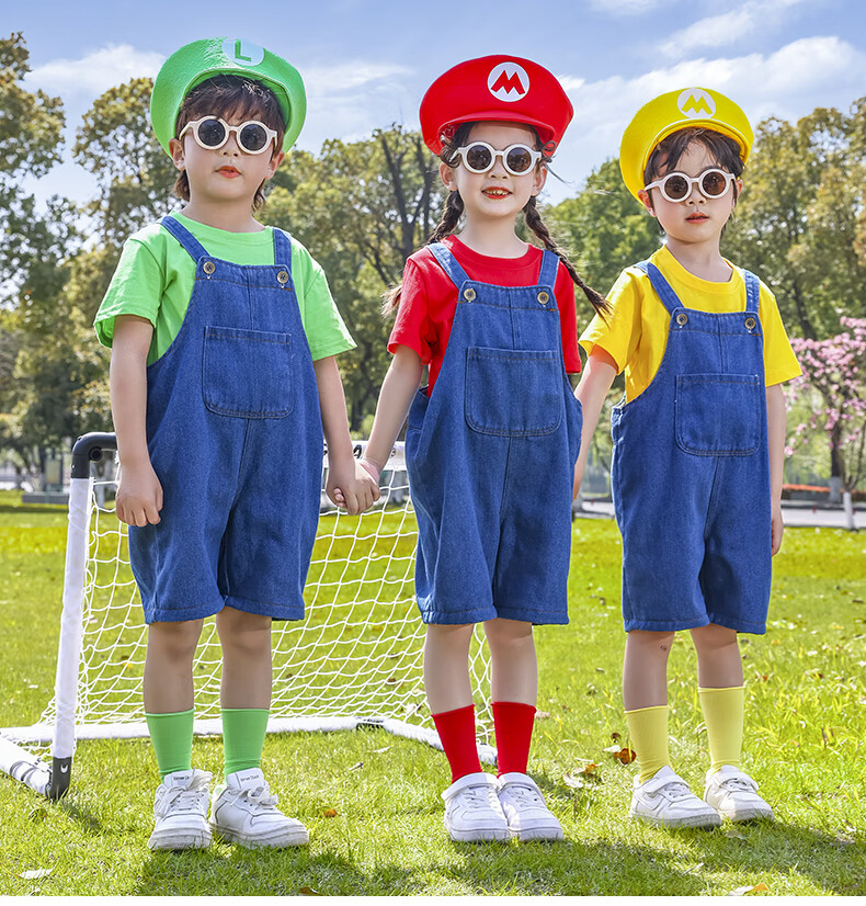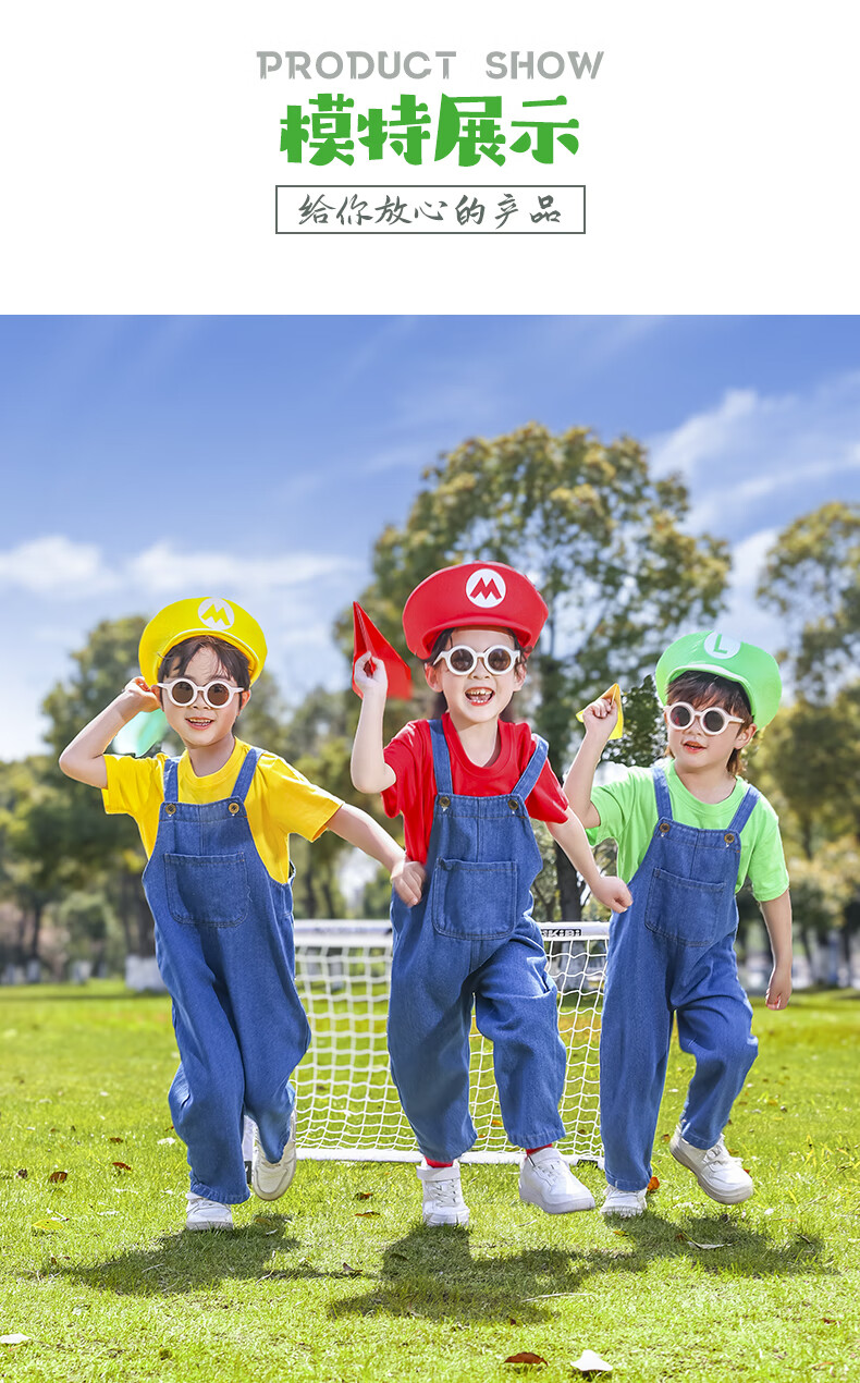 Kaikaijia children's performance clothing kindergarten cos Mary Mario overalls suit boys and girls performance clothing children red short-sleeved + denim short overalls free socks of the same color 100cm suitable for heights below 90cm