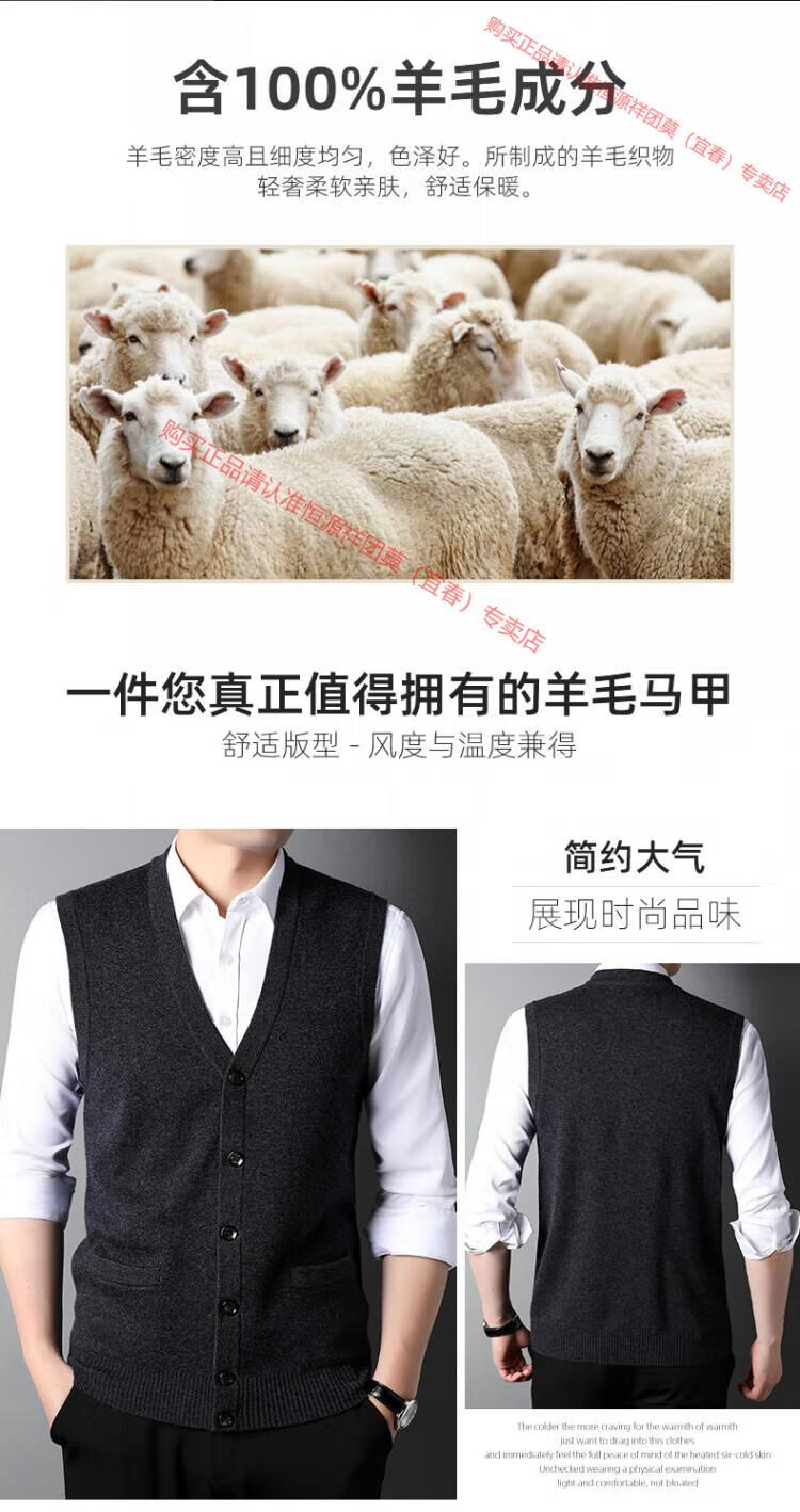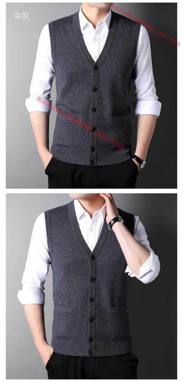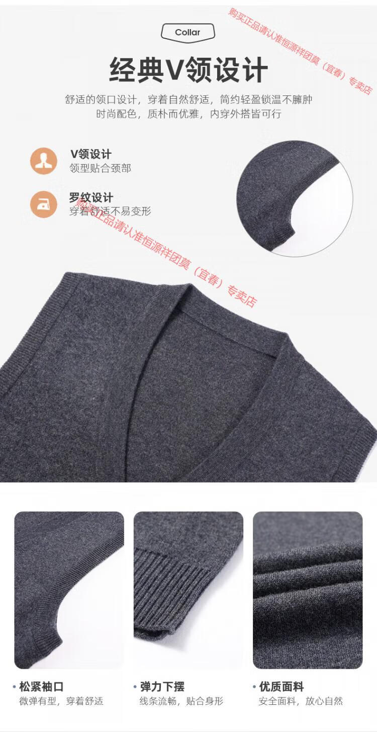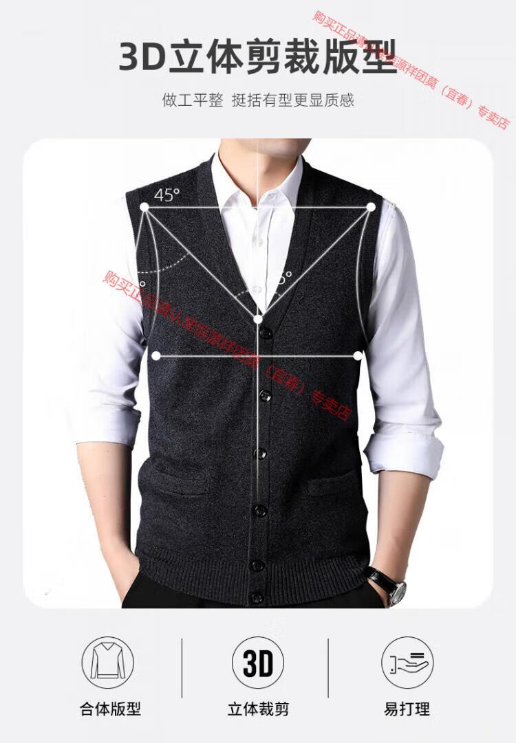 恒源祥100%纯羊毛衫背心男V领爸爸装中老年男士马甲坎肩毛衣开衫打底衫 深灰色 M 170/88A