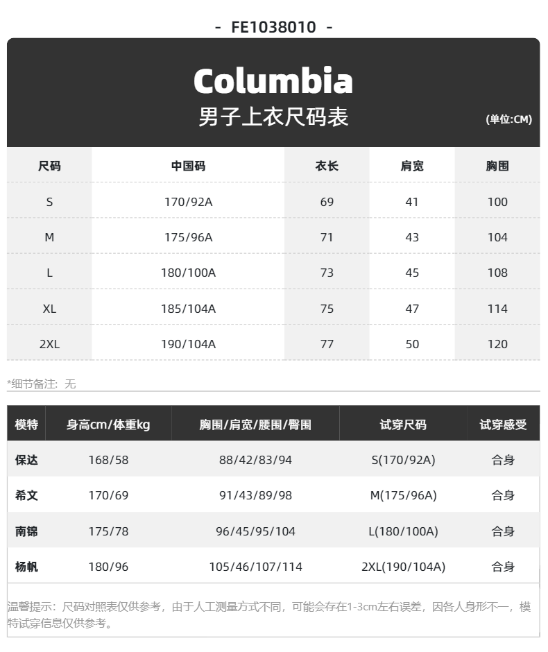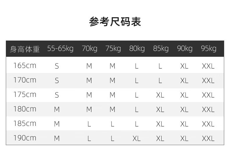 China (cm) 165 / 88-90 170 / 96-98 175 / 108-110 180 / 118-122 185 / 126-130