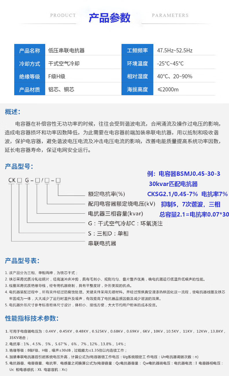 Shanghai Viscon CKSG2.1/0.45-7 reactive power compensation low-voltage three-phase series capacitor special reactor capacitance 25kvar 14%