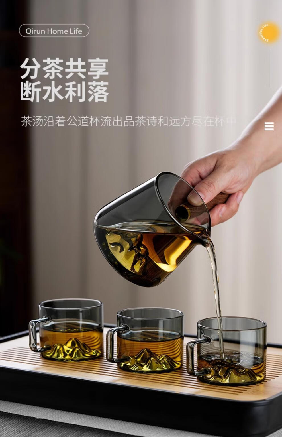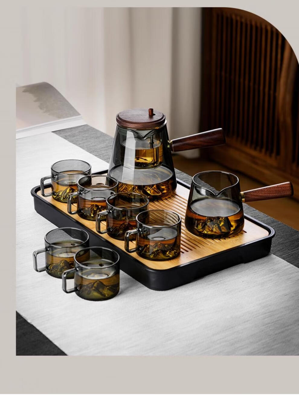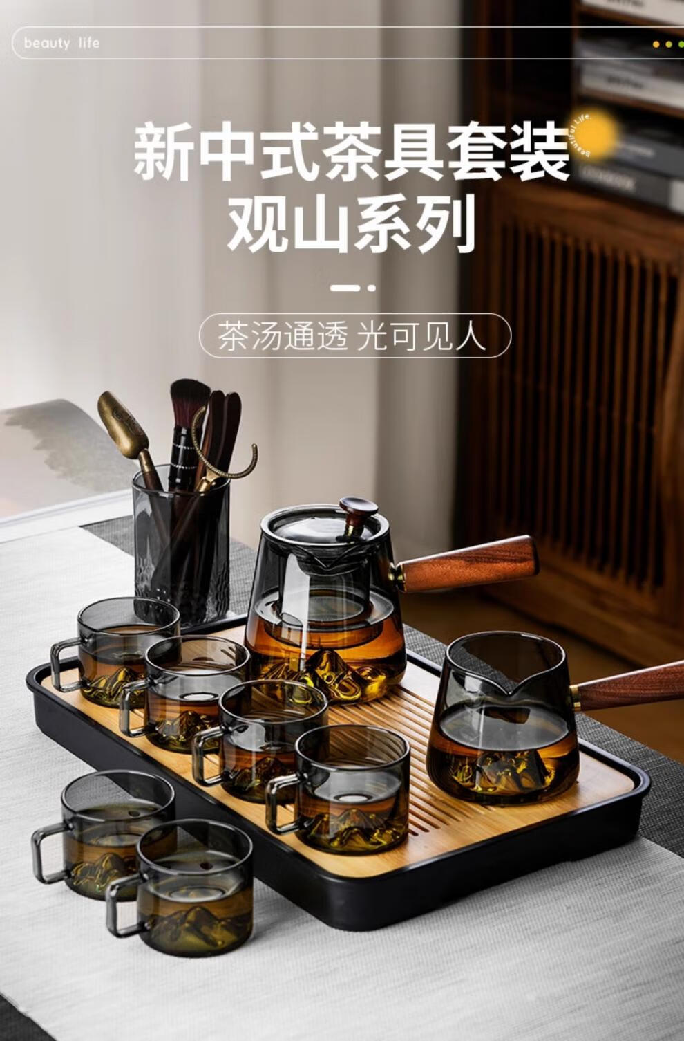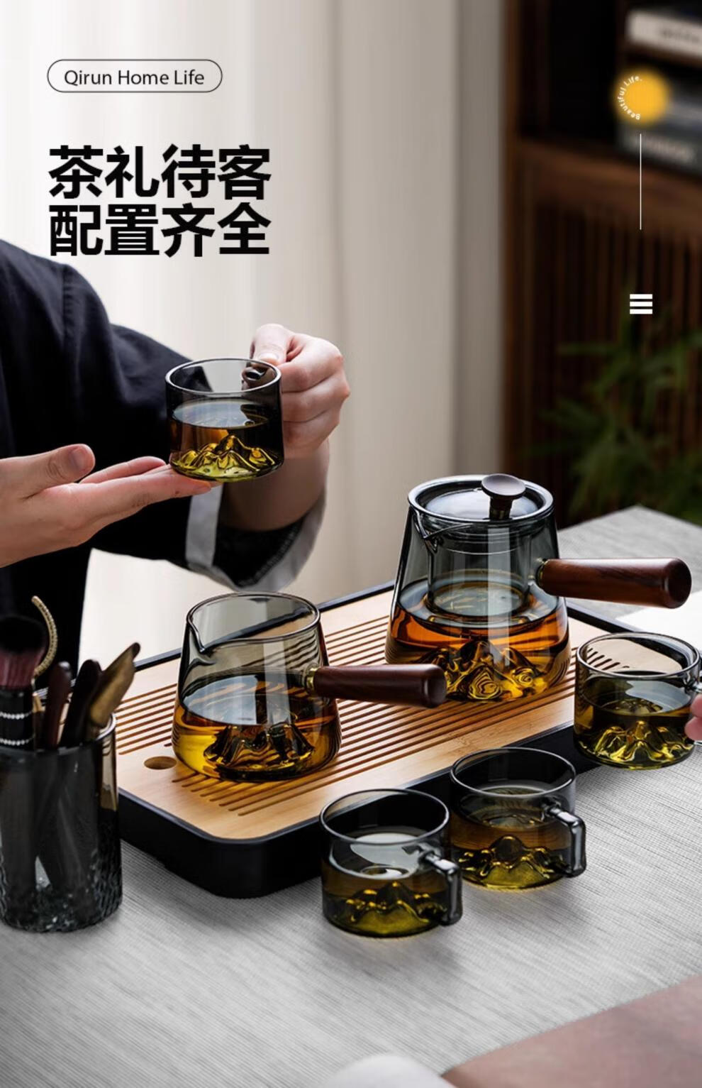 MZXM Japan imported quality glass tea set set for making tea, household tea tray, large capacity living room tea cup, office tea cup, transparent 600ml mountain view pot set, 8 pieces, complete set