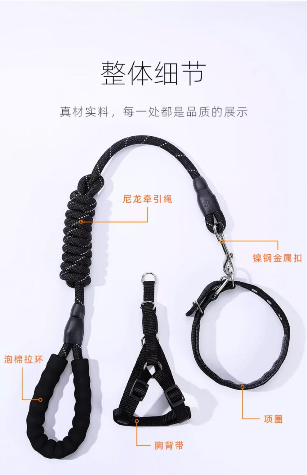 Dog leash 2 meters 3 meters long reflective dog rope large medium small dog Teddy Golden Retriever pet dog leash black three-piece set collar + chest + rope 1.5 meters S size about 5-12 Jin Jin equals 0.5 kg