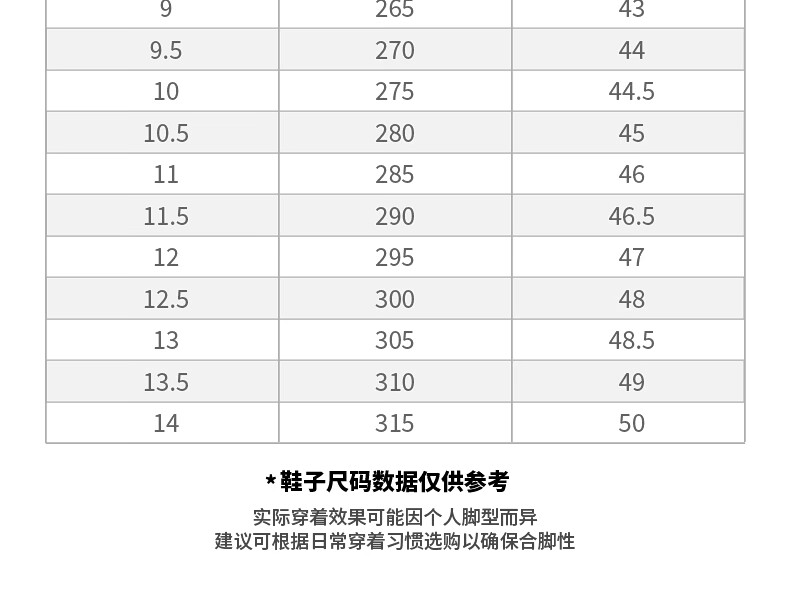 China (cm) 36 - 37 38 - 39 40 - 42 43 - 44 45 - 47