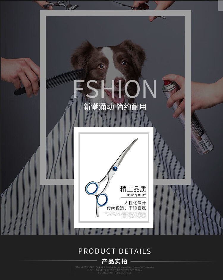 Ruoyu pet shearing scissors professional-grade set for dog hair clipping, dog hair grooming, full set of cat hair scissors, seven-piece set, blue screws and blue finger ring, including four scissors + comb + cloth + storage bag