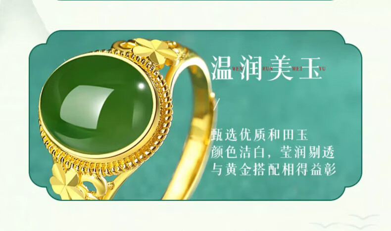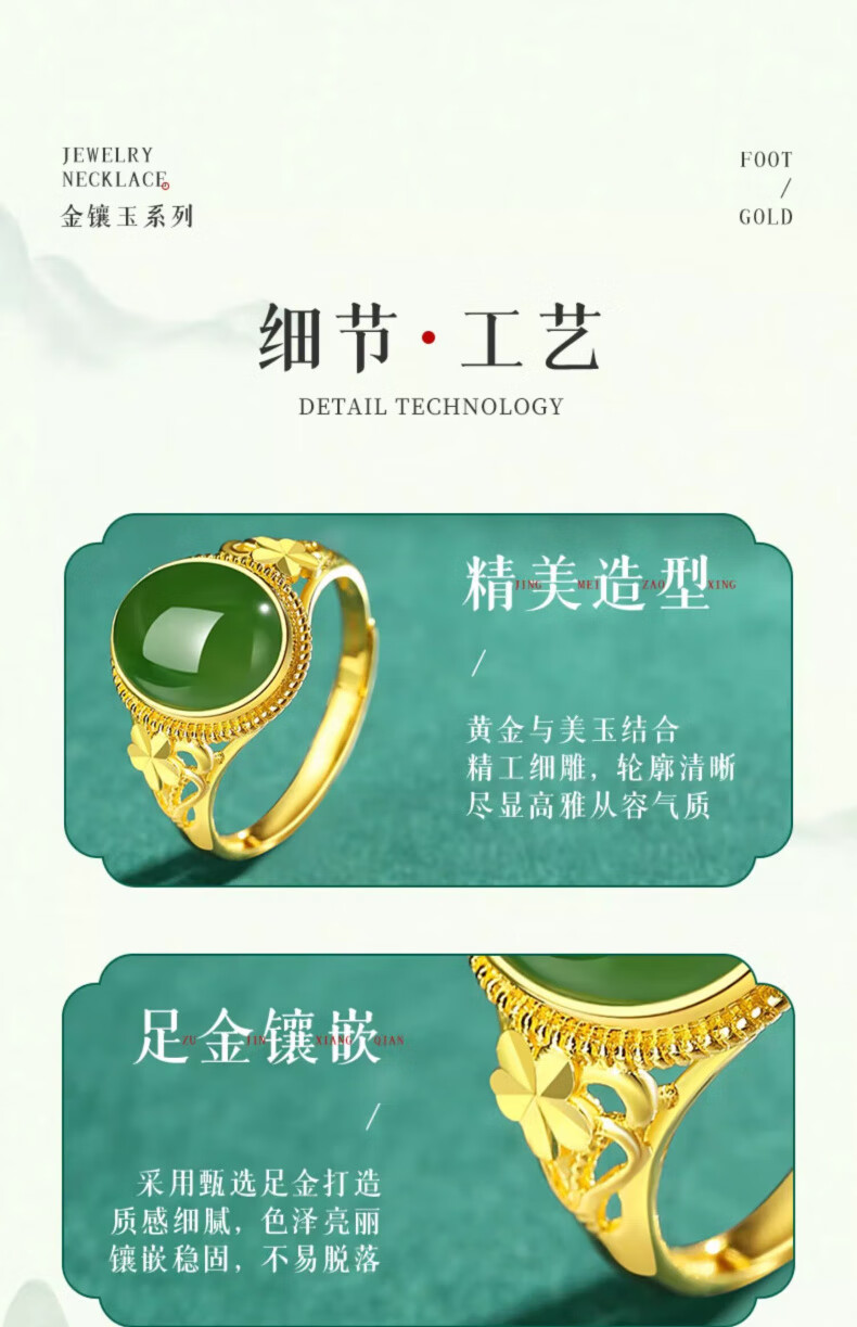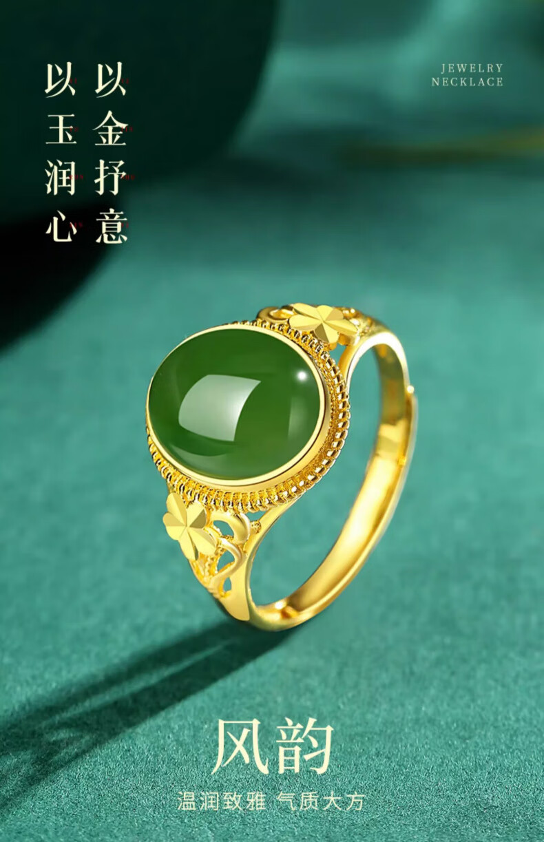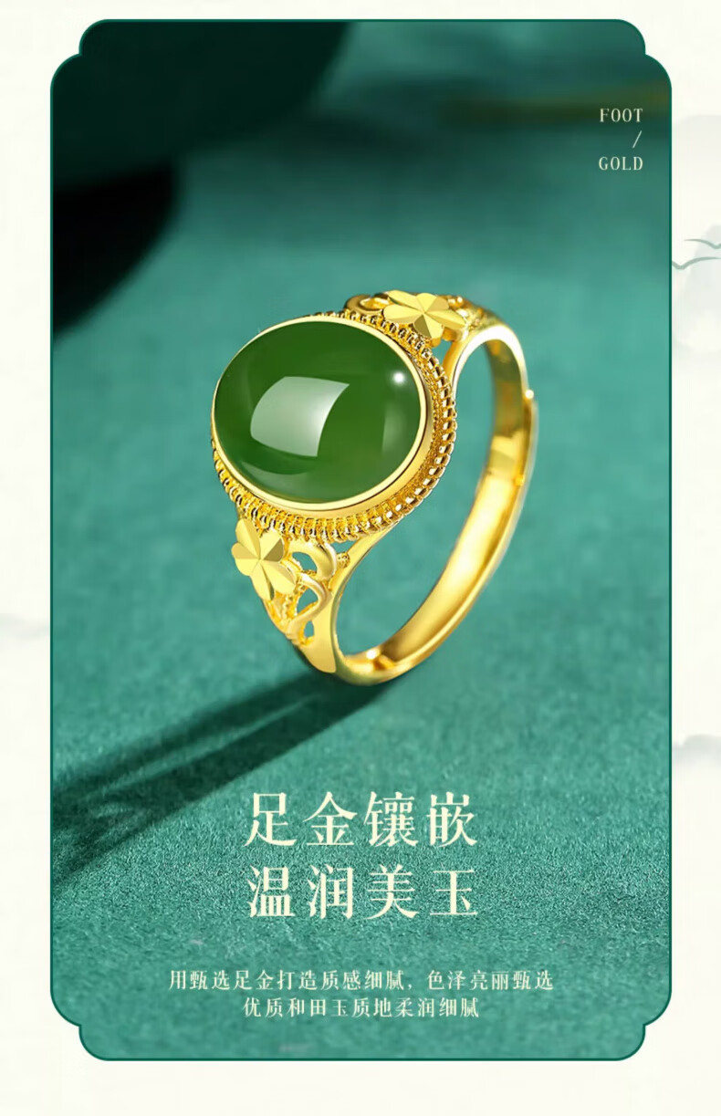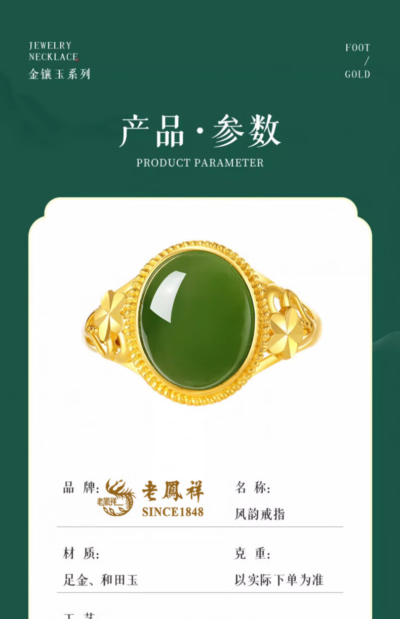 Lao Fengxiang new Chinese style gold inlaid jade jasper ring Hetian jade pigeon egg ring Chinese Valentine's Day birthday gift for girlfriend and wife Pure gold gold inlaid jade ring - about 3.1g Valentine's Day gift box