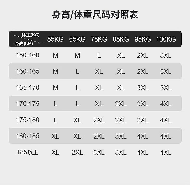 China (cm) 165 / 88-90 170 / 96-98 175 / 108-110 180 / 118-122 185 / 126-130