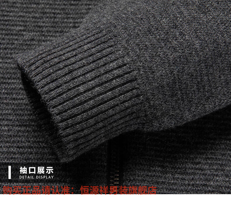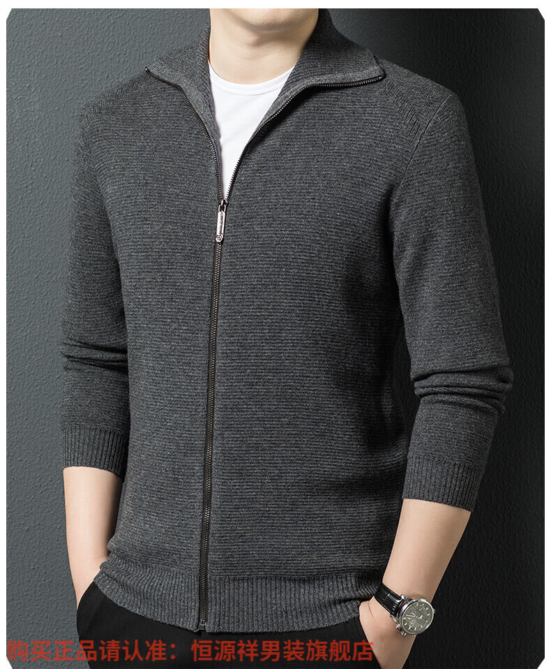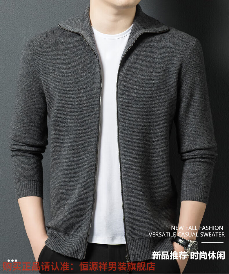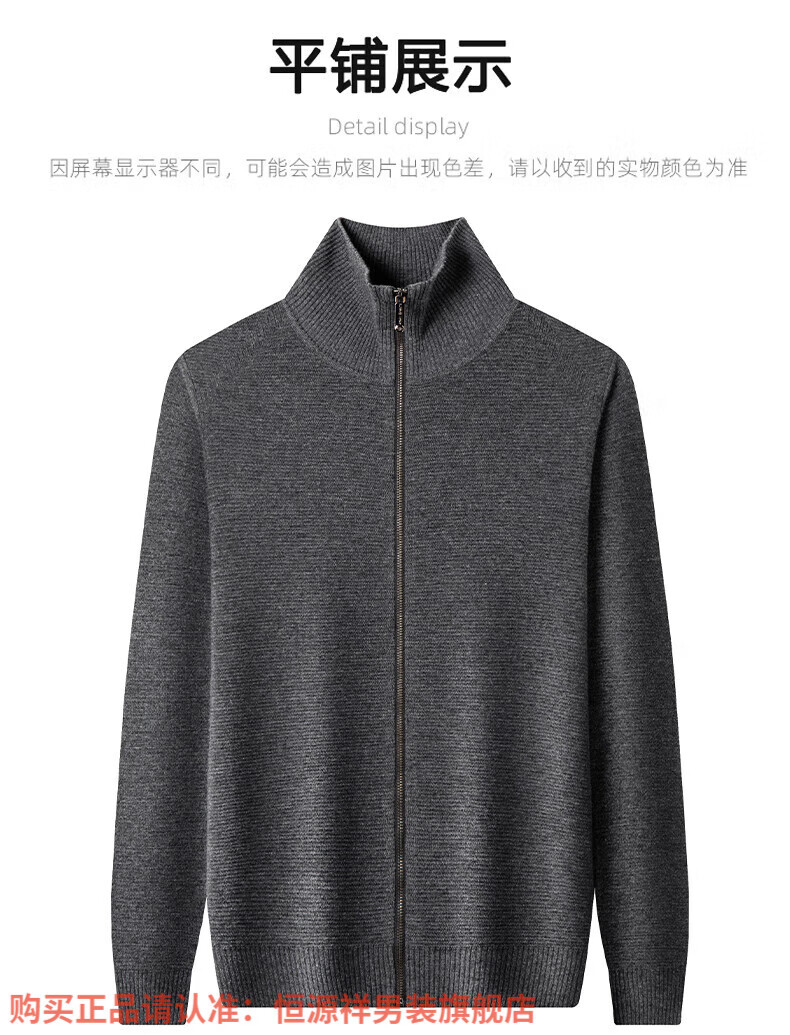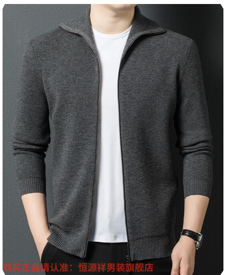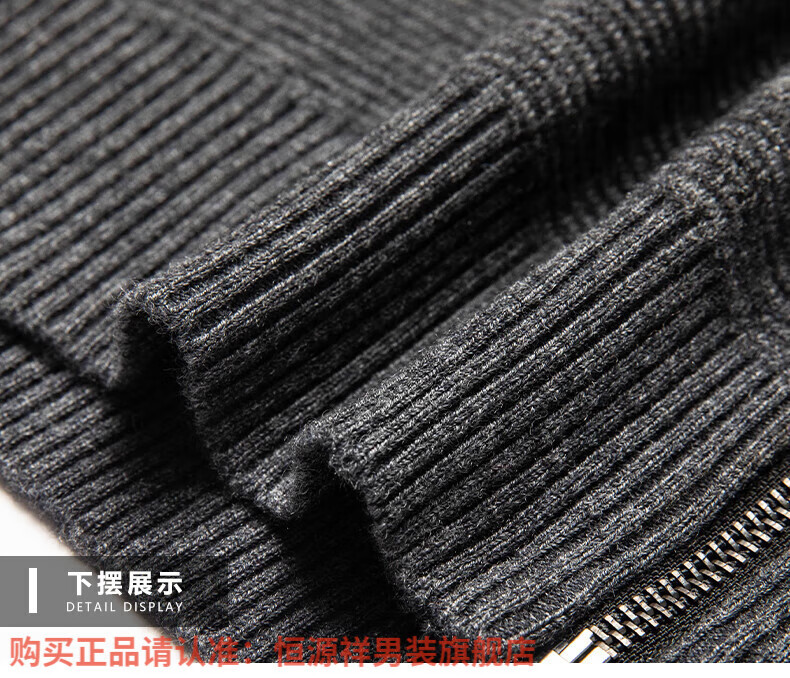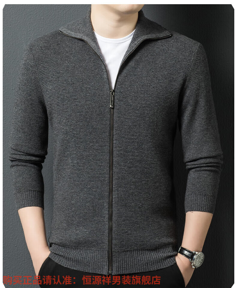 Hengyuanxiang high-end 100% wool sweater men's zipper jacket high collar thickened knitted cardigan autumn and winter casual men's sweater solid gray semi-worsted four-flat thickened 480g XL (180)