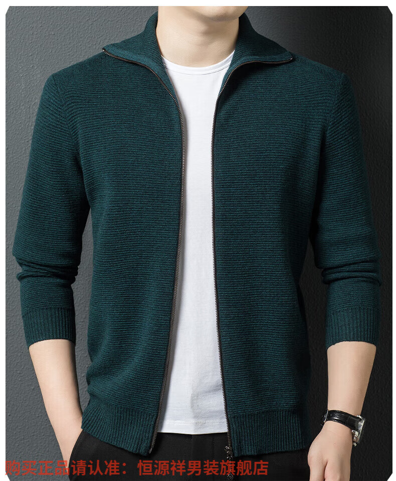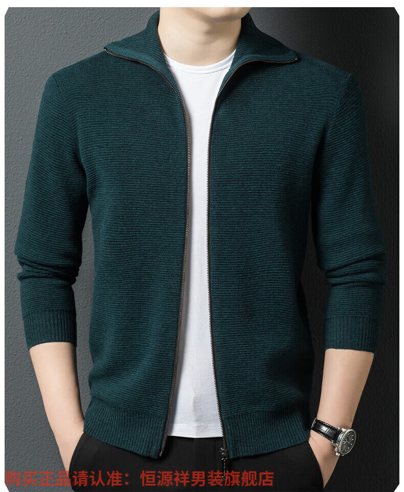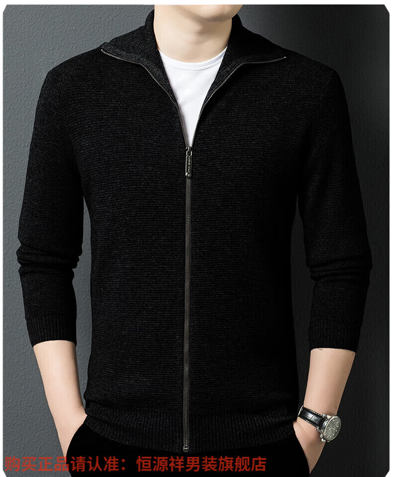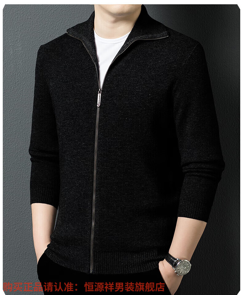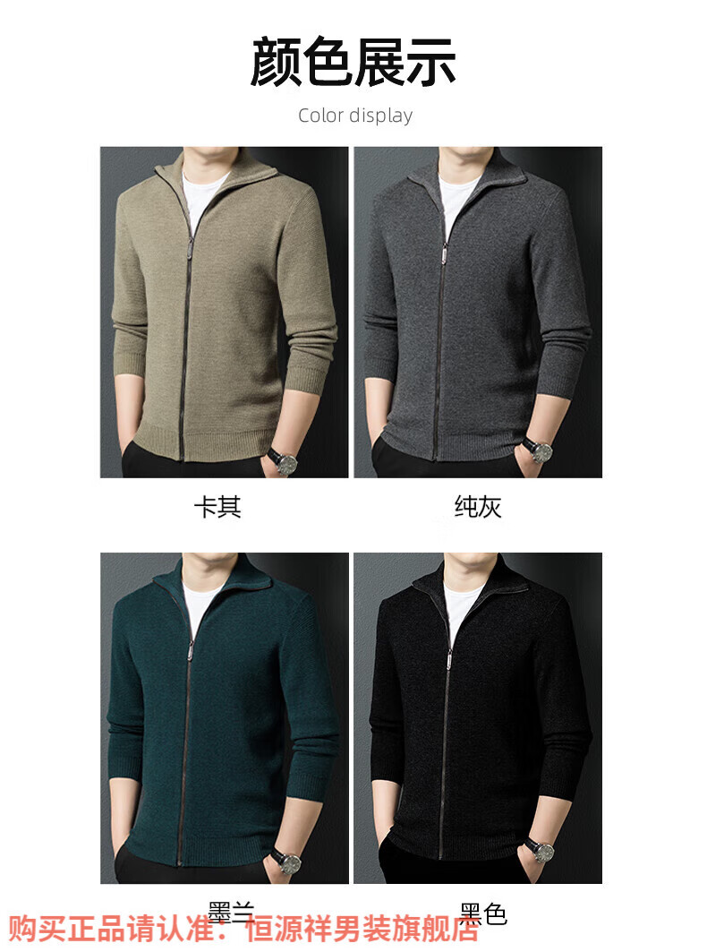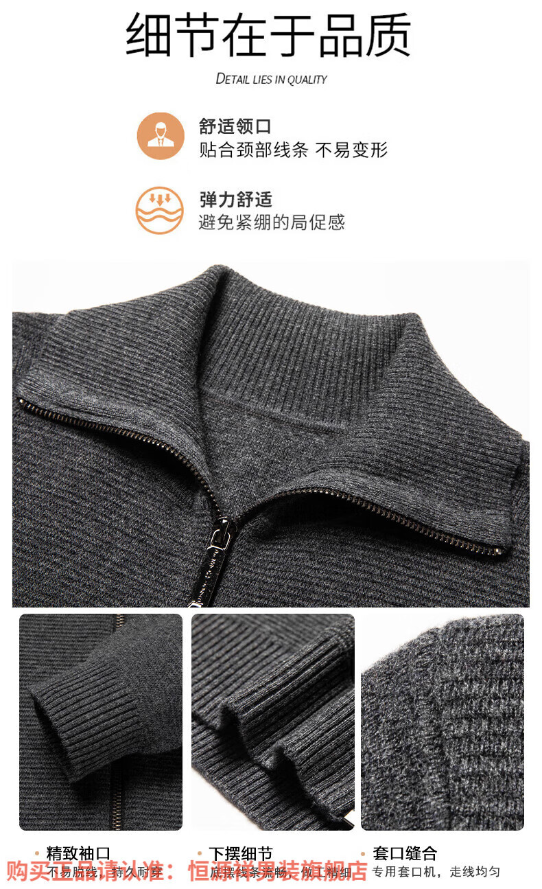 Hengyuanxiang high-end 100% wool sweater men's zipper jacket high collar thickened knitted cardigan autumn and winter casual men's sweater solid gray semi-worsted four-flat thickened 480g XL (180)
