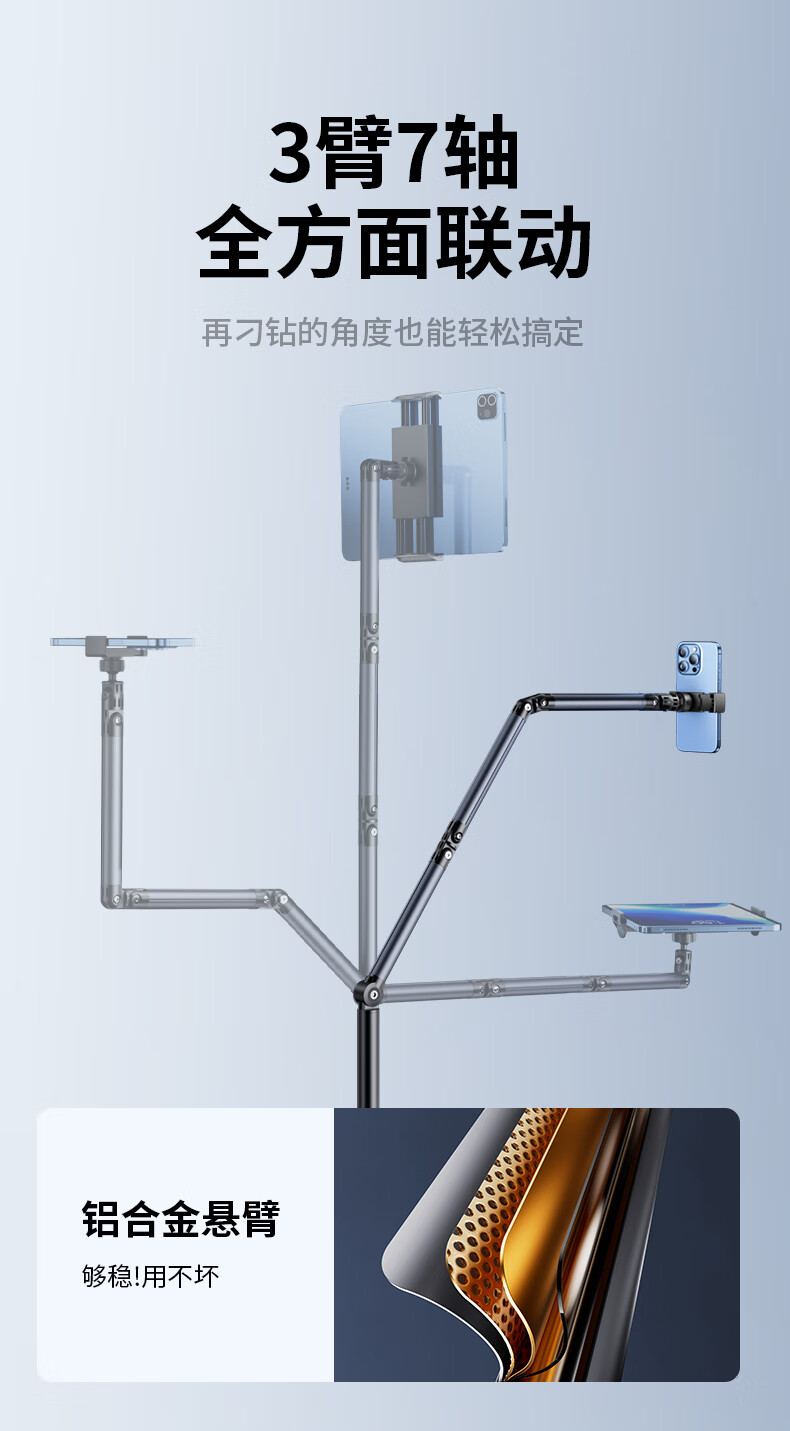 Jiahuacai Universal Pulley Mobile Phone Stand Floor-standing Overhead Shot 2025 New Wheeled Tablet Support Stand Multifunctional Bedside Lazy Bed Lying on the Drama Stand to Shoot Videos Universal Three Arms-Flagship Model Universal for Mobile Phones and Tablets