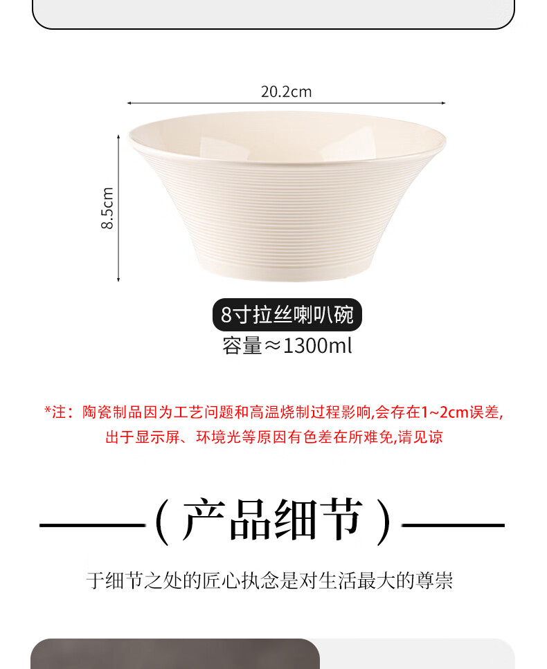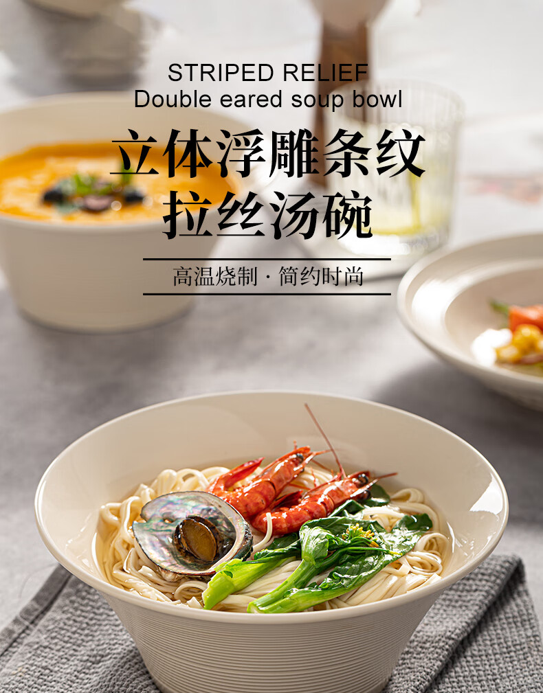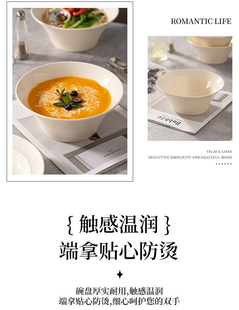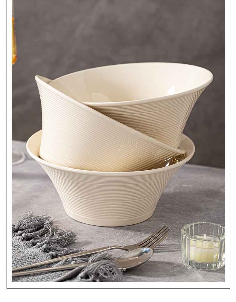 Cream threaded ceramic household noodle bowl, bamboo hat bowl, high-end ramen bowl, spicy snail noodle bowl, large soup bowl, 1 8-inch trumpet noodle bowl