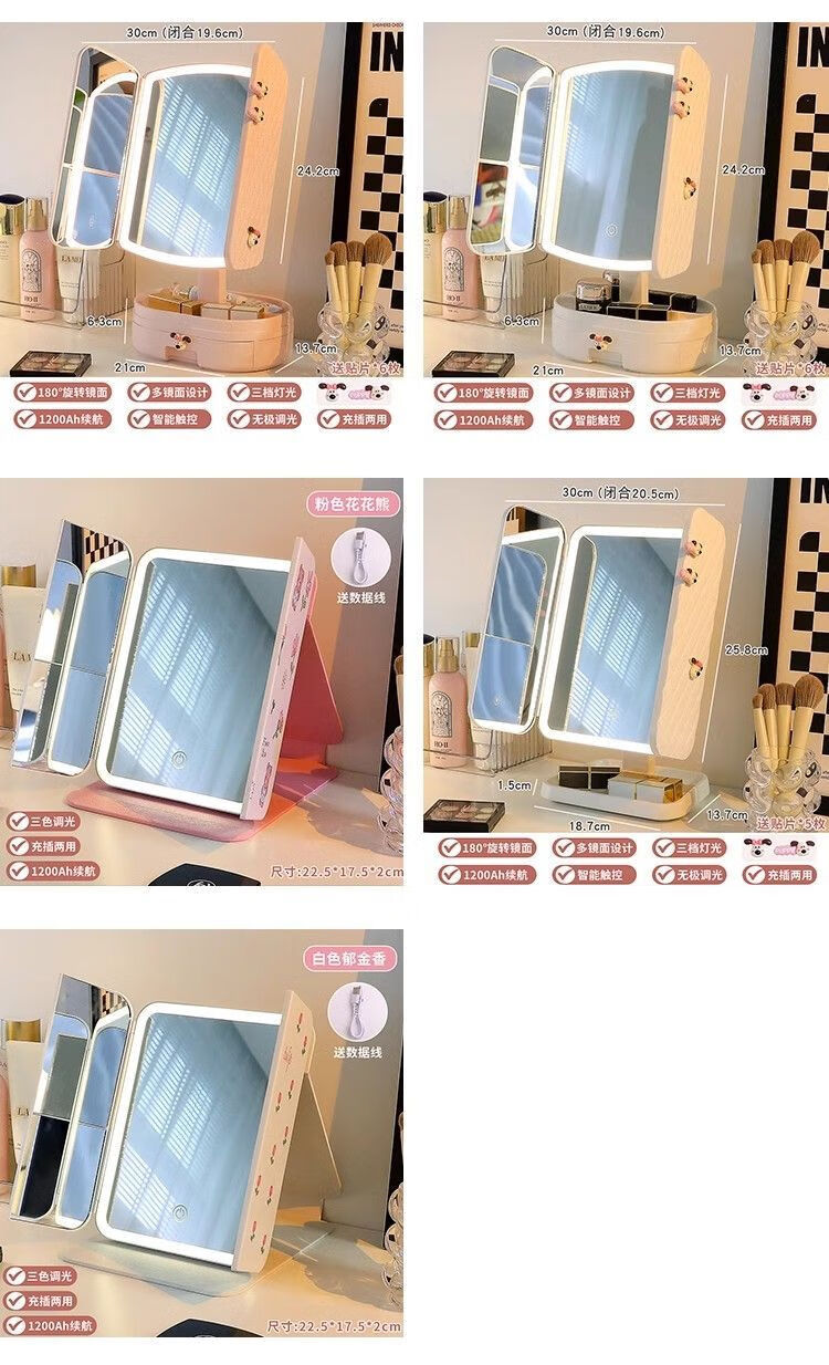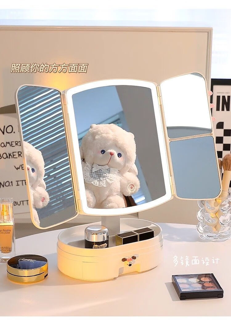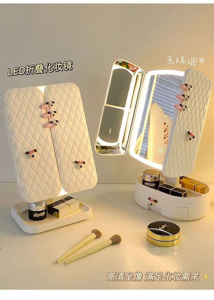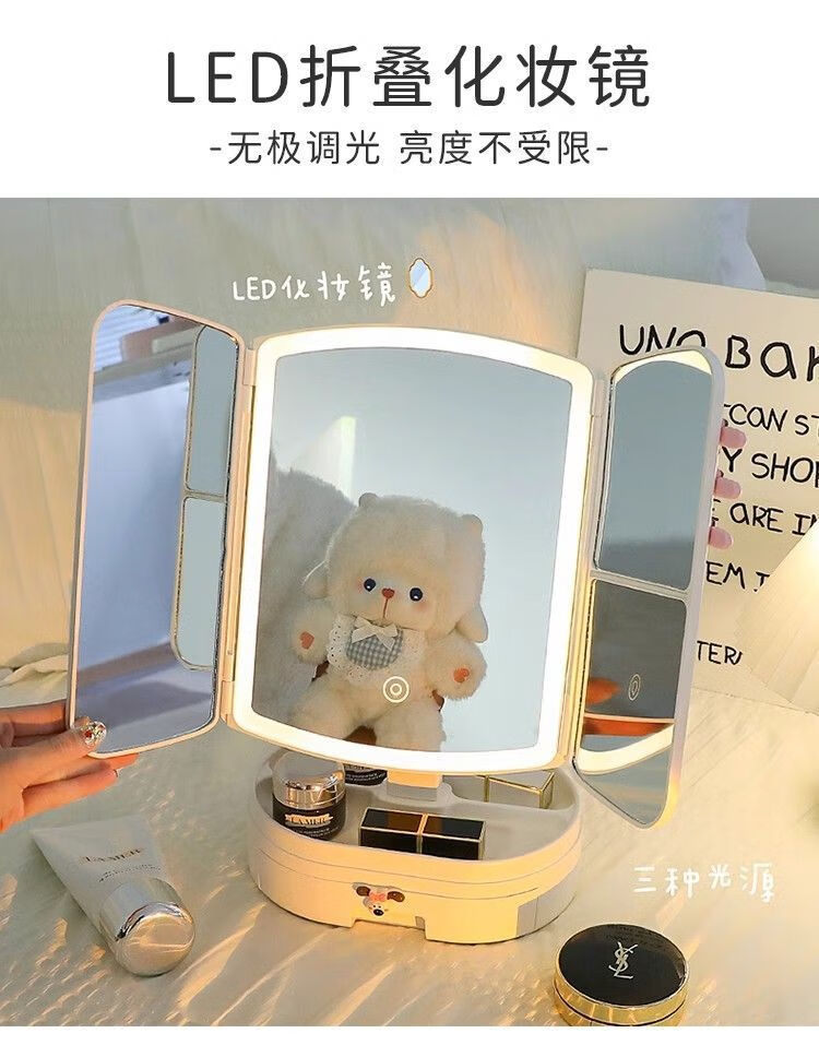 Cosmetic mirror with light desktop dresser mirror charging shell LED light vanity mirror 520 pink bear folding model three-color light stepless dimming丨comes with drawer