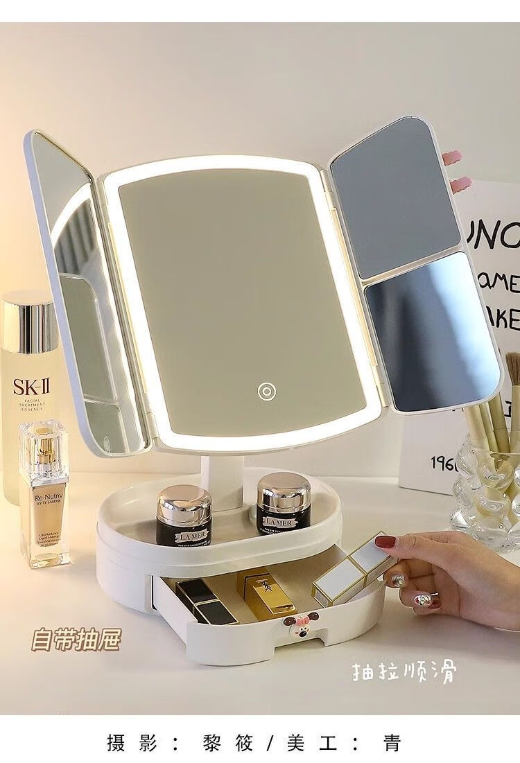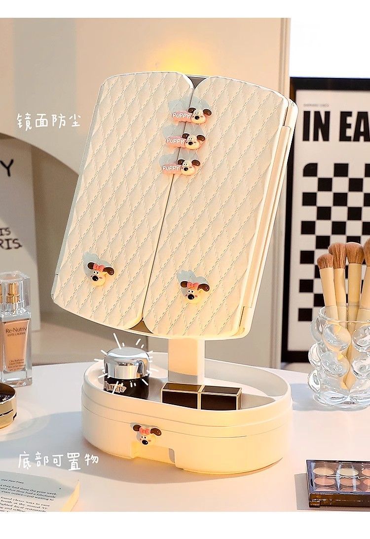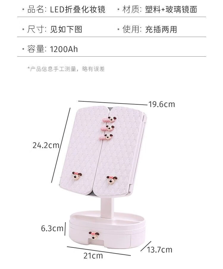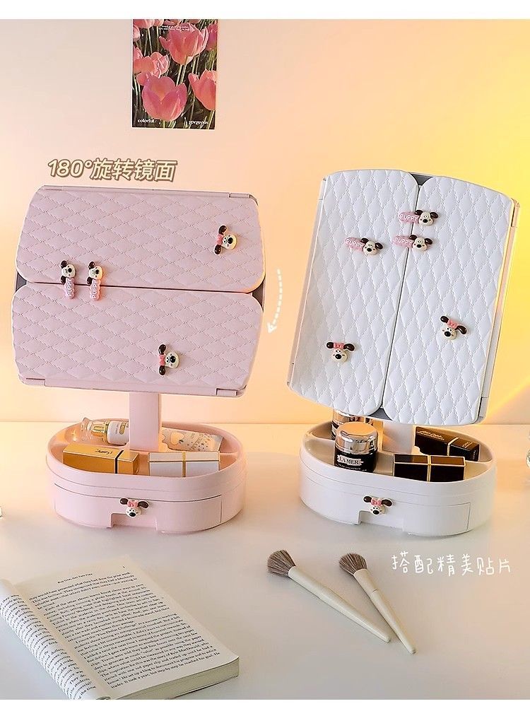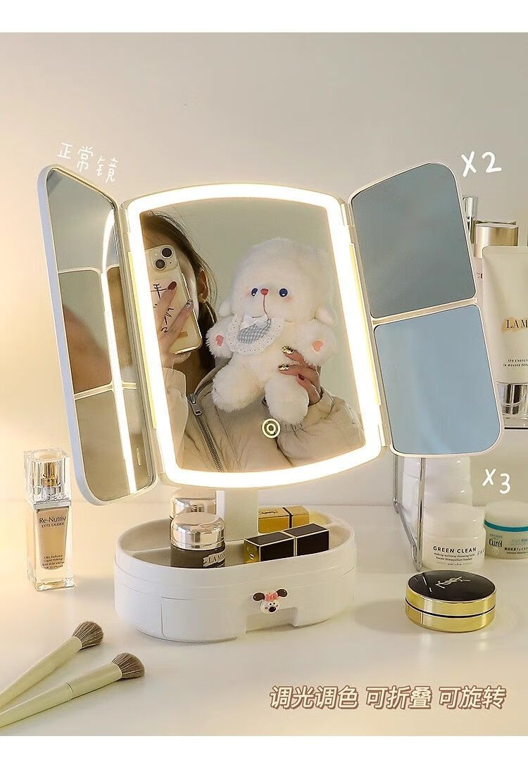 Cosmetic mirror with light desktop dresser mirror charging shell LED light vanity mirror 520 pink bear folding model three-color light stepless dimming丨comes with drawer